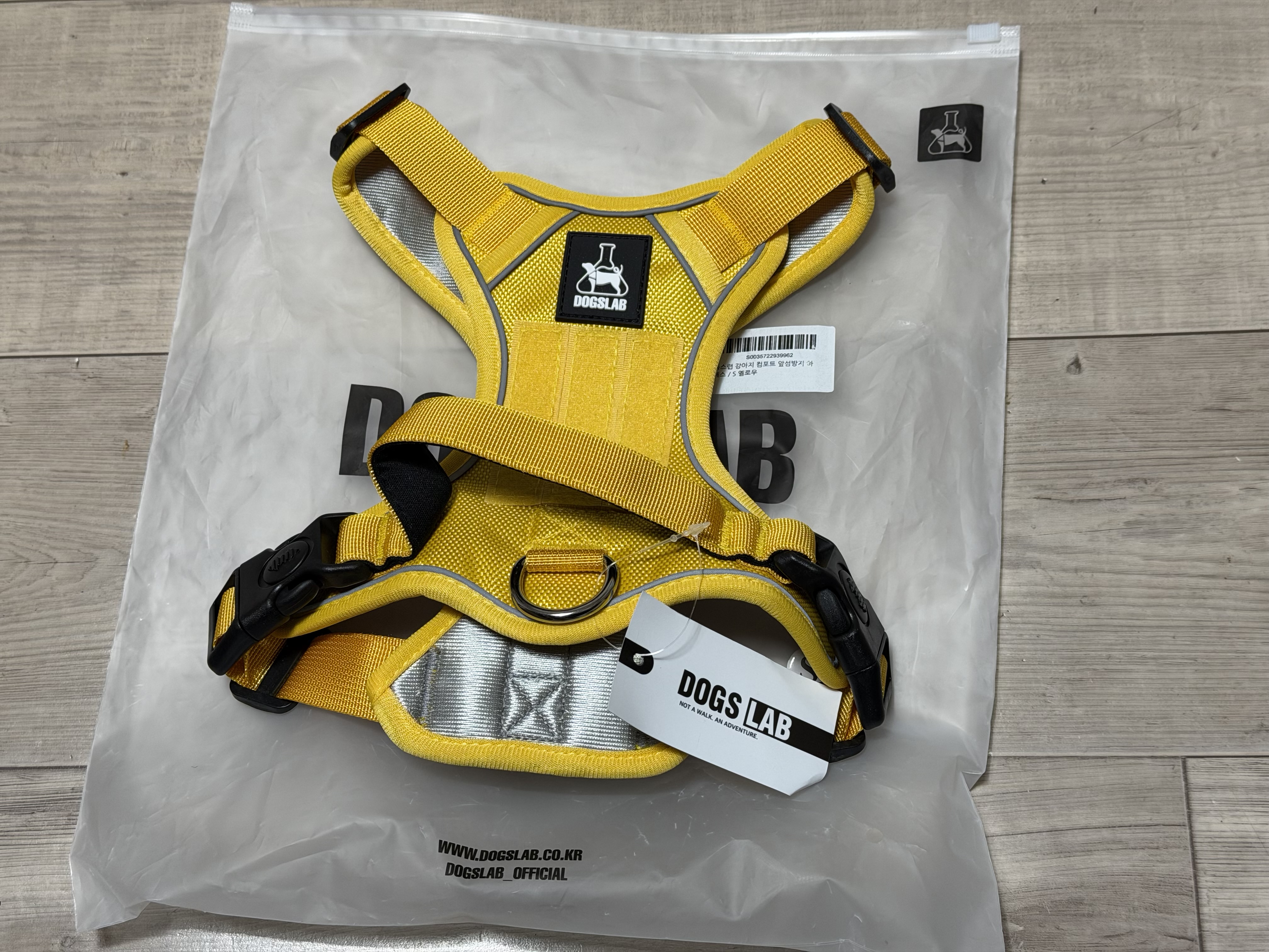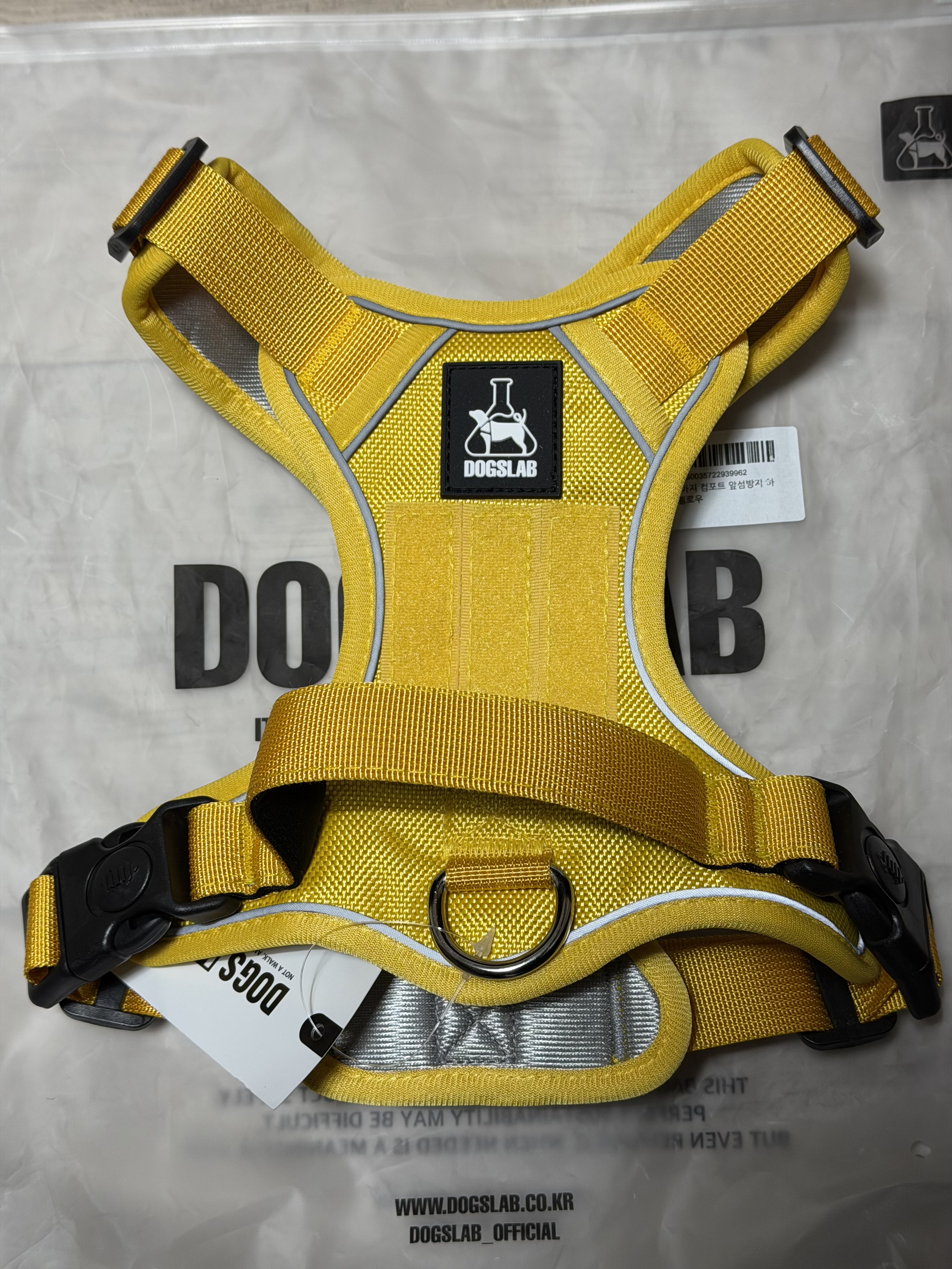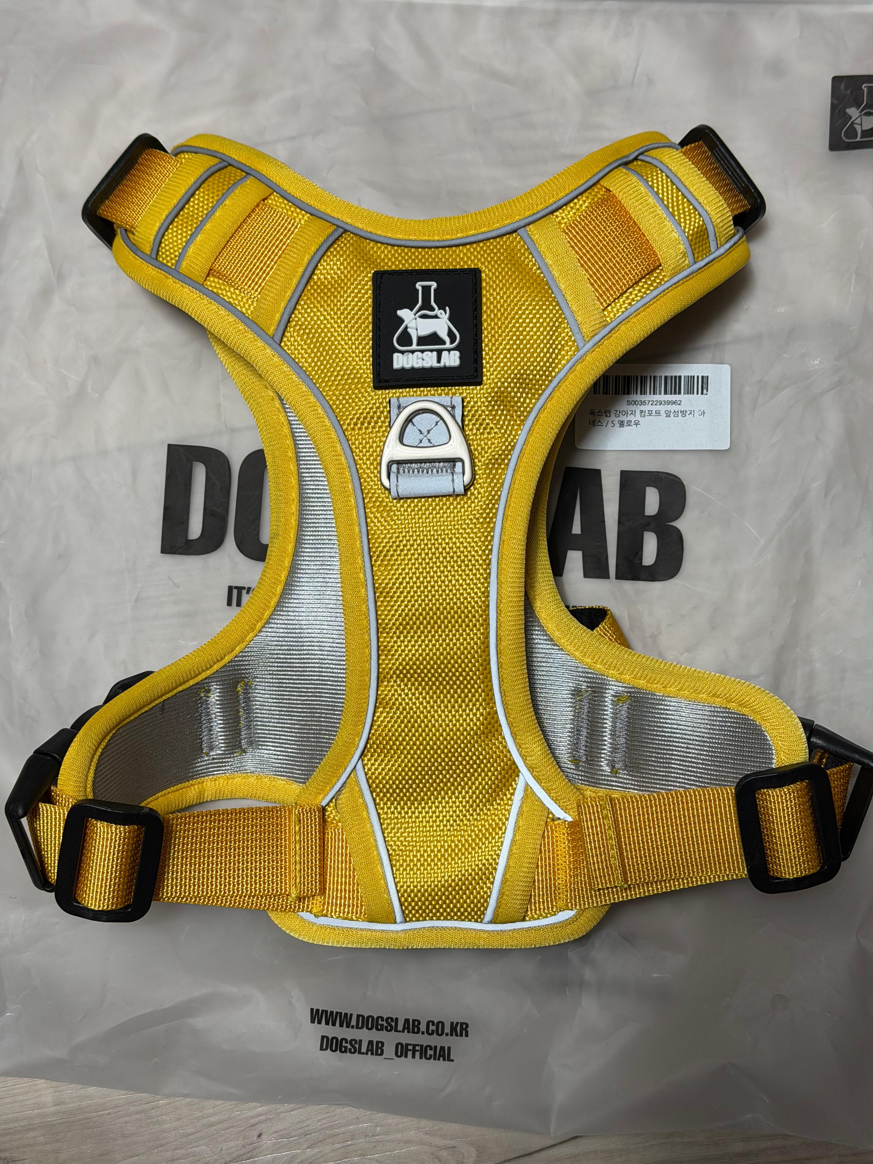 제품은 강아지들이 가장 좋아한다는 노란색으로 선택했고 언뜻 봐도 천의 재질과 두께감이 좋고 마감이 깔끔하게 된 것을 볼 수 있습니다. 2만 원이 채 되지 않는 가격에 비해서는 매우 만족스런 외관입니다. 그리고 천이 빛 반사 재질이어서 어두운 곳에서도 약간의 불빛 만으로 반려견의 위치를 확인할 수 있는 것 역시 장점입니다.