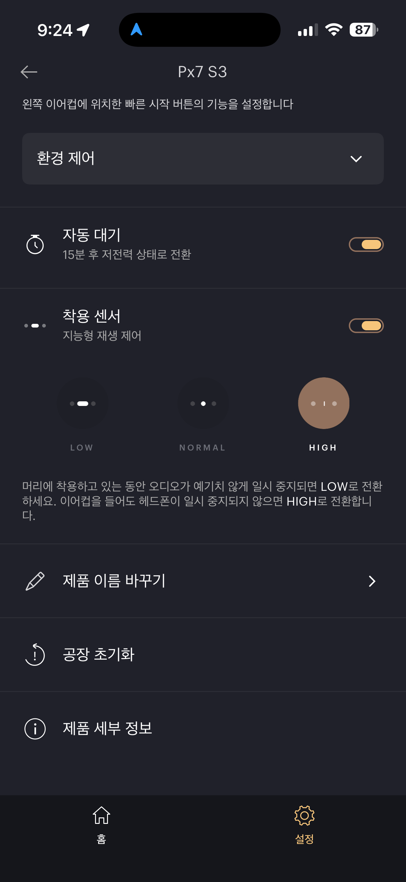 하지만 여전히 앱 상에서 건드릴 만한 게 거의 없는 건 동일합니다. 노이즈 캔슬링을 켜고 끄고 주변소리듣기로 바꾸는 것, 프리셋은 전혀 없는 5밴드 EQ, 미사용시 자동 전원 OFF 시간 설정, 착용센서 민감도 설정 정도가 고작입니다.