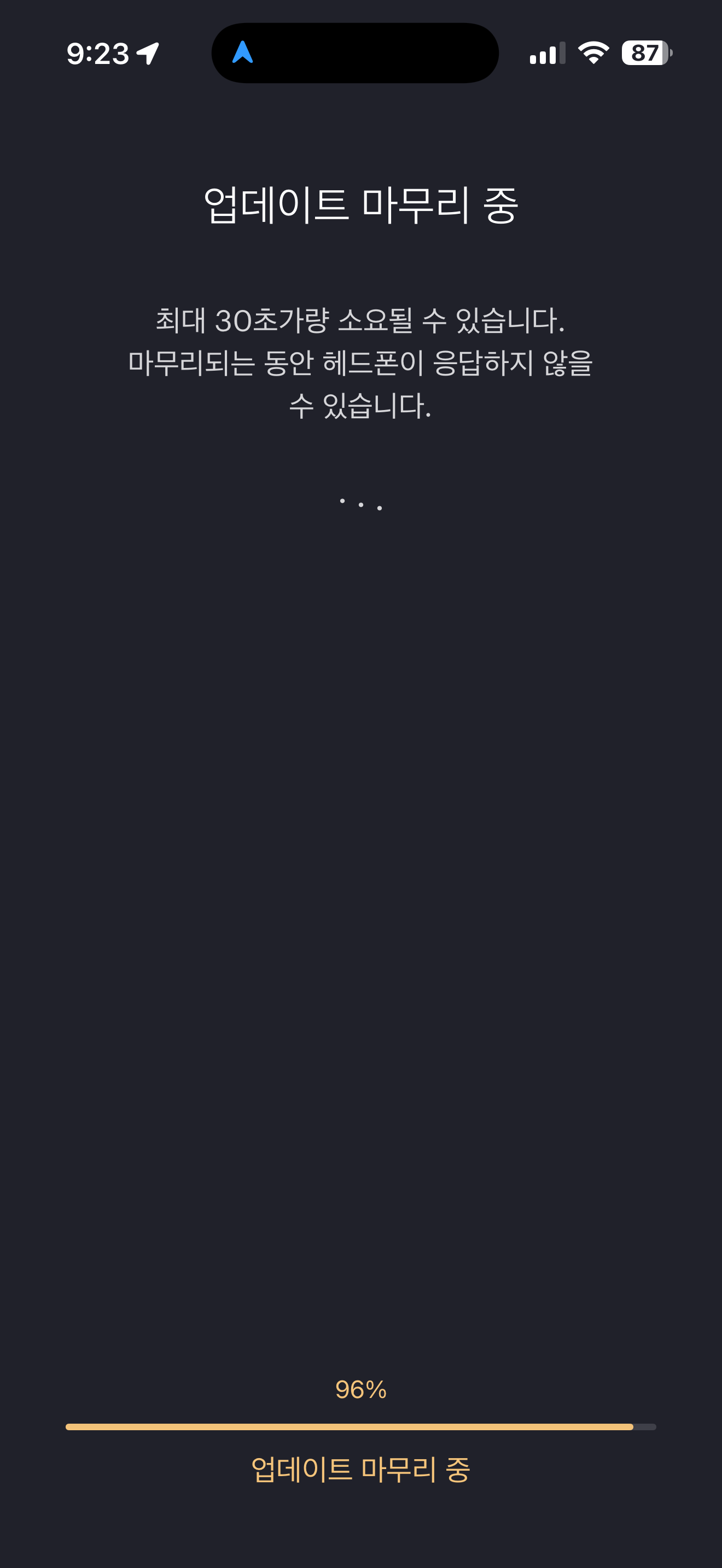 앱을 설치하면 헤드폰의 펌웨어 업데이트를 하라고 안내가 나옵니다.  업데이트 내용은 음질에 관련된 부분은 아닌 듯하고 버그 수정과 개선이라고 되어 있습니다. 펌웨어 업데이트 역시 순조롭게 진행이 됩니다. 앱의 안정성이 많이 좋아진 게 느껴지는 부분입니다.