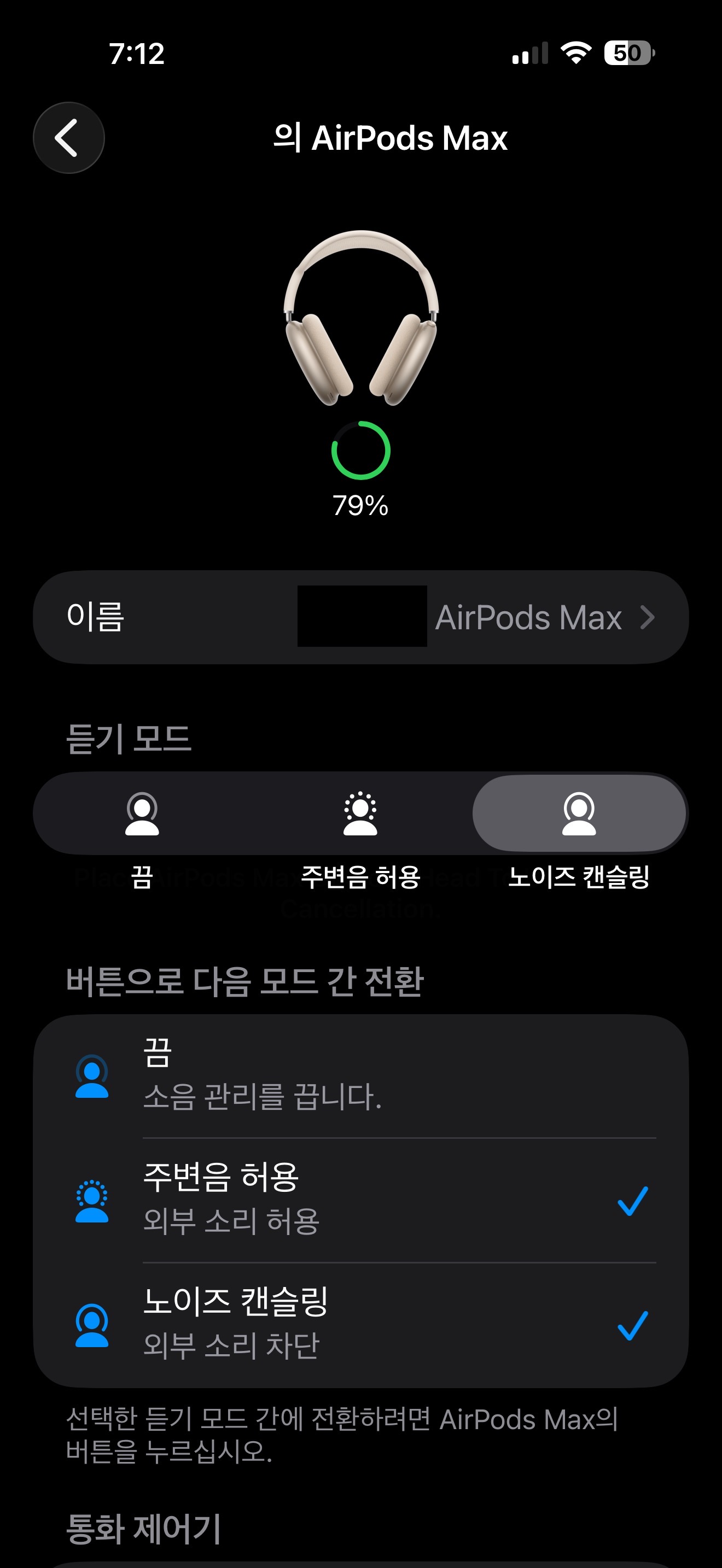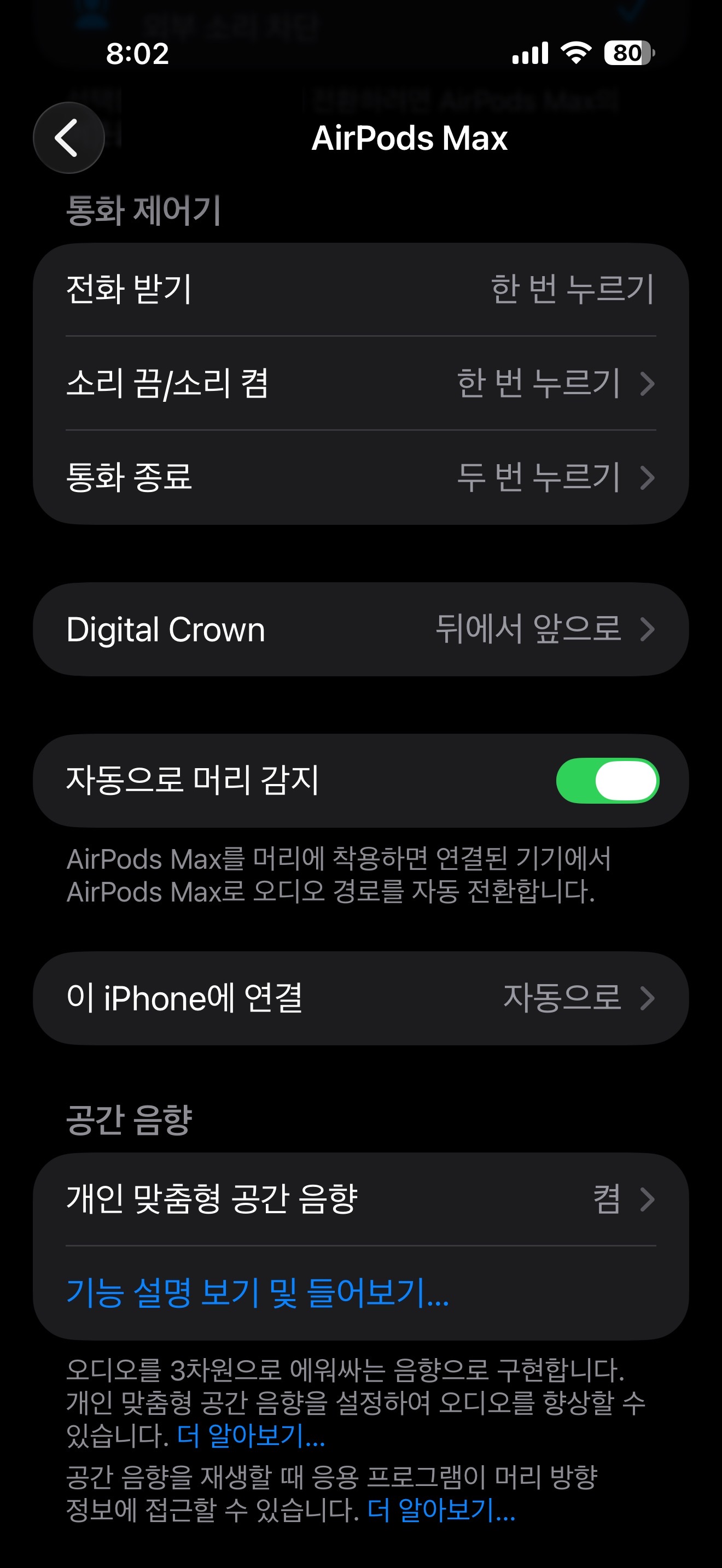애플의 음향기기는 애플 기기에서 별도의 앱을 설치하지 않아도 바로 사용이 가능합니다. 에어팟 맥스도 페어링을 하면 USB C로 무손실 오디오를 들을 수 있다는 정도의 내용만 나오고 끝입니다. 아이폰의 설정에 들어가면 에어팟 맥스의 기본 설정도 바꿀 수 있는데 디지털 크라운의 사용법이라든가 노이즈 캔슬링 변환 같은 기능이 있긴 하지만 그 외에 별도의 EQ 같은 건 없습니다.
