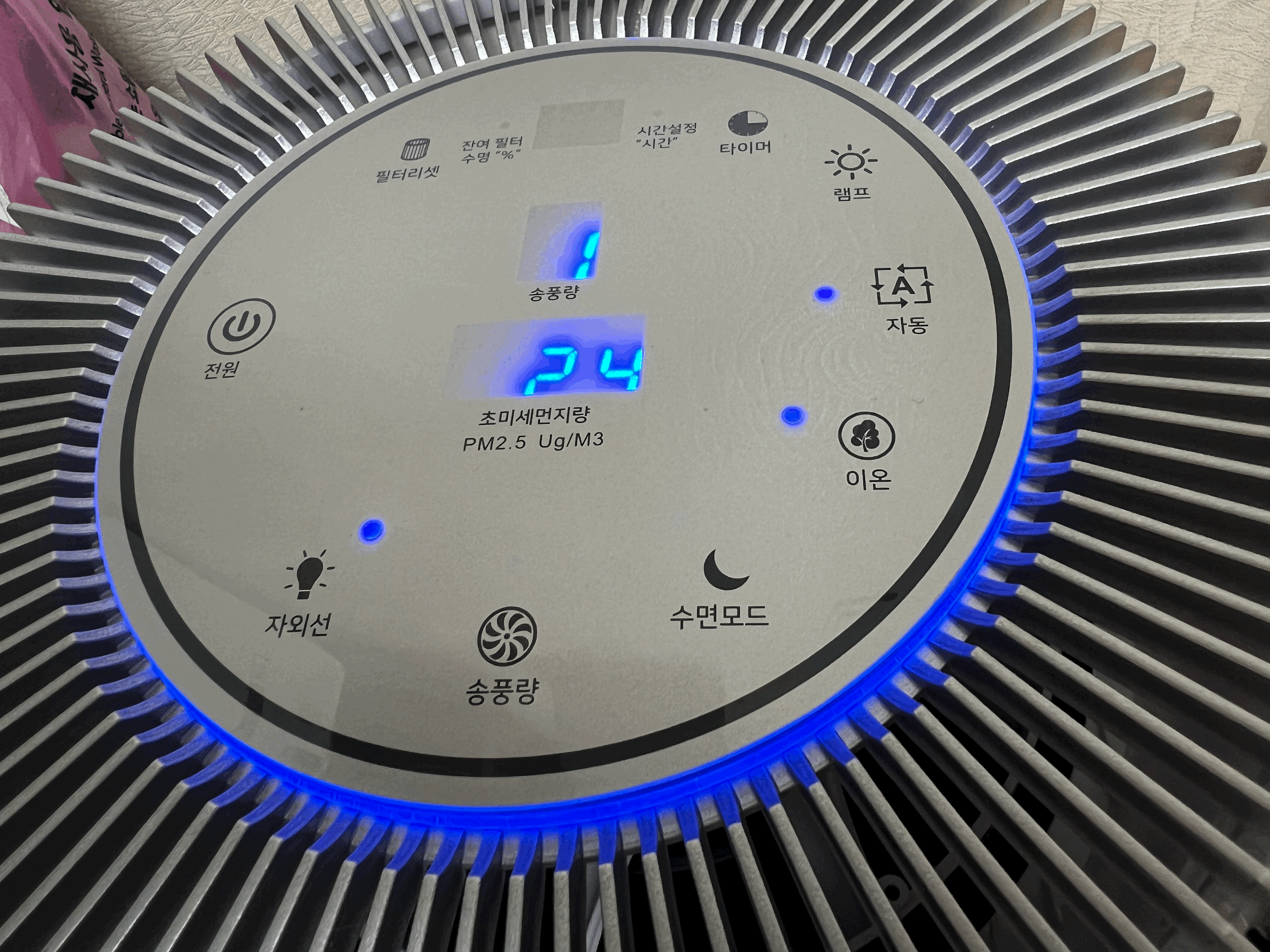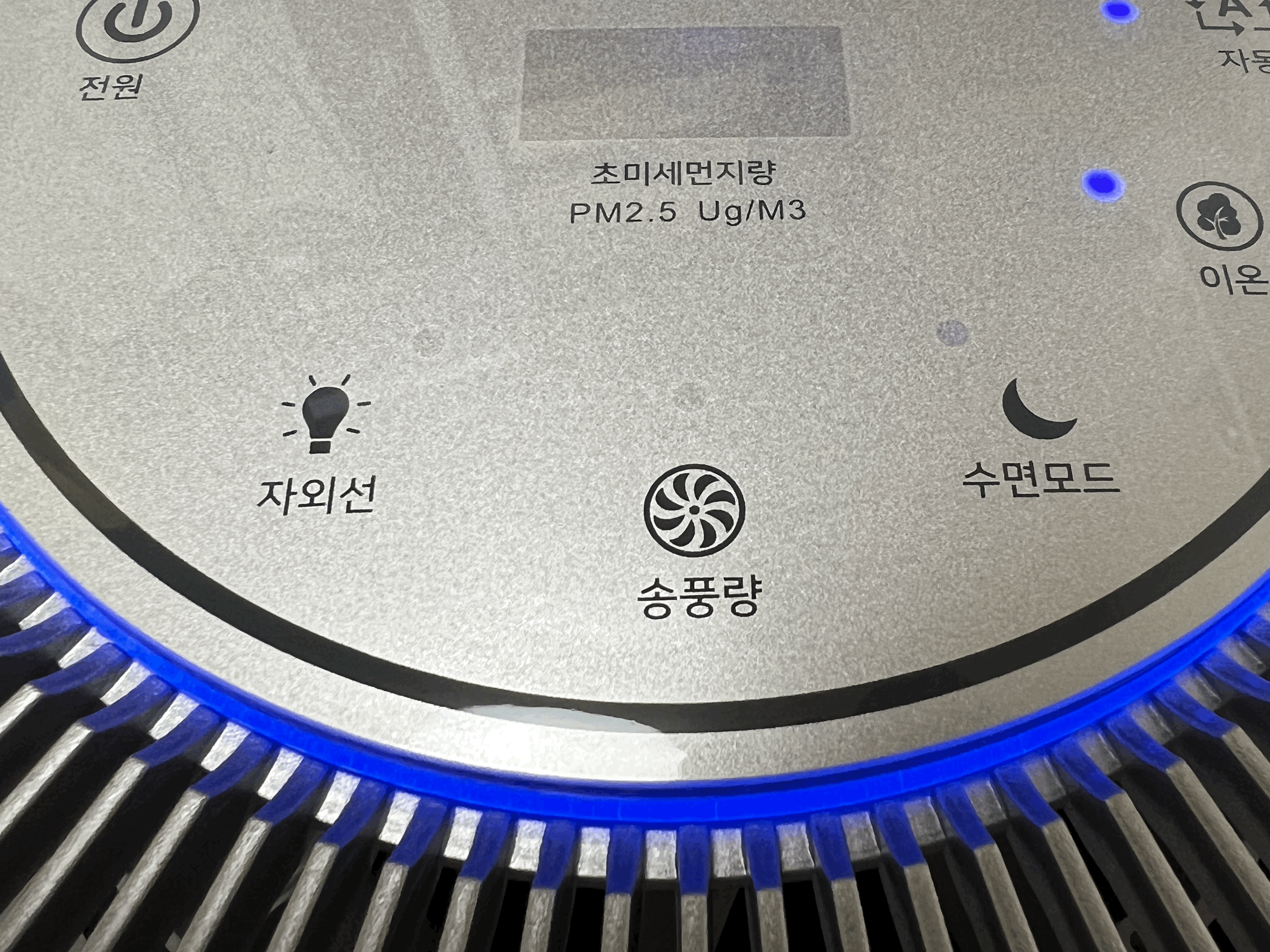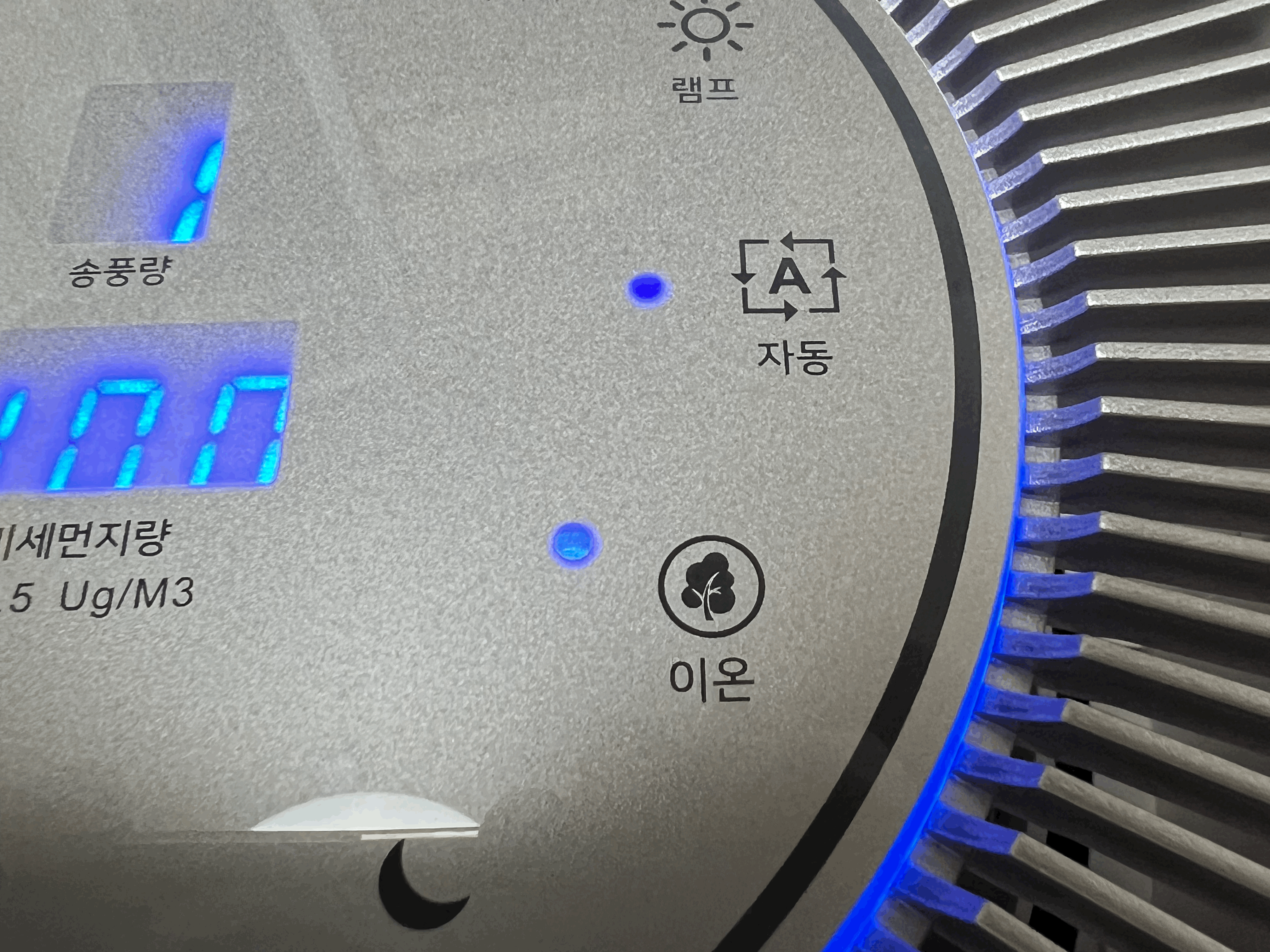 가장 왼쪽에 전원 버튼, 그리고 시계 방향으로 필터리셋, 잔여필터 수명, 시간설정 타이머, 램프, 자동, 이온, 수면모드, 송풍량, 자외선 등의 기능을 선택하고 조절할 수 있습니다. 저는 사용하면서 자동 버튼을 누르고 이온과 자외선 기능을 켜서 사용하고 있습니다. 자동으로 놓으면 굳이 송풍량을 조절할 필요는 없을 것 같더라고요.