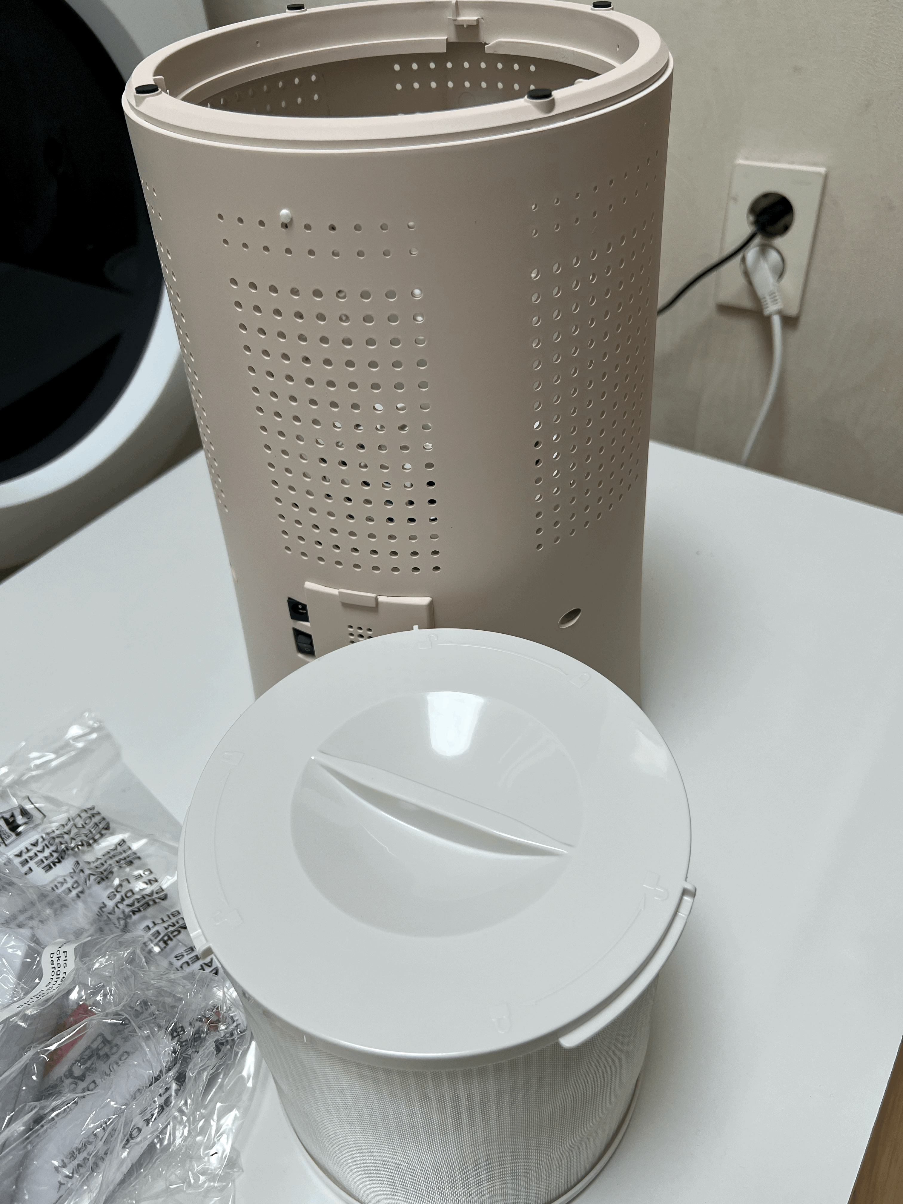 상자 안에는 다소 휑해 보이는 속을 가진 공기청정기 본체와 필터가 들어 있습니다. 필터는 본체를 뒤집어 아래에 끼우면 됩니다. 돌려서 끼우는 방식이라서 금방 결합할 수 있습니다. 편의성은 굉장히 좋습니다. 필터의 성능은 홈페이지나 쇼핑몰에서도 찾기가 쉽지 않습니다. 분명 헤파필터이긴 한데, 헤파필터가 E11~12의 세미 헤파 등급과 H13~14의 헤파등급으로 나뉘면서 각 등급별로 성능 차이가 분명히 존재하기 때문에 헤파필터의 등급으르 알아 보지 못하게 하는 건 분명 문제가 있어 보입니다.