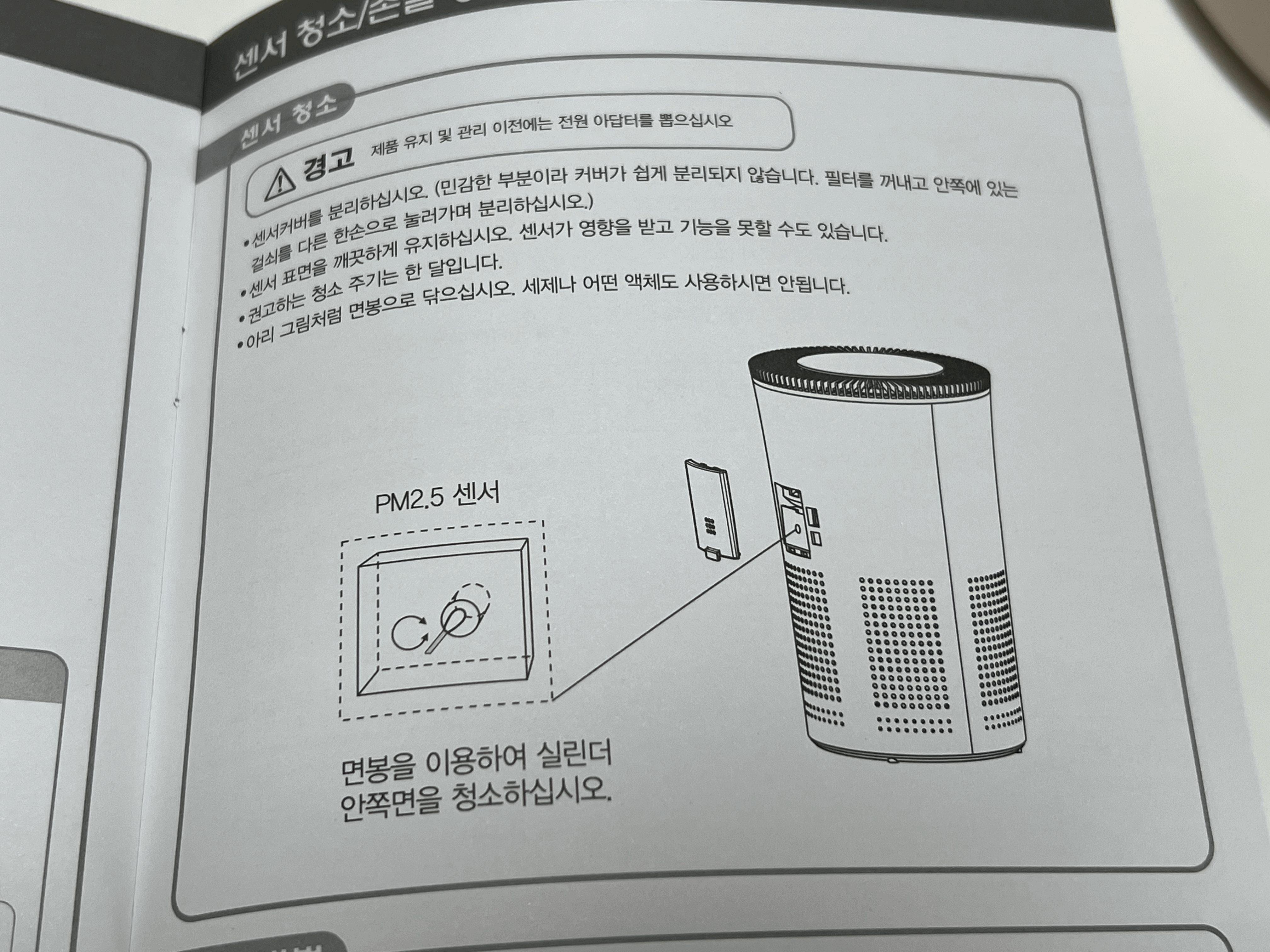 제품의 제조는 외국에서 했지만 그래도 신일전자는 우리나라 제품이 맞는가 봅니다. 한글 설명서가 제품 가격에 비해서는 꽤나 자세하게 설명이 되어 있습니다. 글씨보다는 그림이 많아서 이해하기가 쉽습니다. 특히 저렇게 미세먼지 측정 센서를 면봉을 이용해서 닦아야 한다는 내용이 포함되어 있어서 좋았습니다. 외국산 제품, 그 중에서도 한글 설명서가 없는 제품은 아무래도 온전히 이해하기는 쉽지 않잖아요. 이건 좀 마음에 들었습니다.