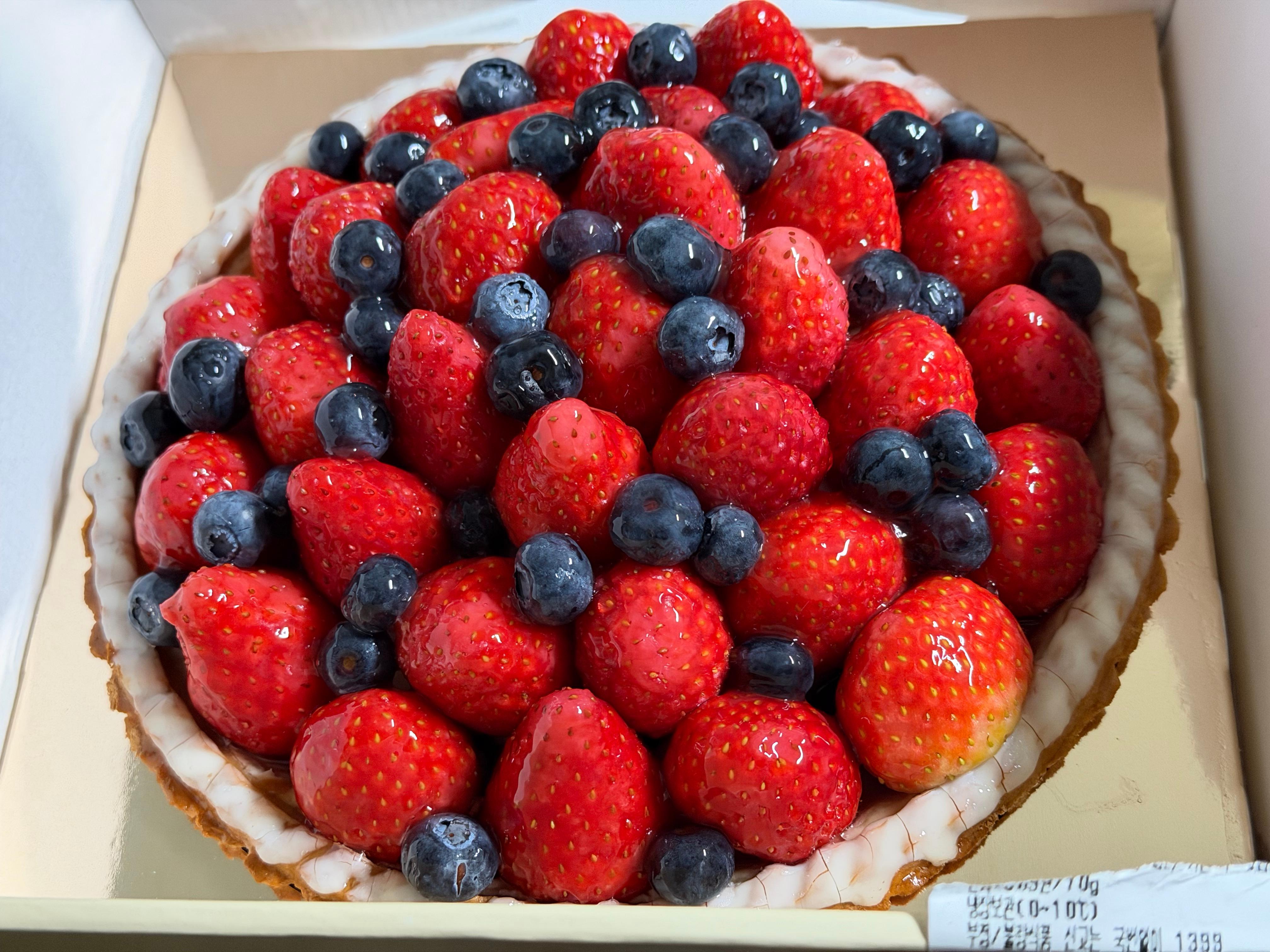 제품은 타르트가 잘 보이는 투명 플라스틱이 섞인 종이 상자로 포장이 되어 있습니다. 딸기가 수북하게 쌓았고, 그 사이사이 혹여나 휑한 빈틈이 보일까 염려되어 블루베리를 얹었습니다. 그래서 겉으로만 봤을 때는 이게 딸기가 1층인지, 2층인지 아니면 그냥 과일가게 아줌마가 빨간색 플라스틱 바구니에 담았던 걸 그대로 엎어서 모양을 잡은 건지 알 수 없게끔 했습니다.