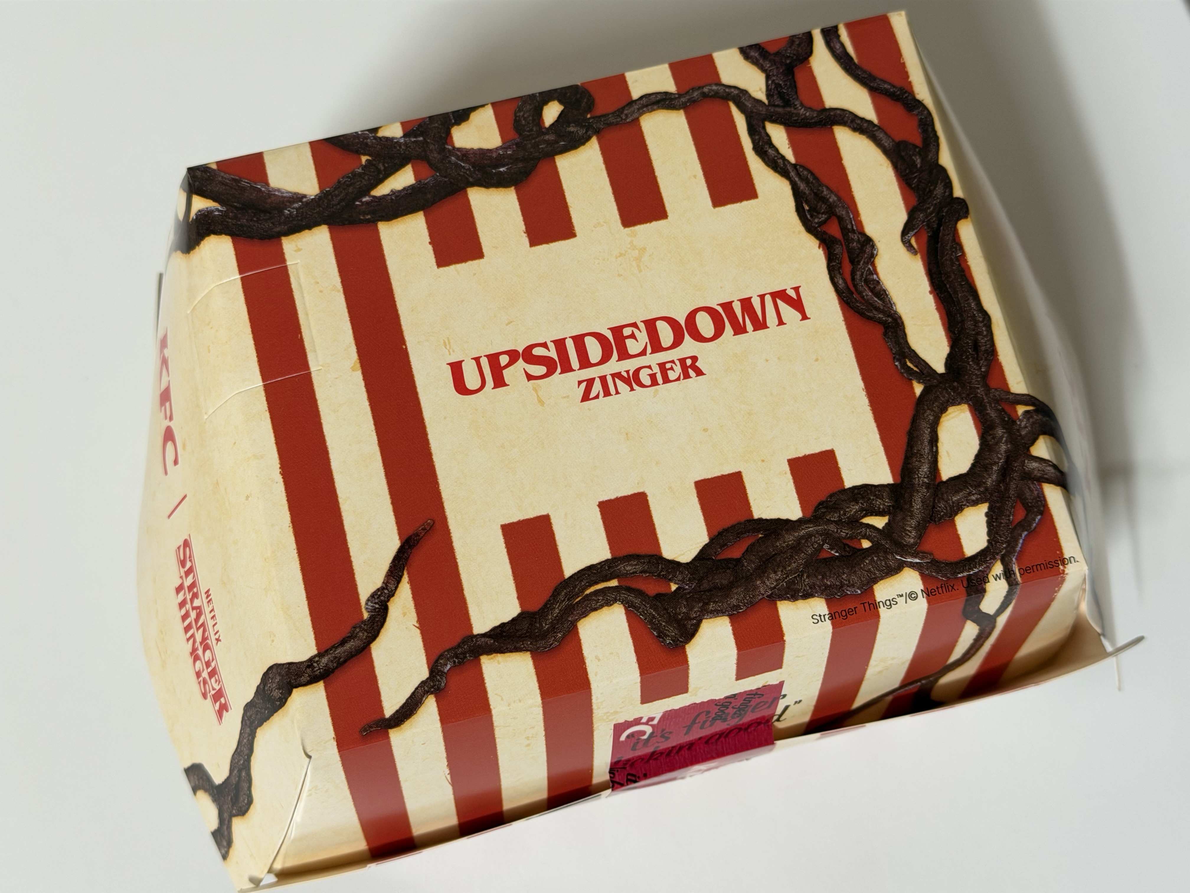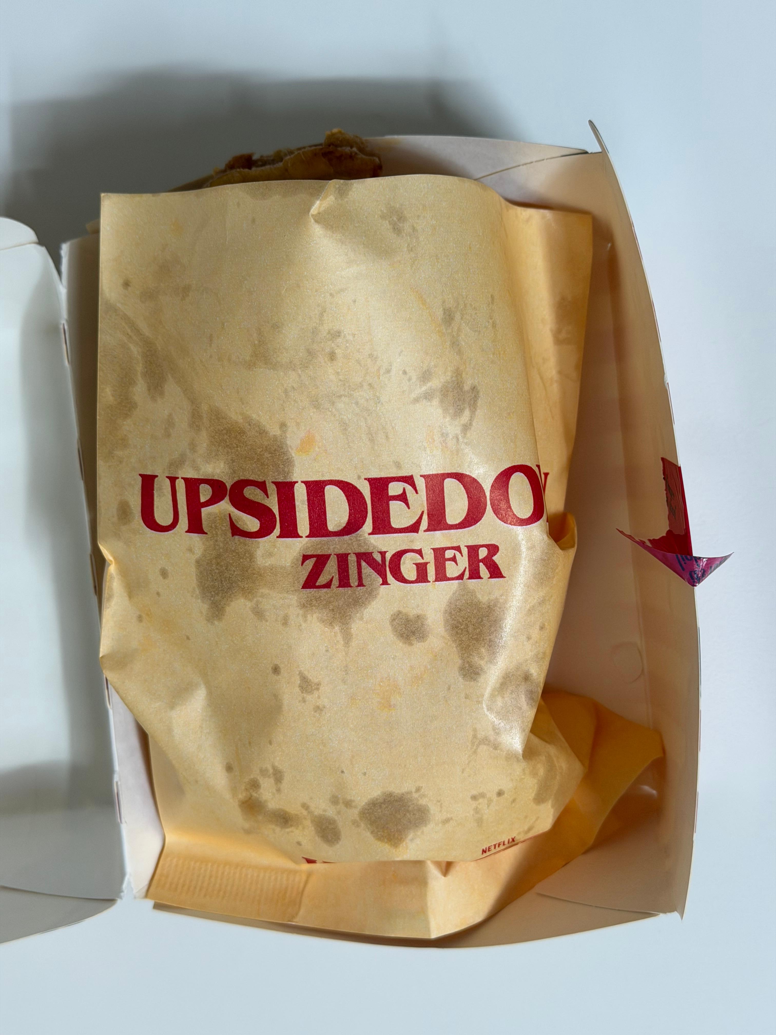 업사이드다운 징거는 포장부터 뭔가 이상합니다. 식욕을 돋울 포장지에 나무 뿌리 같은 게 뒤엉켜 있습니다. 일단 포장지부터 심상치가 않습니다.