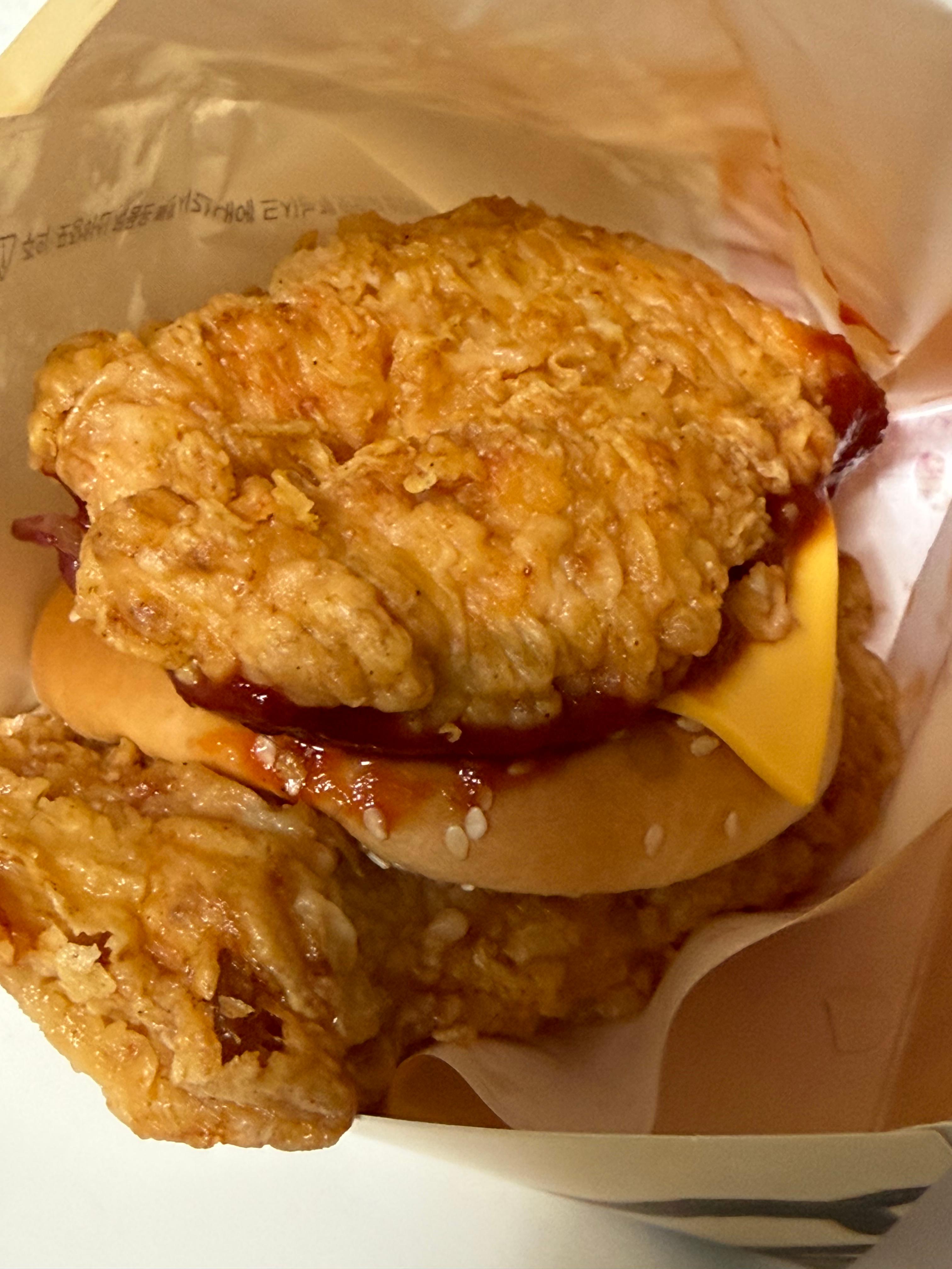 부재료인 닭가슴살 튀김이 번의 위치에, 번 한 쪽(위 아래 랜덤)이 가운데 들어가 있습니다. 패티 2장이 번의 역할을 하는 것입니다. 햄버거의 정의를 새로 써야겠습니다.