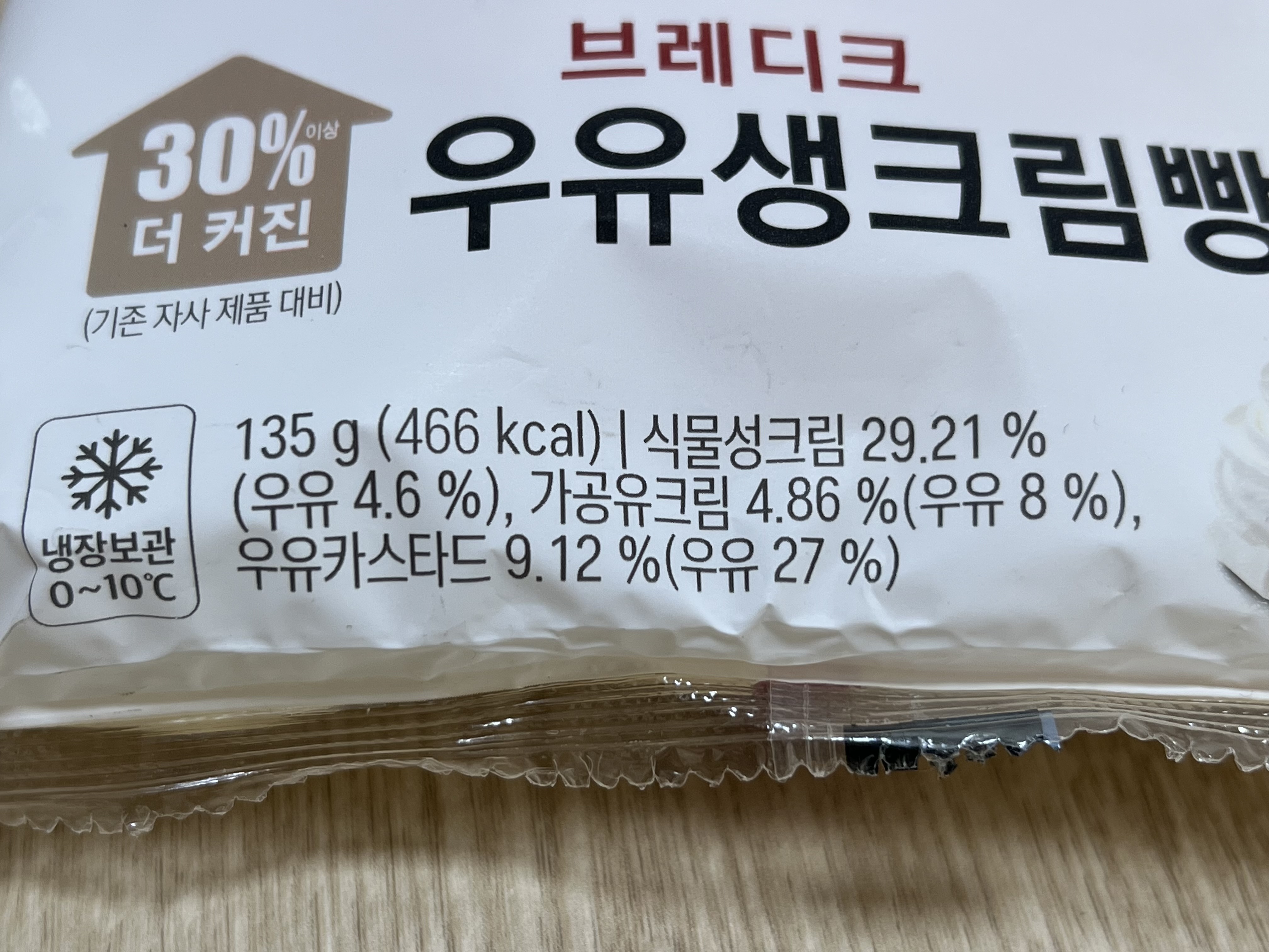 빵의 포장지는 이렇습니다. 연세우유 생크림빵은 흰색 포장지에 연세대학교 마크와 빵 단면도가 '연출된 사진입니다' 라는 말과 함께 비교적 깔끔한 디자인으로 되어 있고 브레디크 생크림빵은 같은 흰색 배경이긴 하지만 상단에 빵의 연출된 이미지 사진이 별도의 배경과 함께 위치하고 있고 중간에 브레디크 라는 브랜드가 위아래를 구분짓고 있습니다. 전형적이긴 하지만 디자인 자체만으로는 연세우유 생크림빵 쪽이 저는 좋아 보이긴 합니다. 브레디크 우유생크림빵은 왠지 조잡해 보인달까요. 특히 30% 더 커진 이라는 화살표가 저에게는 '그럼 그 전에는 얼마나 작았다는 거야?' 라는 생각을 자연스럽게 가지게 하더라고요. 양이 늘었다고 하는 건 분명 좋은 일이지만 그게 요즘 같은 고물가 시기에는 자의에 의한 것이 절대 아님을 알기 때문에 더 좋게 느껴지지 않았나 봅니다. 저 문구는 빼는 게 여러 모로 좋을 것 같습니다.