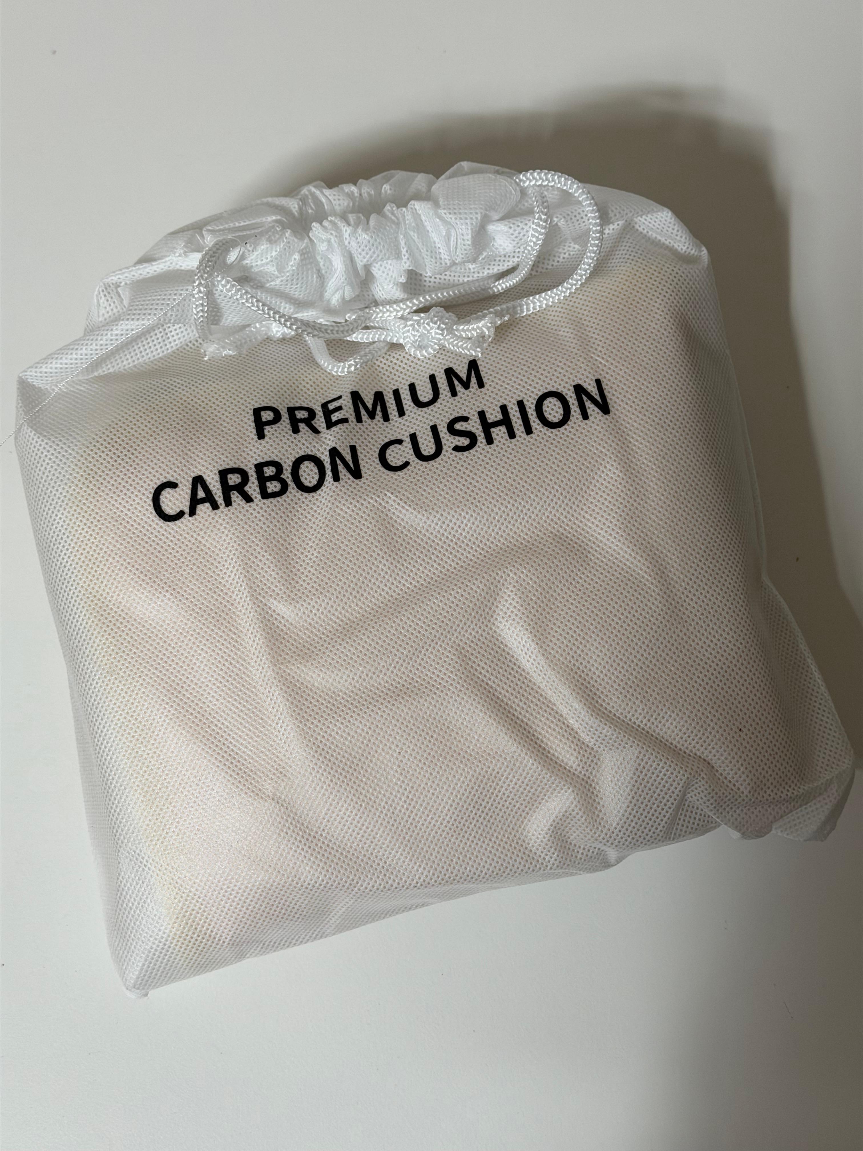 종이상자에 담겨 있는 넥스코의 DC 포근 탄소 방석은 일단 제품명부터 통일을 해야 할 것 같습니다. 제품명은 'DC 포근 탄소 방석'이라고 되어 있지만, 정작 제품 상자에는 '프리미엄 DC 탄소 방석' 이라고 되어 있고, 그 안에 있는 파우칭에는 'Premium Carbon Cushion'이라고 되어 있습니다. 심지어 네이버 스토어에는