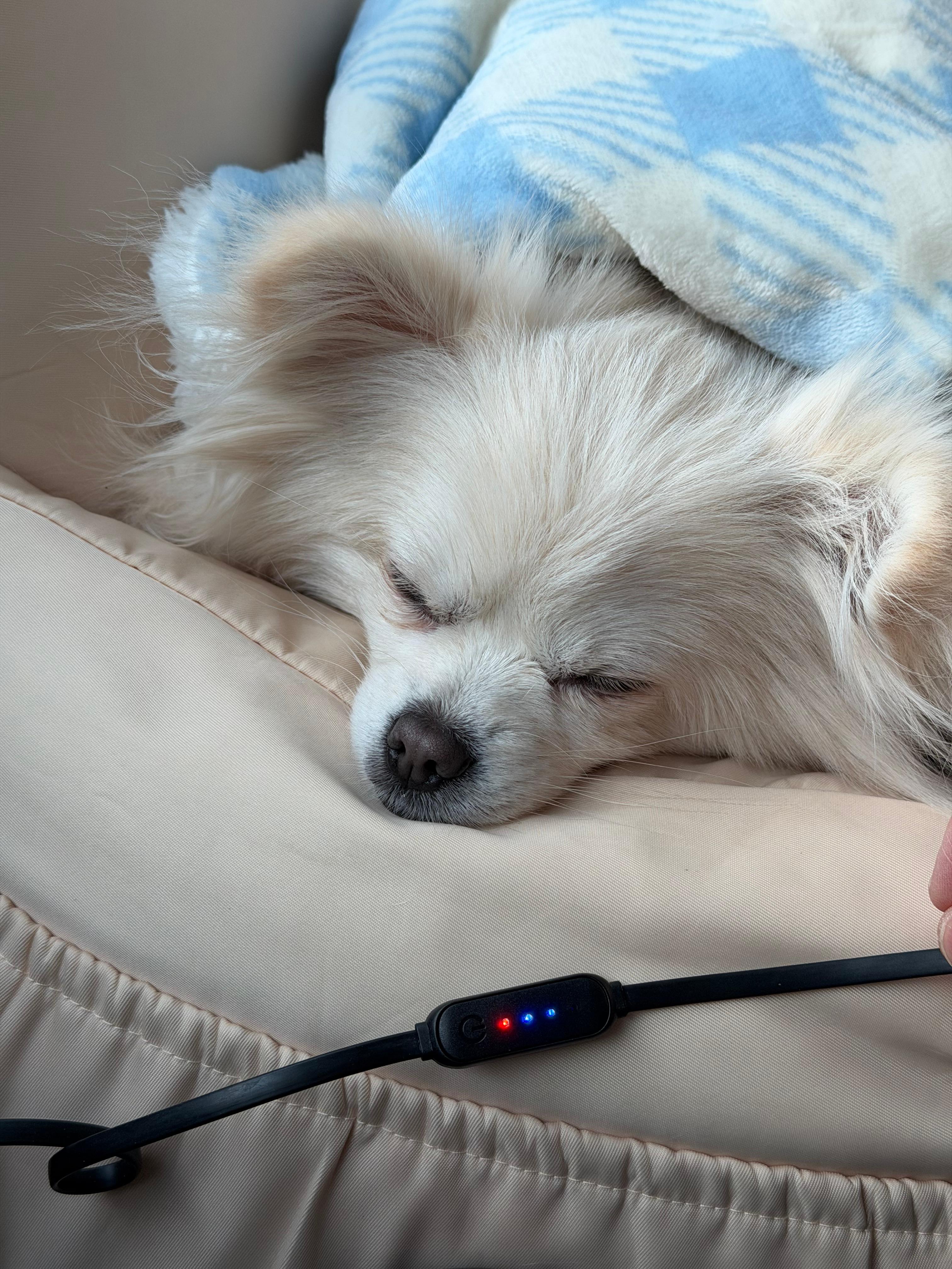 2단만 틀어도 따뜻해서인지 금방 잠에 빠집니다. 추운 겨울 차가운 방석에서 밥풀이 체온으로 방석이 따뜻해질 때까지 기다려야 하나 하고 걱정이 많았는데 넥스코 DC 포근 탄소 방석을 차에 두고부터는 영하 10도를 넘나드는 추위 속에서도 밥풀이는 노곤노곤하게 잠을 잘 수 있게 됐습니다.