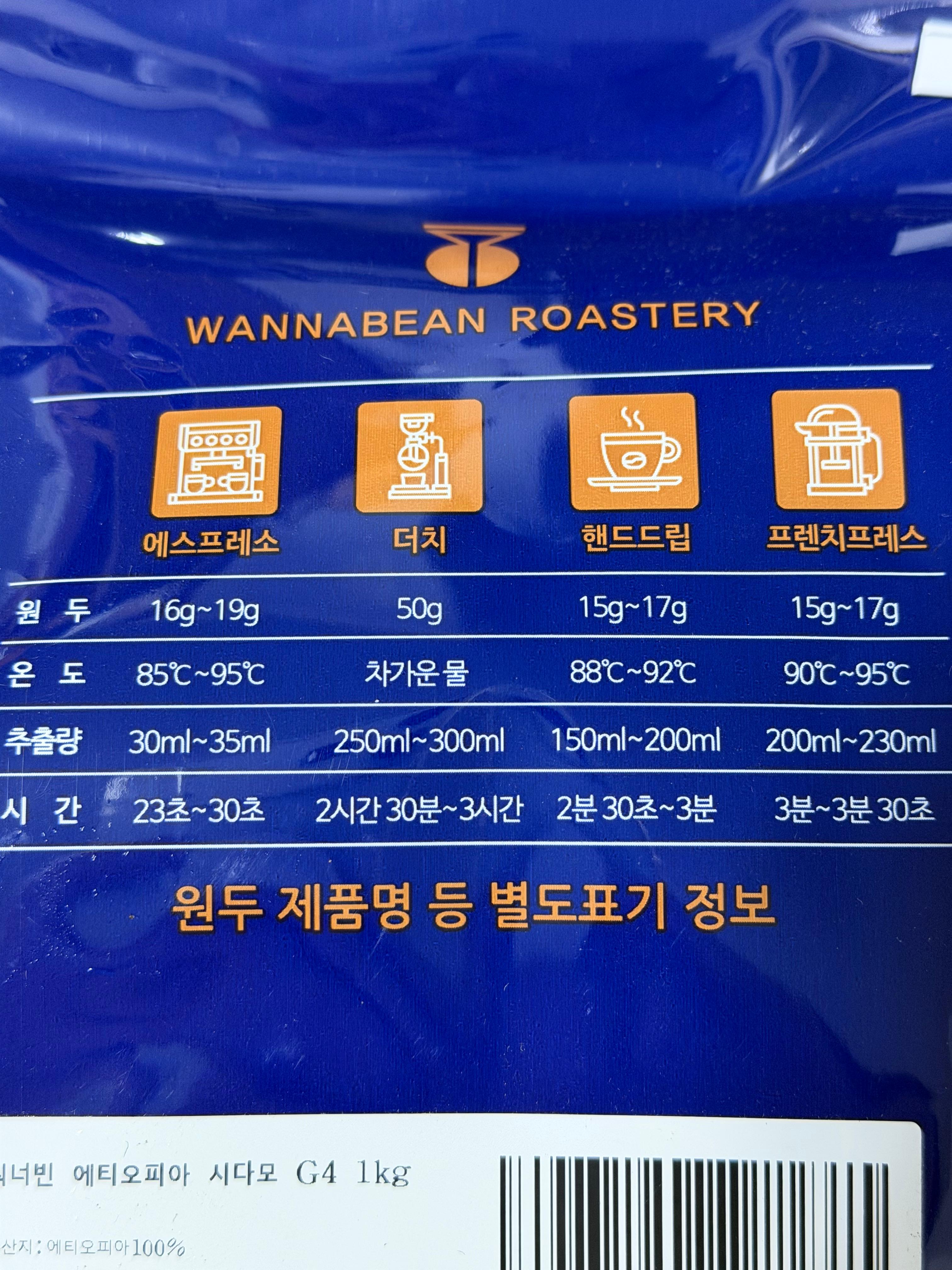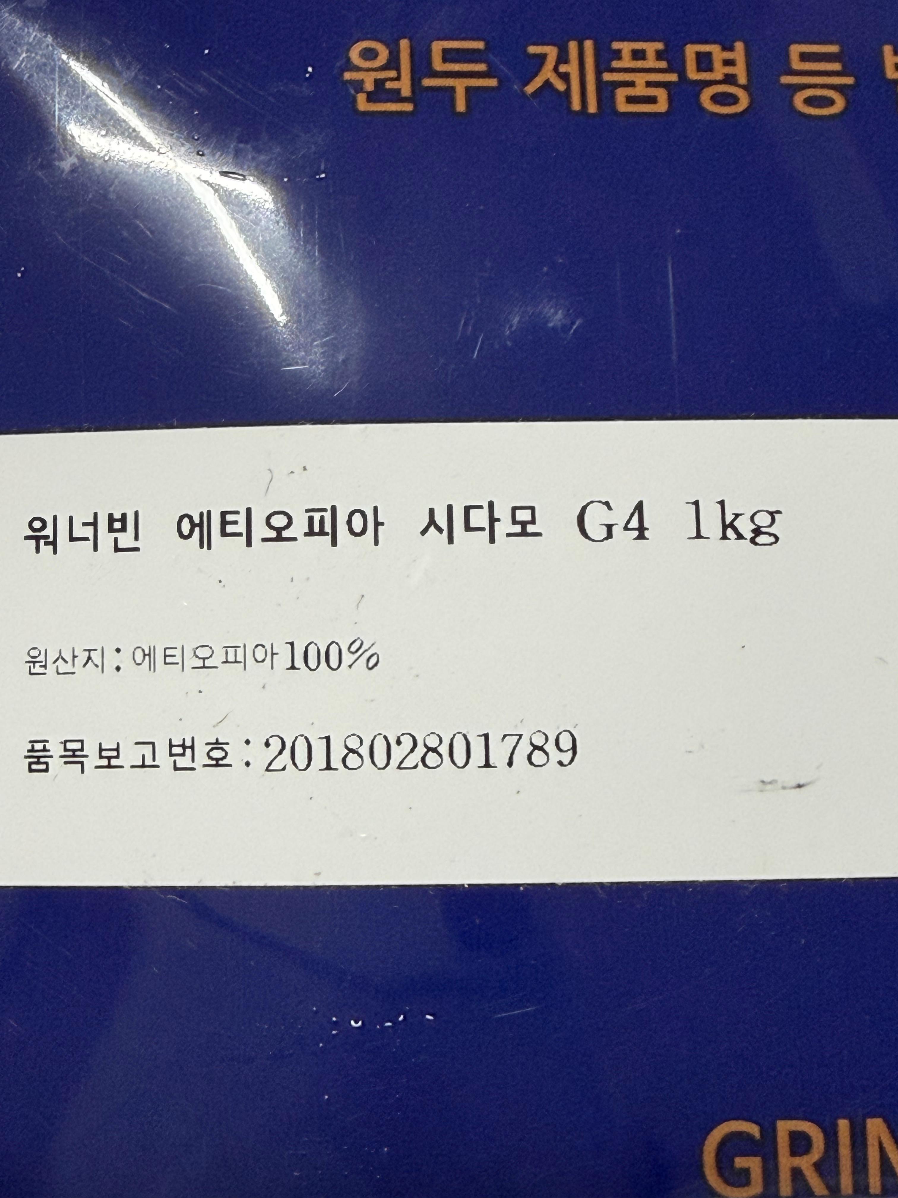 워너빈 에티오피아 시다모 G4는 파란색 비닐 포장이 되어 있습니다. 상단에는 접어서 보관할 수 있는 철끈이 달려 있습니다. 제품 포장 전면에는 뭐라고 쏼라쏼라 영어가 써 있는데 좋은 말이겠죠. 굳이 해석은 하지 않았습니다. 제품 겉면에 나쁜 말을 써 놓진 않았을 테니까요.