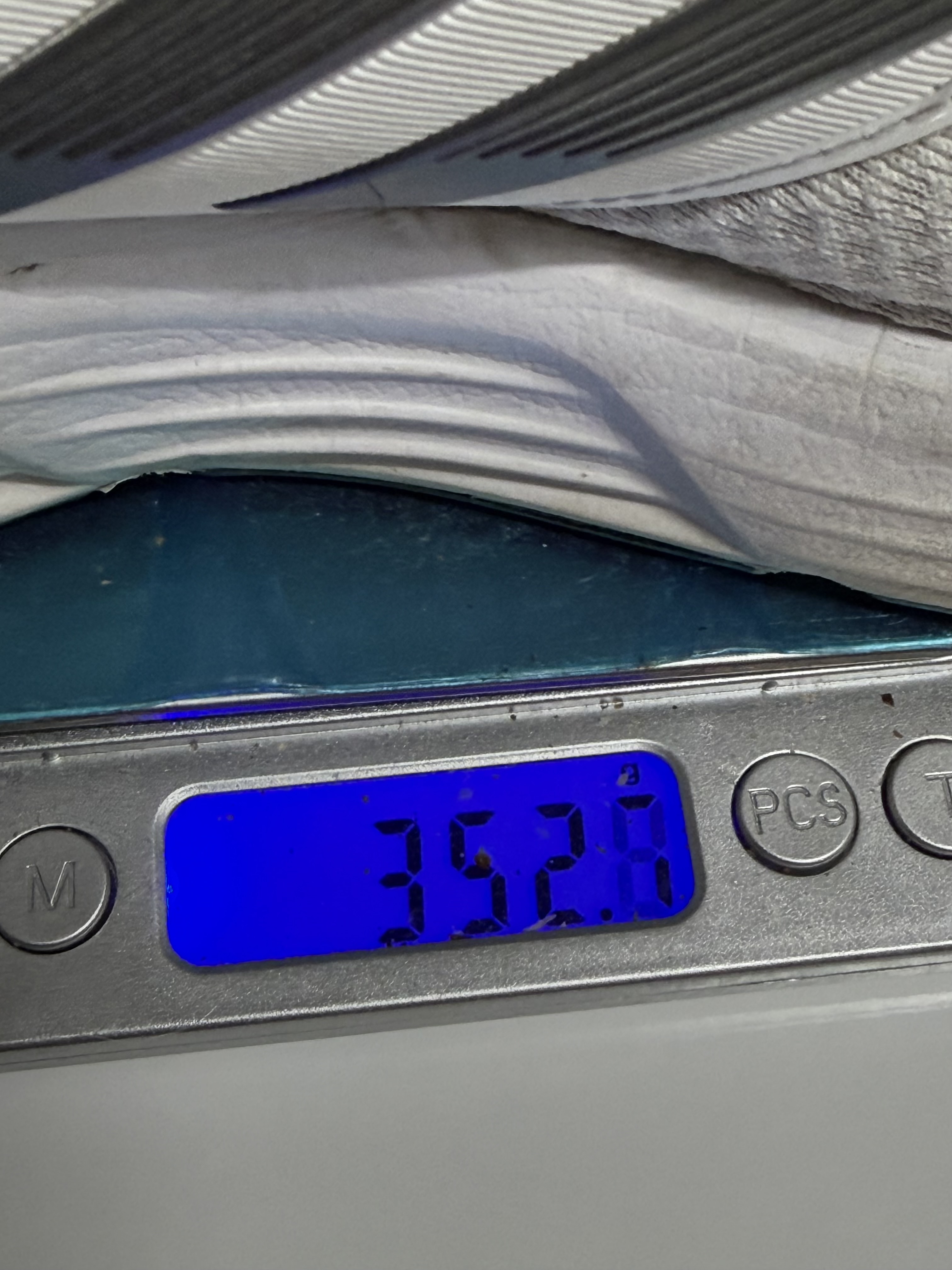 신발을 한참 신다가 정말로 무게가 가벼운가 싶어서 저울로 재 봤습니다. 왼쪽 296.9g이 뉴발란스 Fresh Form 1880이고, 오른쪽 352.7g이 전에 신던 아디다스의 워킹화입니다. 한쪽에 50g이 별 거 아닌 거 같아도 이게 오래 걷다 보면 확실히 발과 다리가 느끼는 무게감이 다릅니다.