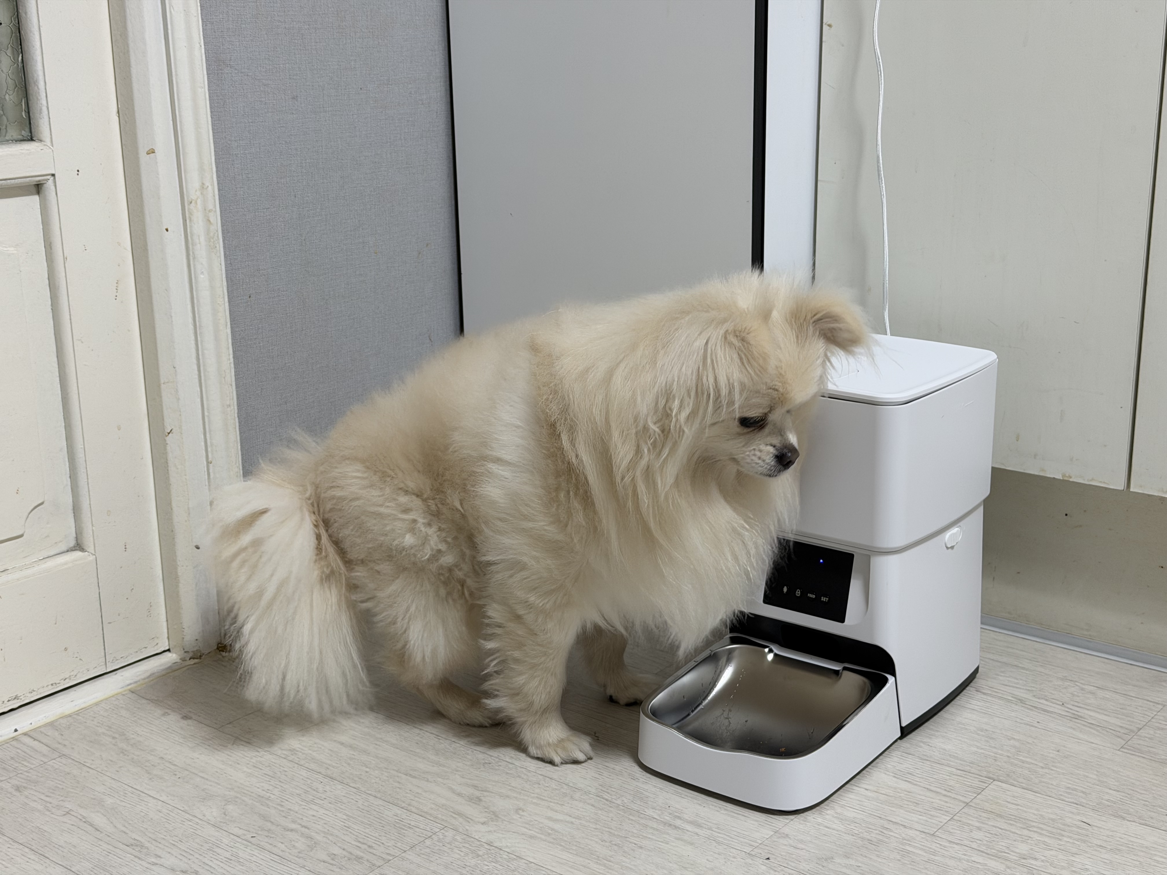 제품 전면에 있는 버튼을 이용하면 자동급식 때 자동으로 재생되는 집사의 목소리도 녹음할 수 있습니다. 반려동물에게 식사 시간을 알려 주는 좋은 신호로 사용할 수 있을 듯합니다.