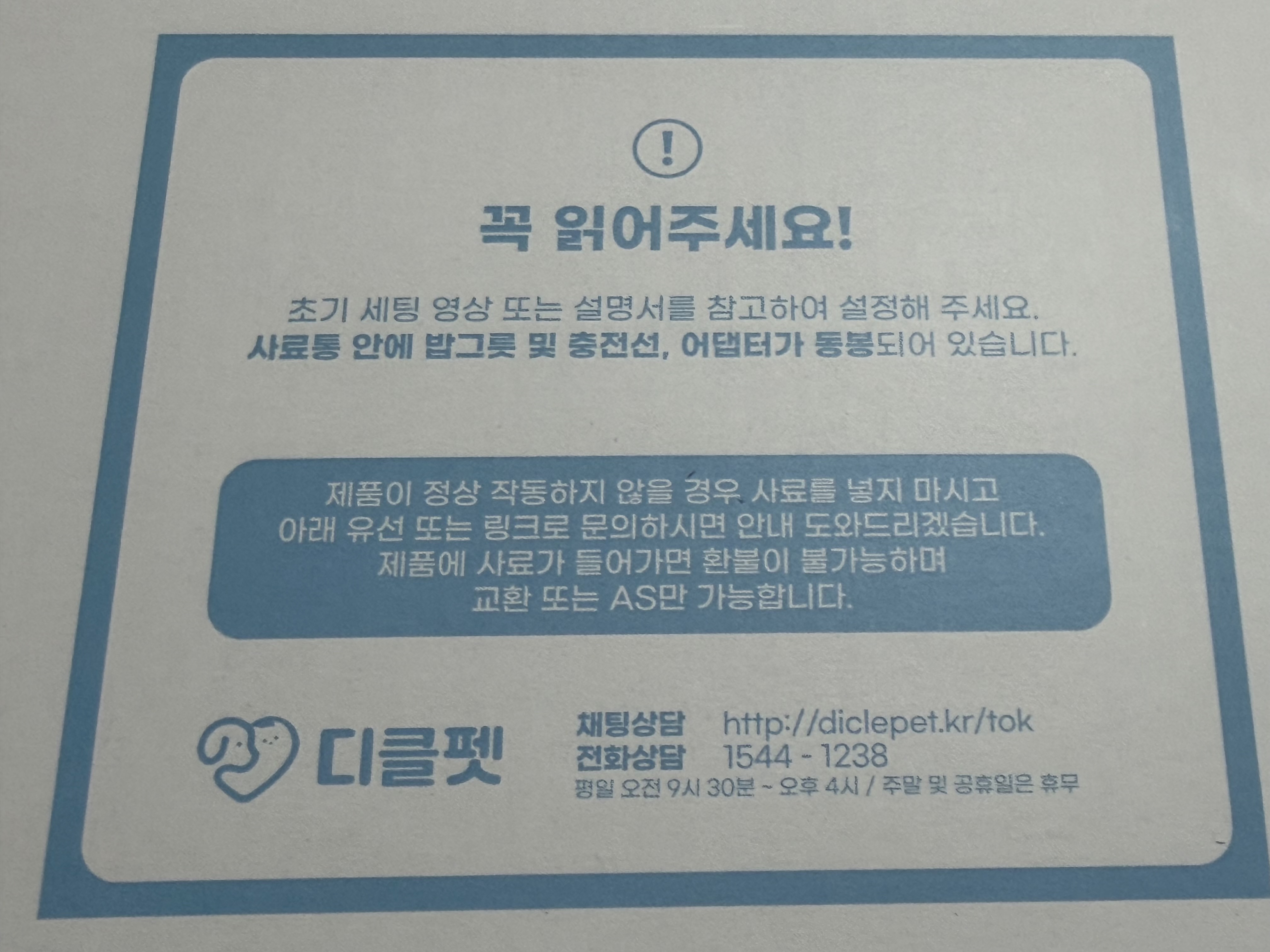 디클펫 AT-210 제품은 이중 종이 상자로 포장이 되어 있습니다. 종이 상자가 두 겹이면 아무래도 택배 배송 중에 한 군데가 콕 찍히지 않는 이상 상자와 제품의 안전성에 도움을 주는 게 분명합니다. 택배로 제품을 받아 상자를 보니 역시나 깨끗한 상태로 도착했습니다. 상자 안에는 리뷰 이벤트를 한다는 종이가 들어 있습니다. 그리고 제품에 대한 이런 저런 설명도 함께 들어 있습니다. 제품에 대해 꽤나 신경 쓴 것을 볼 수 있습니다.