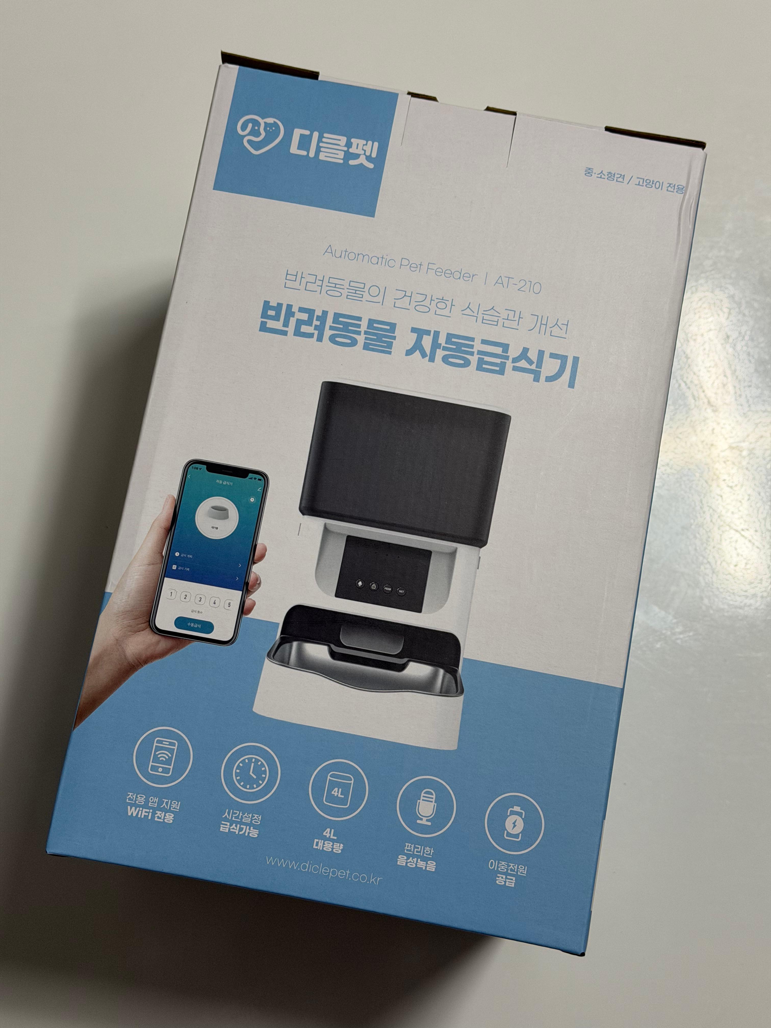 디클펫 AT-210는 저렴한 가격에 와이파이로 자동급식을 최대 10회까지 예약해 놓을 수 있는 편리한 자동 급식기입니다. 기기 자체에 버튼이 있어 수동으로도 급식을 할 수 있을 뿐 아니라 스마트폰에서 앱을 통해서도 수동급식과 자동급식을 할 수 있어 편리함을 더해 줍니다.  또한 급식 때 집사의 목소리로 밥 먹는 신호를 줄 수 있게 녹음 기능도 지원하는 것은 별 것 아닌 것 같지만 꽤나 의미가 있는 기능입니다.  식기 부분이 스테인레스 재질로 되어 있는 것도 위생에 도움이 되고요.
