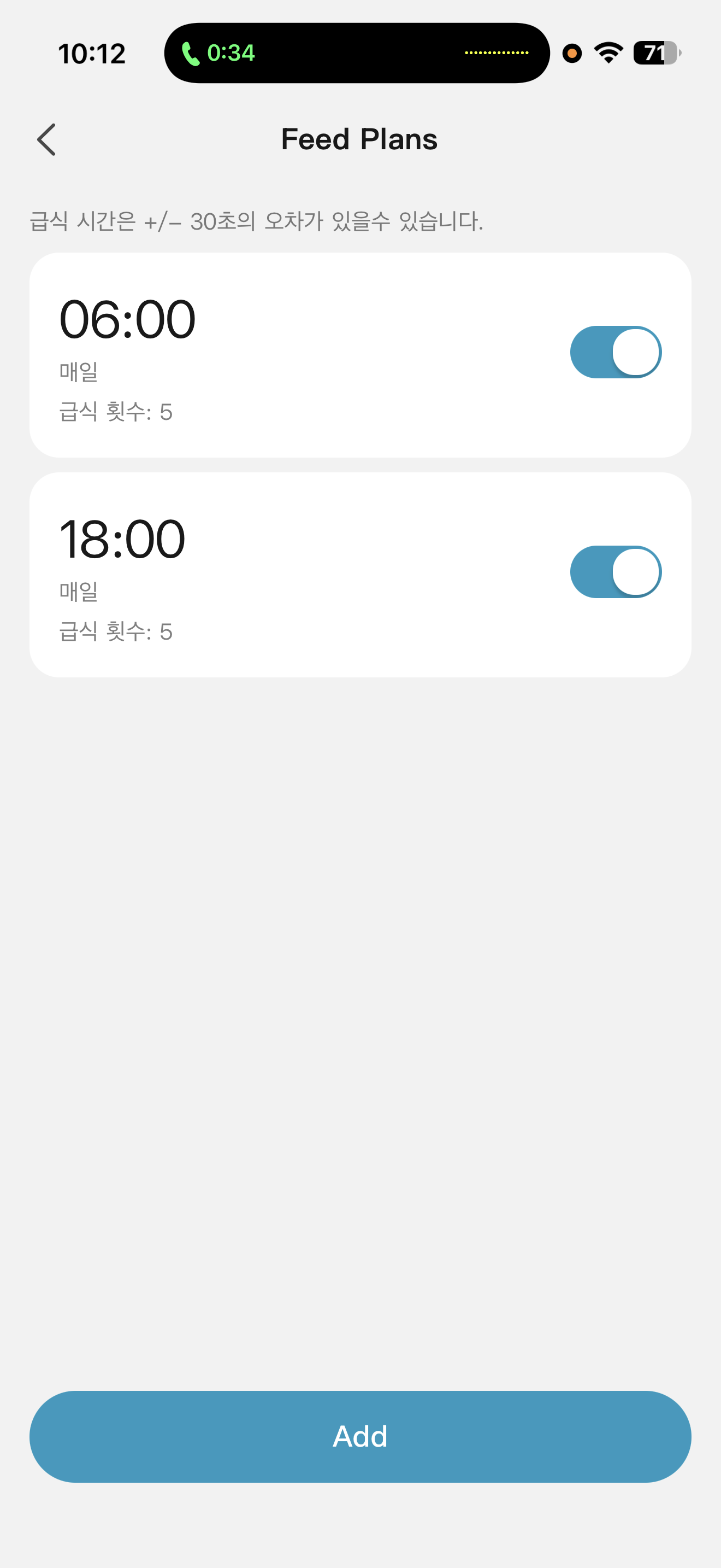 앱의 디자인은 매우 단순하고, 딱 필요한 기능들만 있습니다. 급식 횟수를 누른 후 수동급식을 누르면 되고, 시간 별로 자동급식을 예약해 놓으면 와이파이에 연결된 시계를 바탕으로 자동으로 급식이 됩니다. 물론 자동급식도 사료량을 조절하여 설정할 수 있습니다.