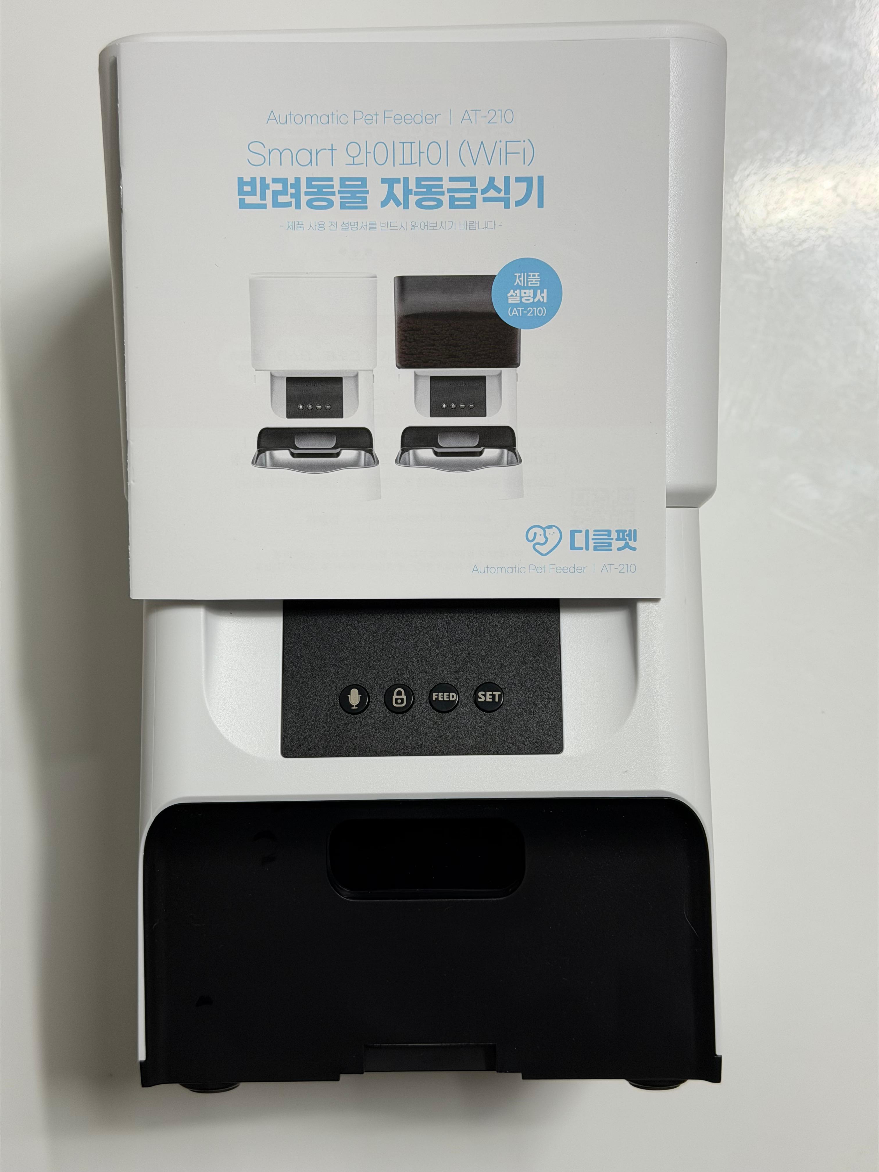 디클펫 AT-210을 열어 보면 한글 매뉴얼 외에 다른 것들은 눈에 띄지 않습니다. 그래서 사료를 넣는 사료통을 열어 보니 그 안에 여러 구성품이 함께 들어 있습니다. 전체적인 외관은 흰색으로 깔끔하게 디자인되었습니다. 뚜껑은 힌지 방식이 아니라 아예 분리가 되는 방식입니다. 전면에는 기능 버튼이 있는데 저는 처음 와이파이를 설정할 때 외에는 건드릴 일이 없더라고요. 그래도 모든 기능을 항상 앱을 통해서만 할 수는 없을 테니 버튼이 있는 건 상당히 바람직합니다.