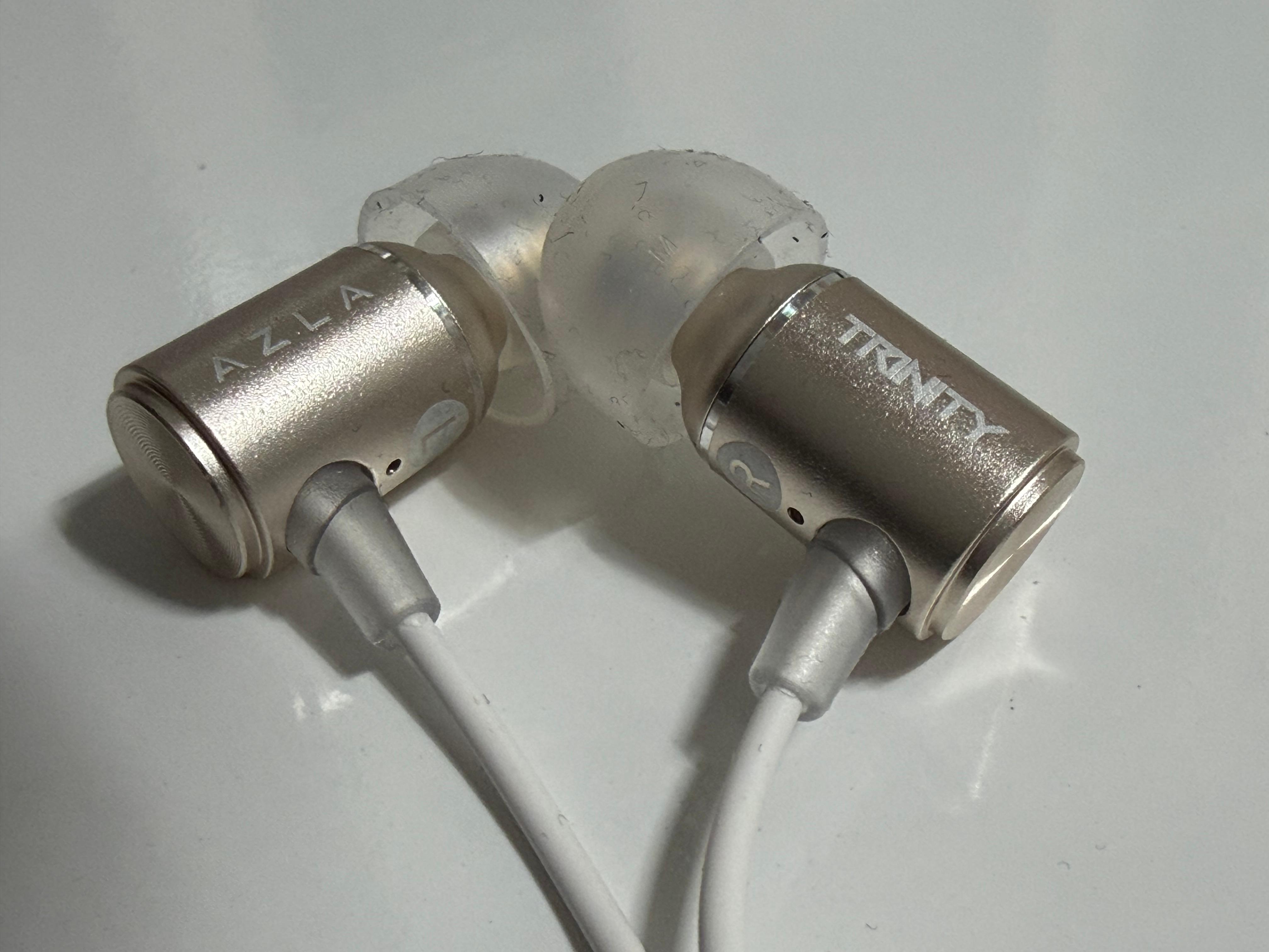 아즈라 트리니티 이어폰은 흔히 말하는 '총알' 타입의 외관을 가지고 있습니다. 귀 뒤로 걸치는 오버이어 타입보다는 이런 총알 타입이 귀에 꽂고 뺄 때 편한 점도 있어서 저는 총알 타입의 이어폰을 더 선호하긴 합니다. 귀 뒤로 넘기는 건 제 귀 모양이 이상한지, 안경을 안 쓰기 때문인지 영 불편하더라고요.