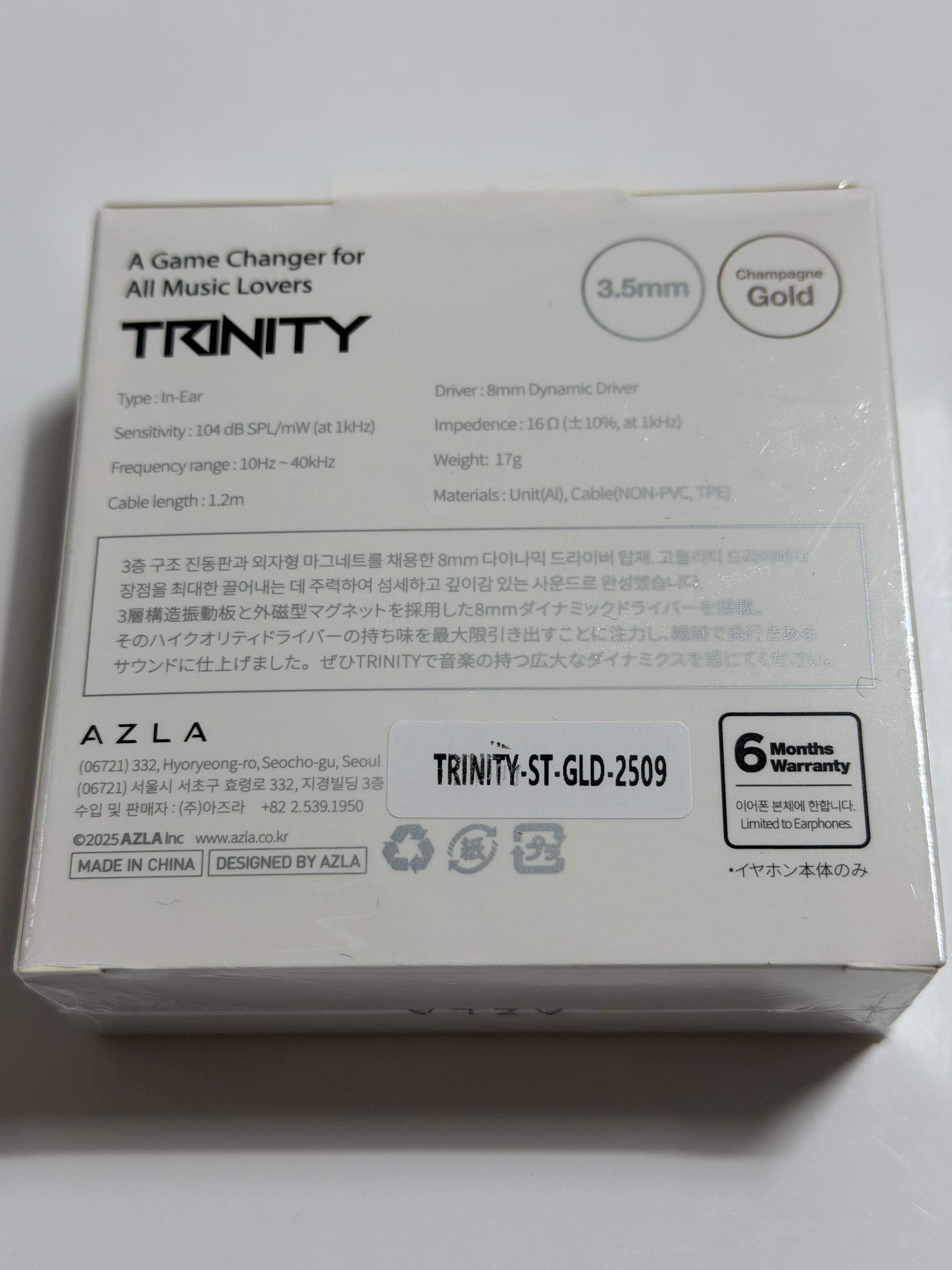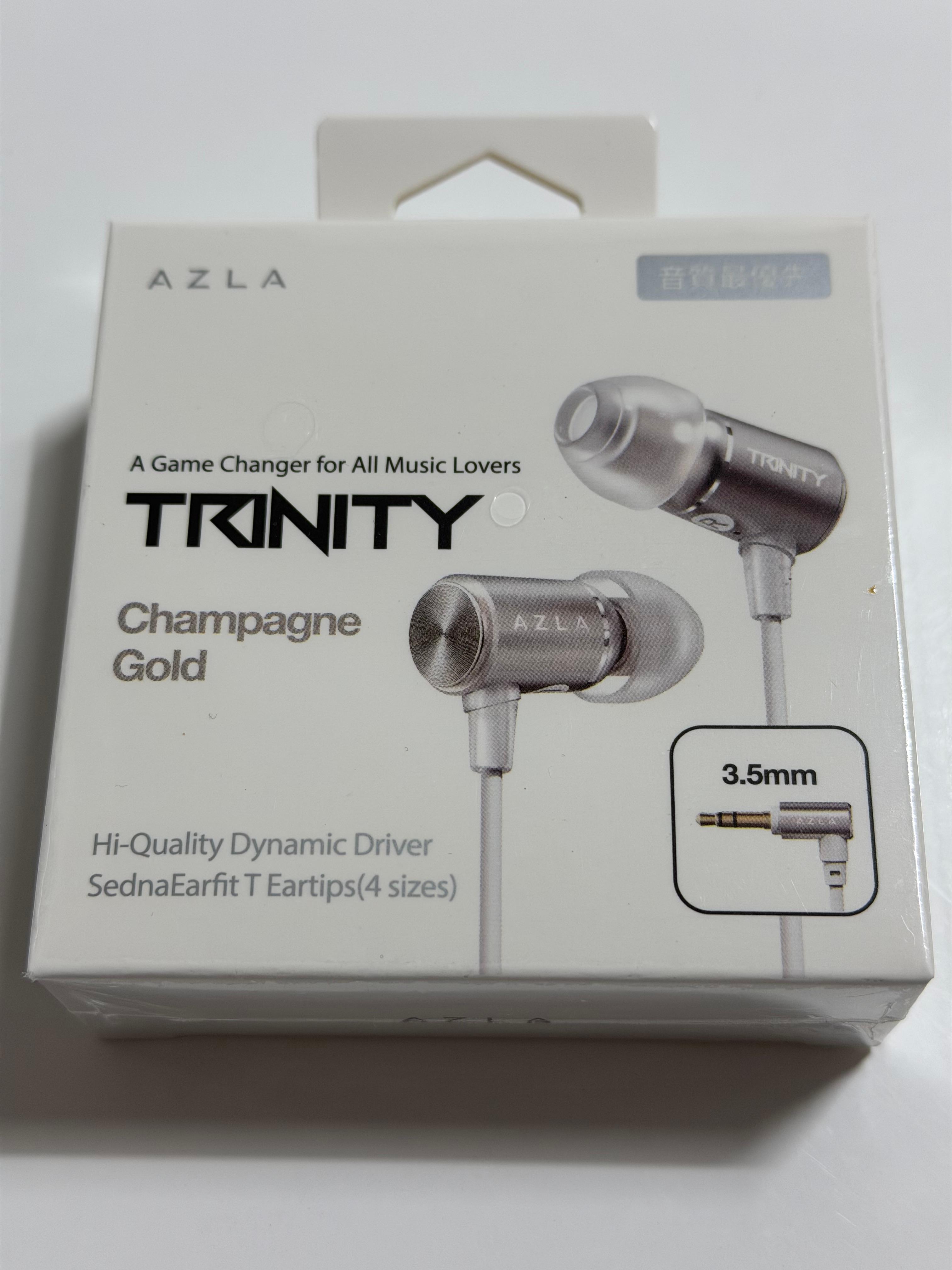 아즈라 트리니티의 상자는 아주 작습니다. 뭘 바랍니까. 2만 원짜리 이어폰한테. 이보다 더 작게 만들 수 있었다면 그랬어도 됩니다. 전반적으로 깔끔한 구성입니다. 아즈라 트리니티는 블루, 블랙, 샴페인 골드까지 3가지 색상에 USB C 단자와 3.5mm 단자를 채용해서 총 6 종류의 제품을 내 놓았습니다. 제가 구입한 색상은 샴페인 골드+3.5mm 입니다. 물론 그 전에 블루+USB C 제품도 구입해서 이미 가지고 있습니다.
