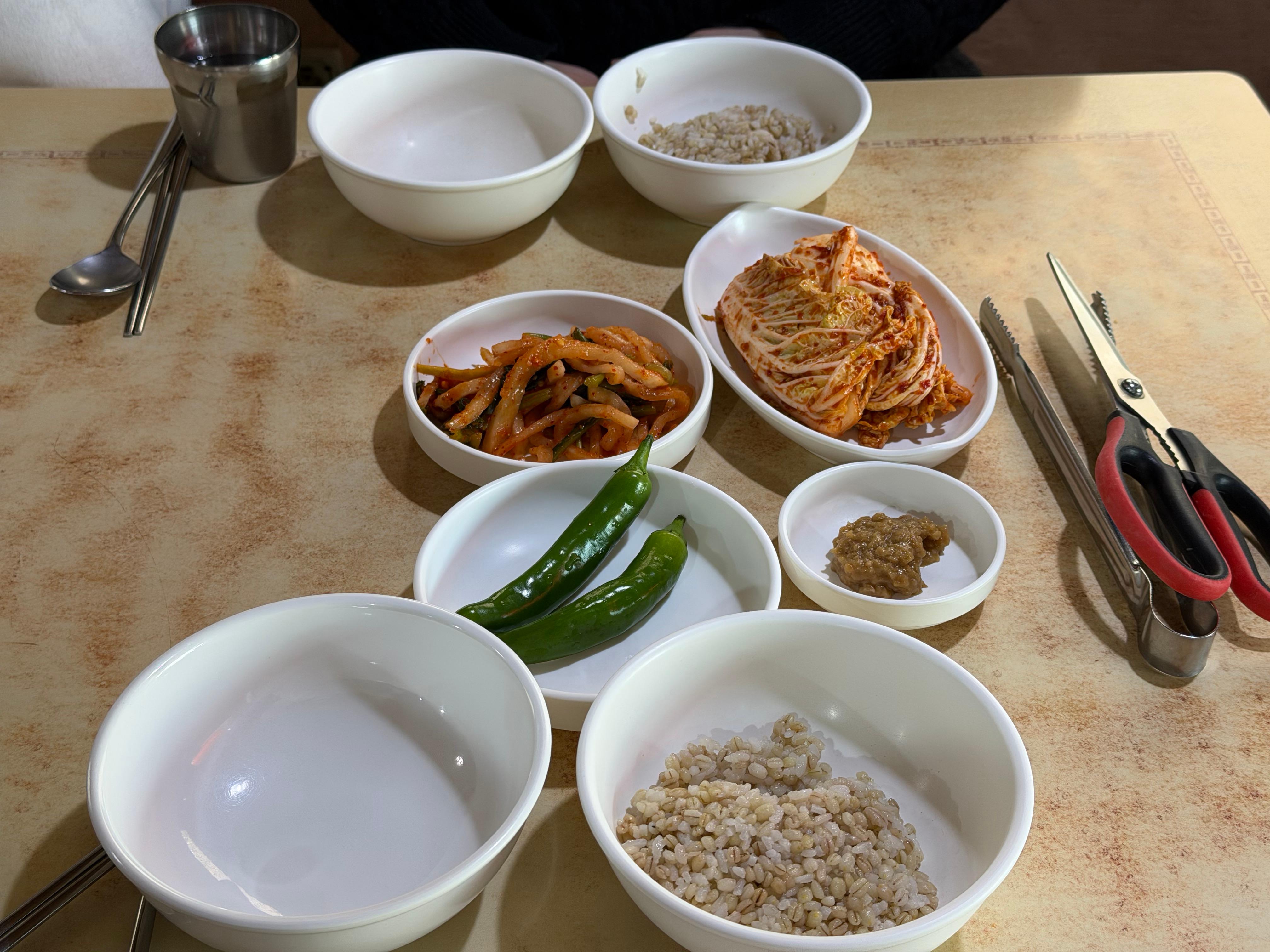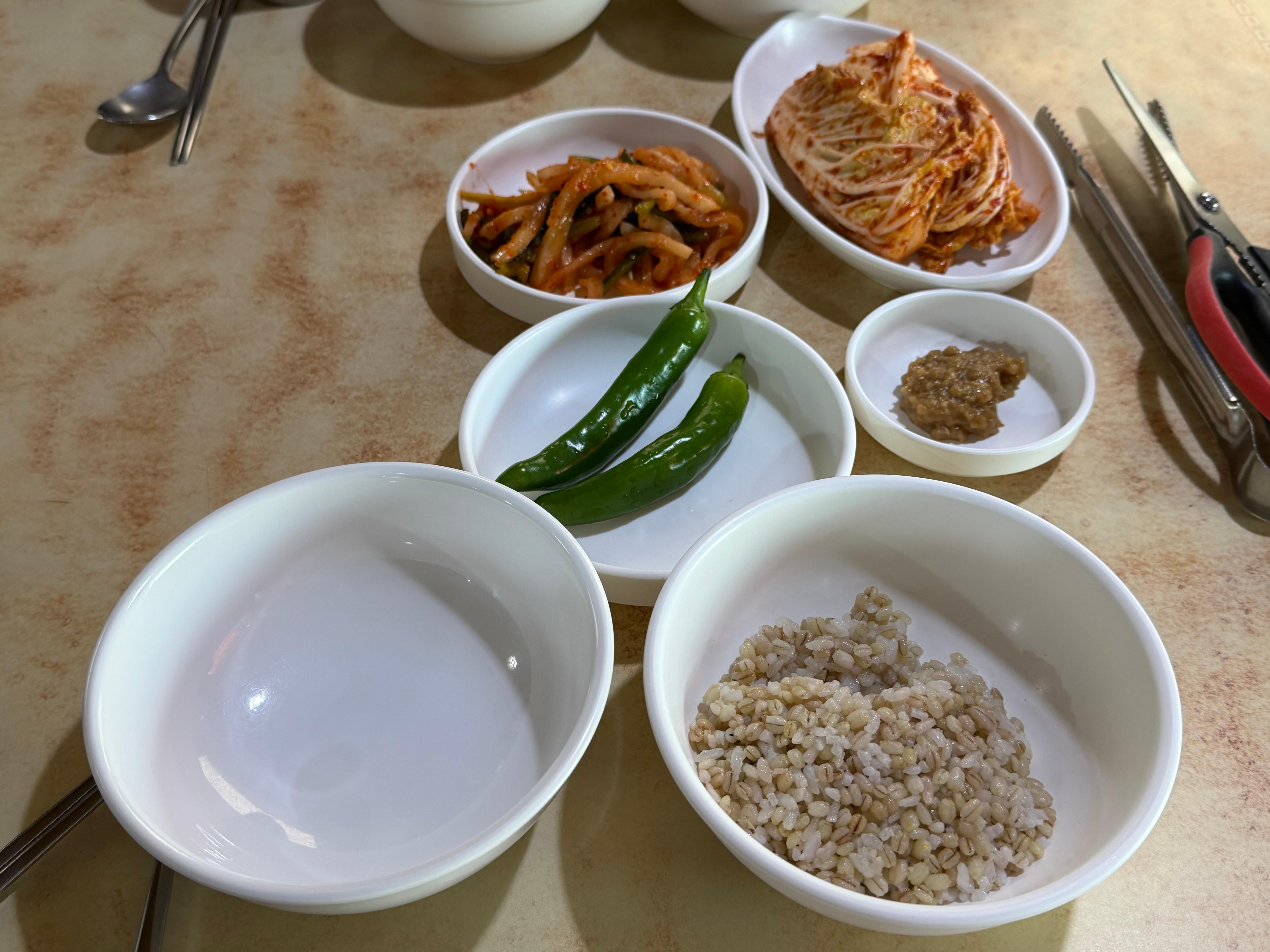 자리에 앉으면 컵라면 익는 속도보다 빠르게 보리밥과 기본 반찬이 나옵니다. 무생채와 핫도그 가게에 있는 케찹통에 담긴 고추장을 약간 넣어 비벼 먹으면 입맛이 확 돕니다. 신선한 겉절이도 맛있고요. 8,000원에 이 정도 메뉴 구성이라는 게 놀랍습니다. 이 정도 구성을 이 가격에 파실 수 있는 건 아마도 건물주이기 때문일 거라고 확신합니다?