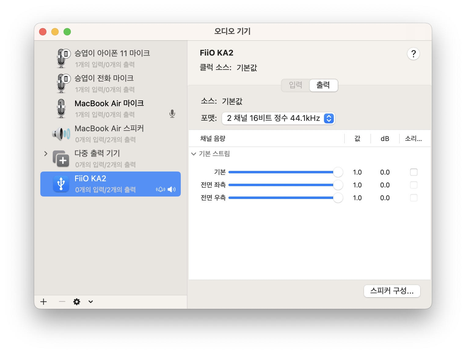 Fiio KA2를 클릭해 보면 기본 포맷이 '2채널 16비트 정수 44.1KHz'로 되어 있는 것을 확인할 수 있습니다. 이것을 이제 클릭해 보면 아래와 같은 화면을 볼 수 있습니다.