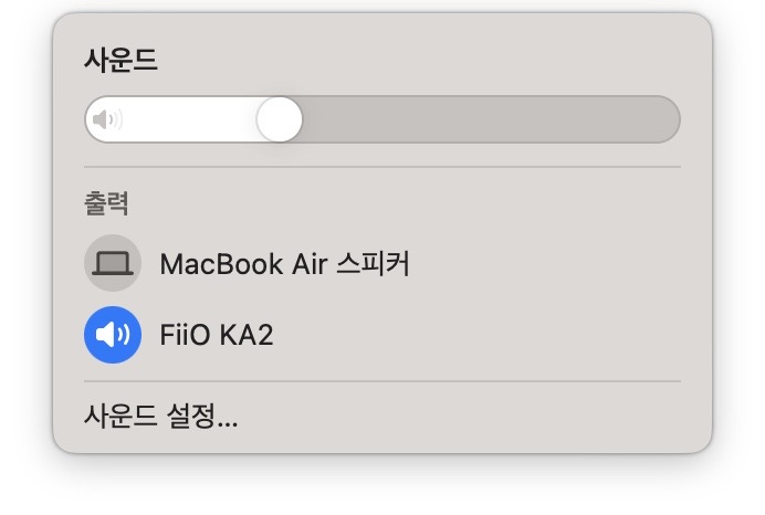 맥OS의 상단 메뉴바의 제어센터 아이콘을 클릭하면 사운드 설정을 변경할 수가 있습니다. 기본으로는 출력란에 MacBook Air 스피커로 되어 있습니다. 이걸 Fiio KA2로 바꾸고 아래의 사운드 설정을 해 주면 됩니다. 하지만 이렇게 하면 기본적인 샘플링률로만 출력이 됩니다. 파란색을 벗어날 수가 없는 거죠. 그래서 다른 설정값을 바꿔 줘야 합니다.