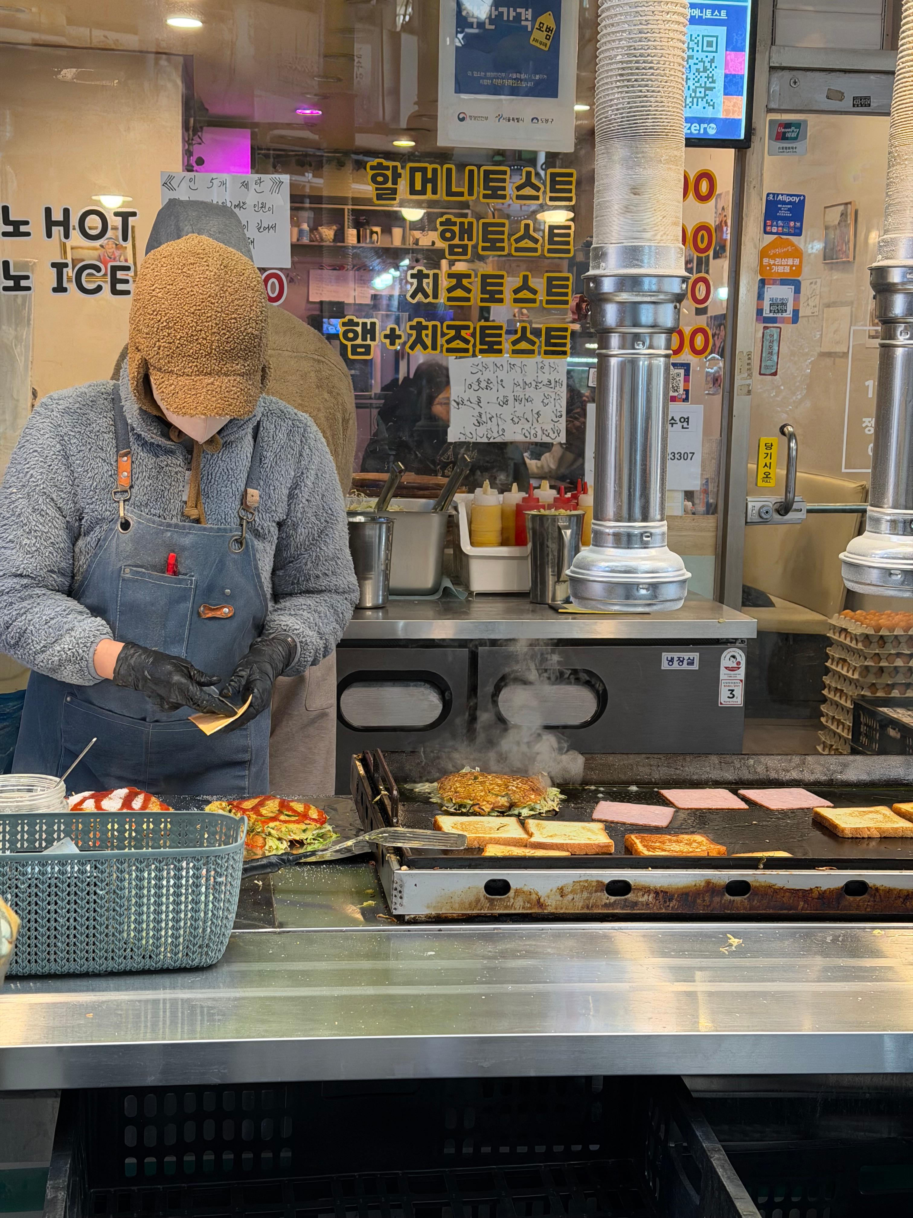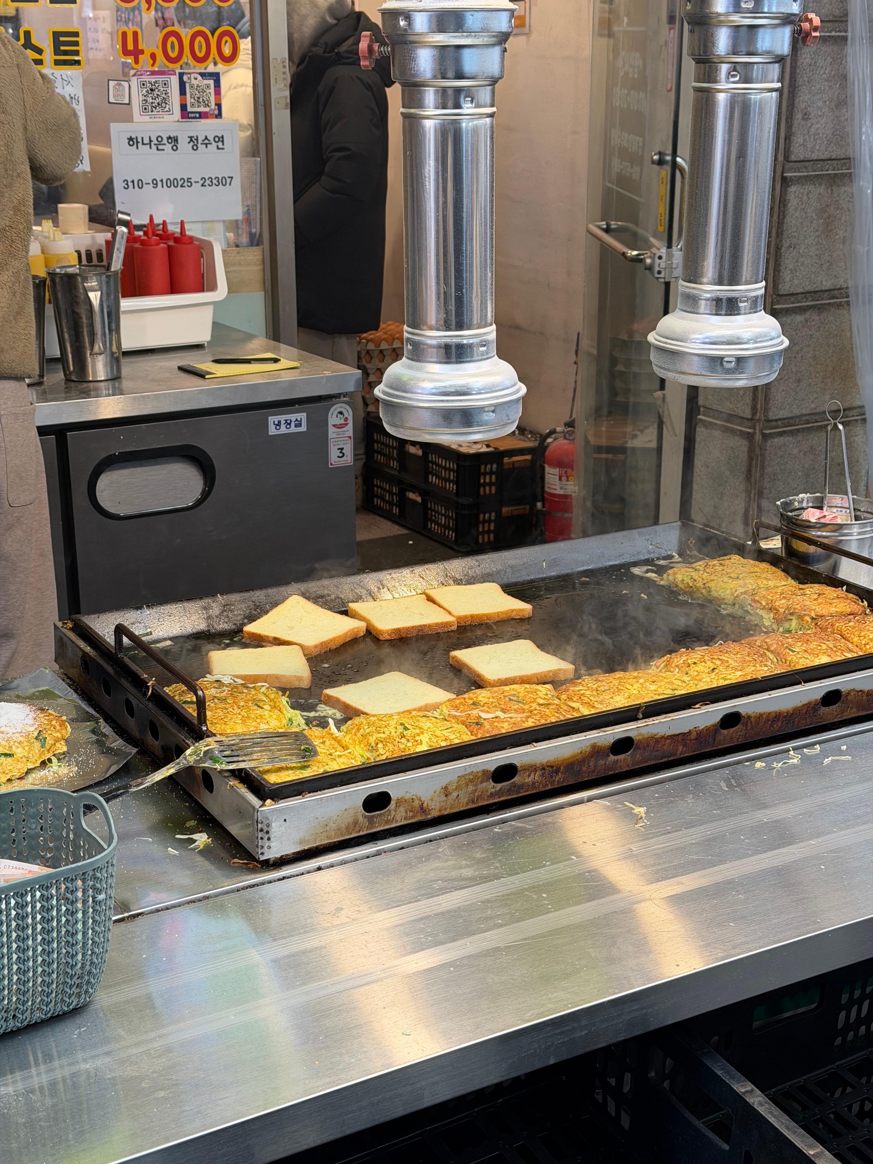 토스트를 만드는 과정을 계속 보고 있었는데 눈에 띈 부분이 있었습니다. 혼자서 일을 하시다 보니 이런저런 일들 때문에 제 때 빵을 뒤집지 못하면 빵이 그을리게 되는데 조금이라도 탄 것 같은 색깔이 눈에 띄면 그냥 바로바로 버리시는 모습을 보았습니다. 재료가 아까울 법도 하고, 기다리는 손님들에게 하나라도 빨리 토스트를 내고 싶은 마음이 있으실 법도 한데, 최소한 탄 음식을 내지는 않겠다는 마음가짐을 가지고 계신 것 같아 보는 중에 마음이 편안해졌습니다.