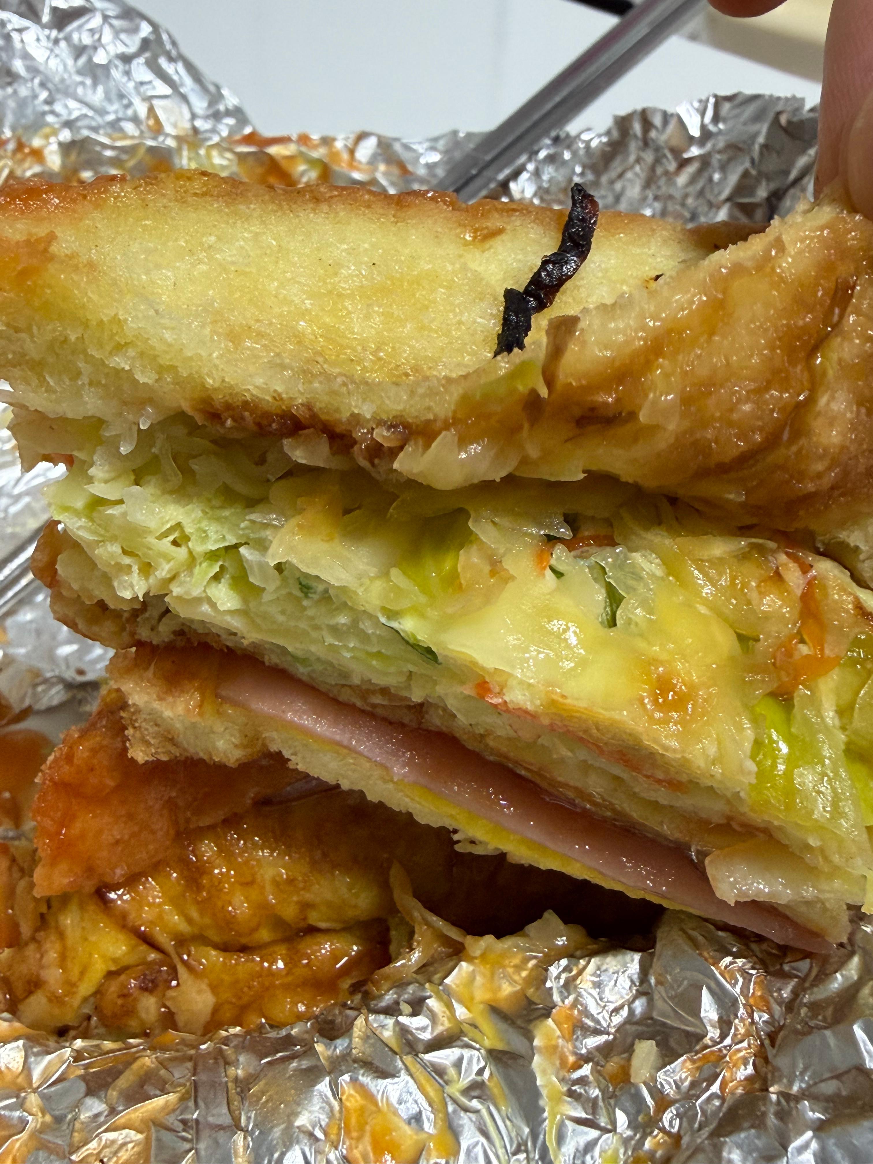 맛은 전형적인 한국식 토스트였고, 다른 곳에 비해 양배추의 맛이 더 많이 느껴지는 편이었습니다. 빵을 구울 때 마가린을 아낌없이 두른 덕에 빵은 전체적으로 촉촉하게 코팅이 되어 있었고, 햄맛은 거의 느껴지지는 않았습니다.