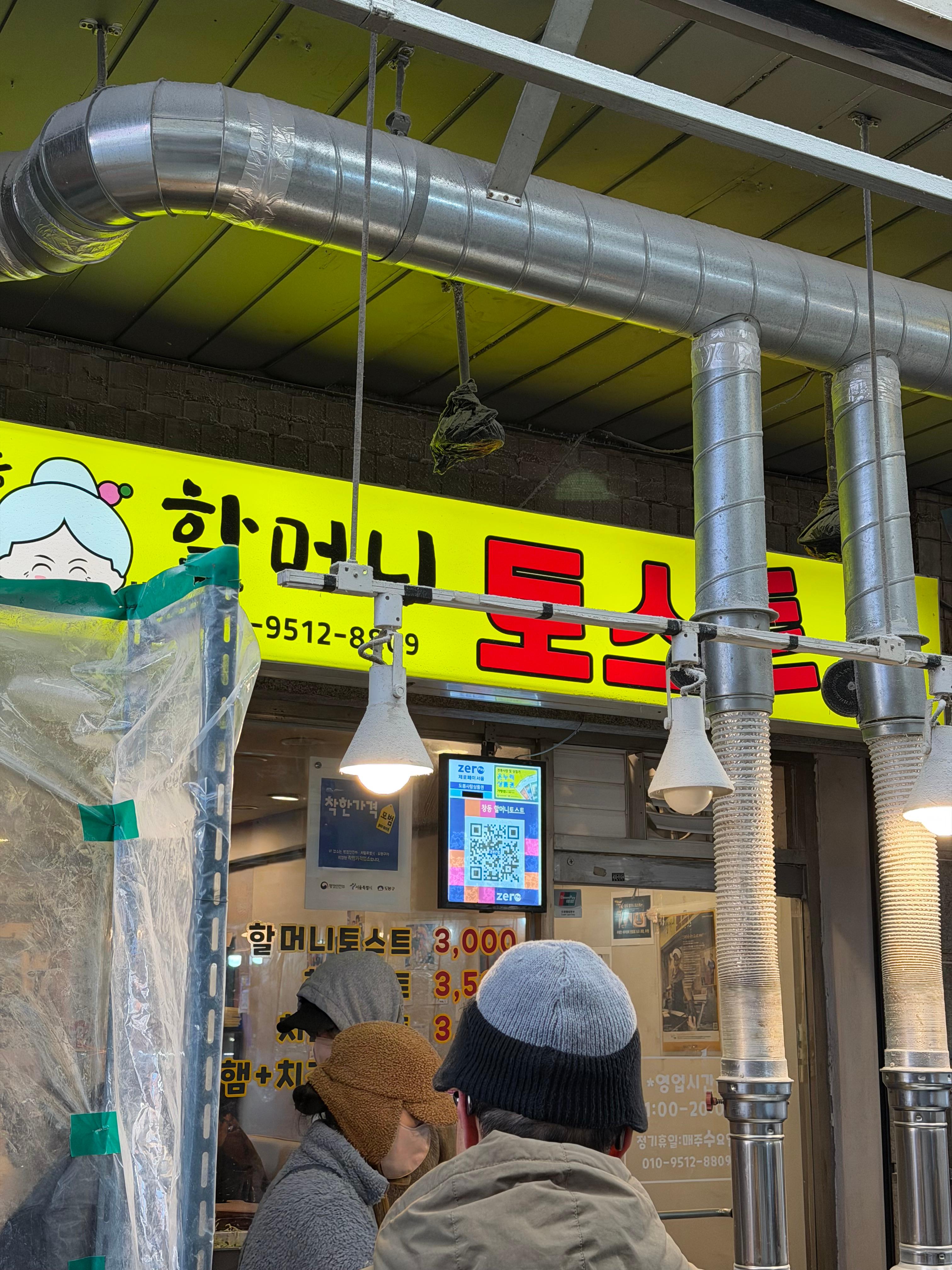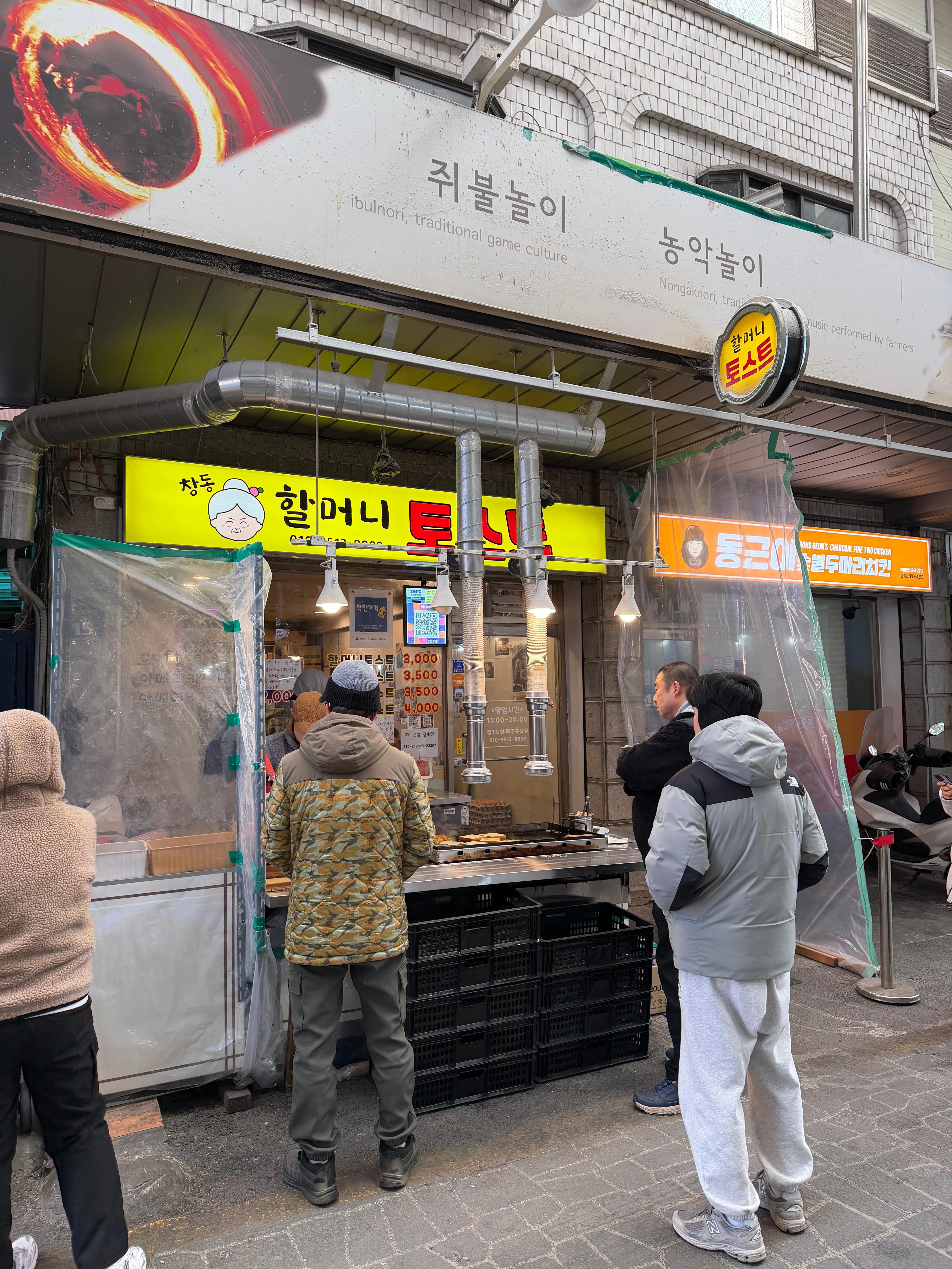 이번에 방문한 할머니 토스트의 외관입니다. 창동골목식당의 끝자락에 T자형으로 도로와 합쳐지는 곳에 위치한 할머니 토스트는 이름과 달리 할머니가 아닌 분이 토스트를 굽고 계셨습니다. 군밤모자와 마스크를 쓰셔서 고개를 갸우뚱하면서 '할머니가 아닌데?'라는 생각을 하게 됐습니다만 나중에 찾아 보니 할머니는 별세하셨고 며느님이 그 뒤를 이어 영업을 하고 계시다고 하네요. 후기를 찾아 봐도 예전 할머니께서 하시던 때와 맛도 그대로라고 하는 걸 보면 신당동 어느 떡볶이 가게와는 다른 것 같습니다.