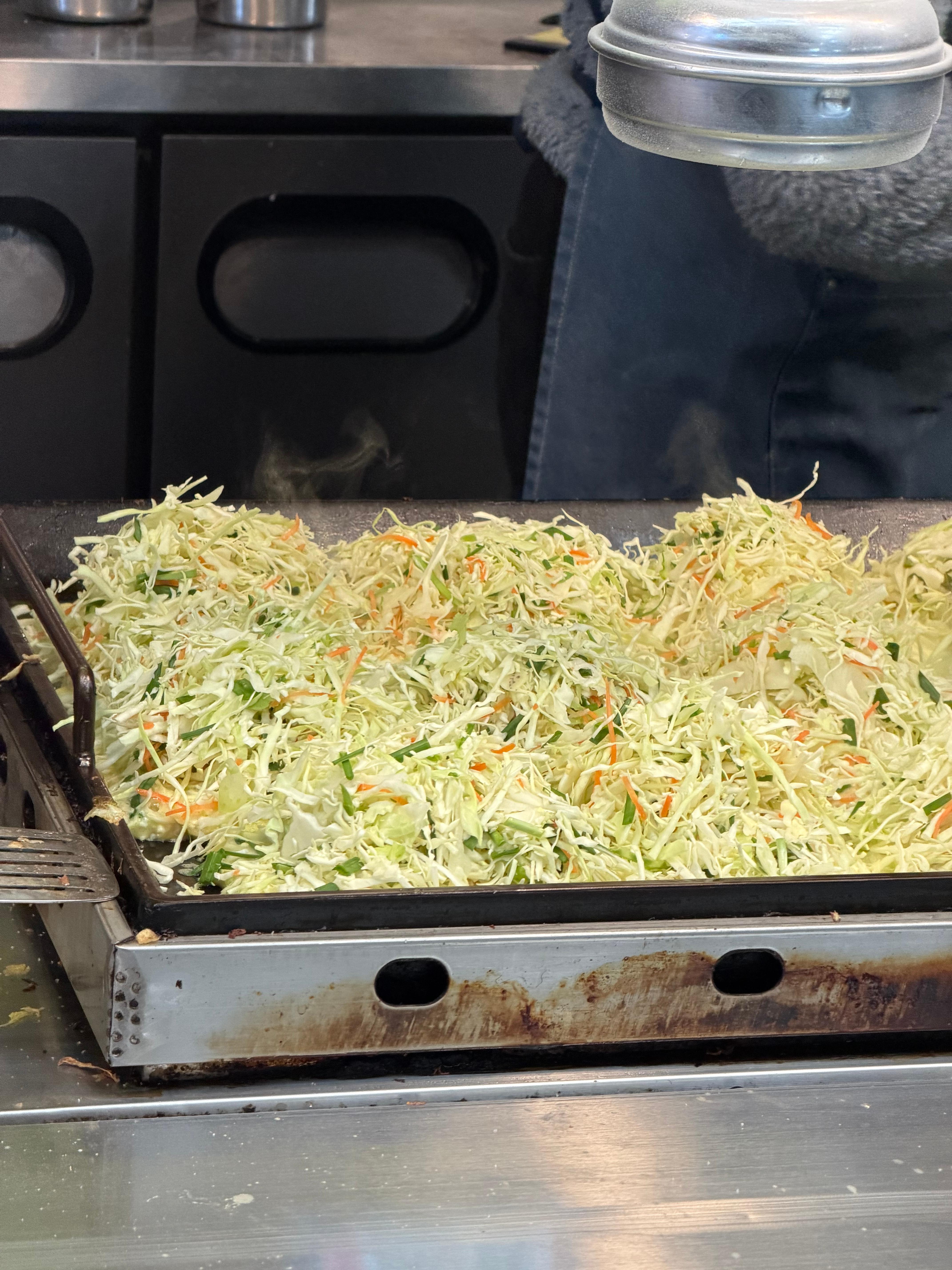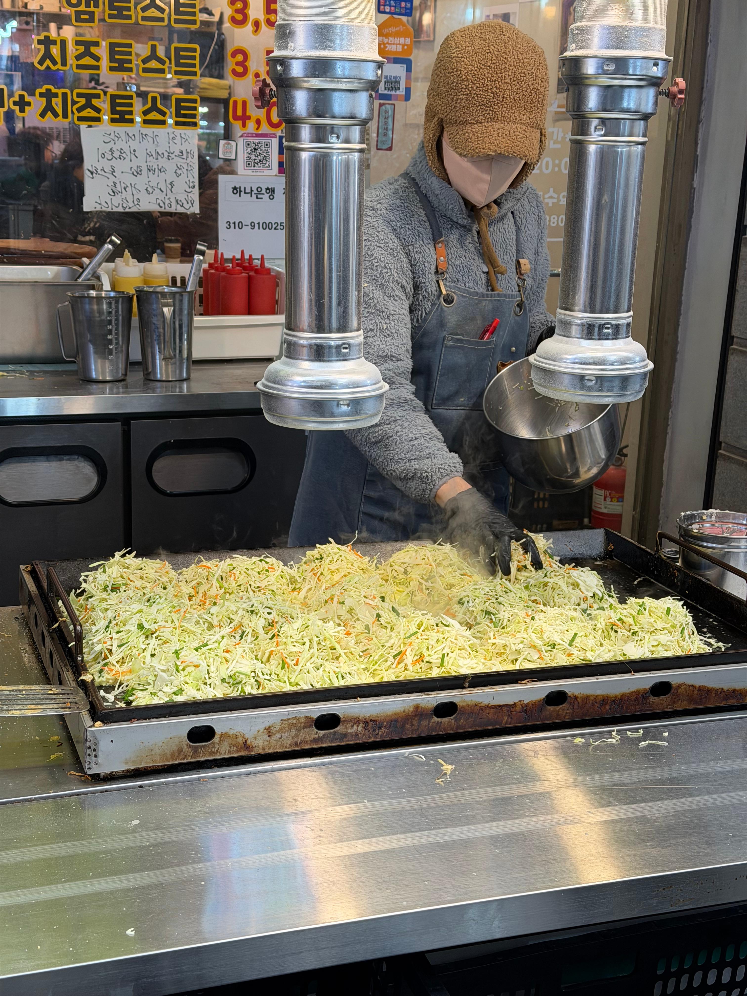 토스트는 달걀을 푼 기본 반죽을 넓게 펼치면서 만들어지기 시작합니다. 그리고 그 위에 '손에 집히는 대로' 양배추를 한가득 올려 놓는데 그 양이 정말 엄청납니다. 대부분의 토스트 가게들이 기본반죽에 들어 있는 양배추로 속을 만드는데, 이곳은 기본 반죽 외에 양배추와 당근, 쪽파가 적절한 비율로 섞여 있는 채소를 한 웅큼 이상 올려 놓고 푹 익힙니다. 철판 하나에 15개의 토스트 속을 만들어 내는 모습이 꽤 숙달된 느낌을 받았습니다.