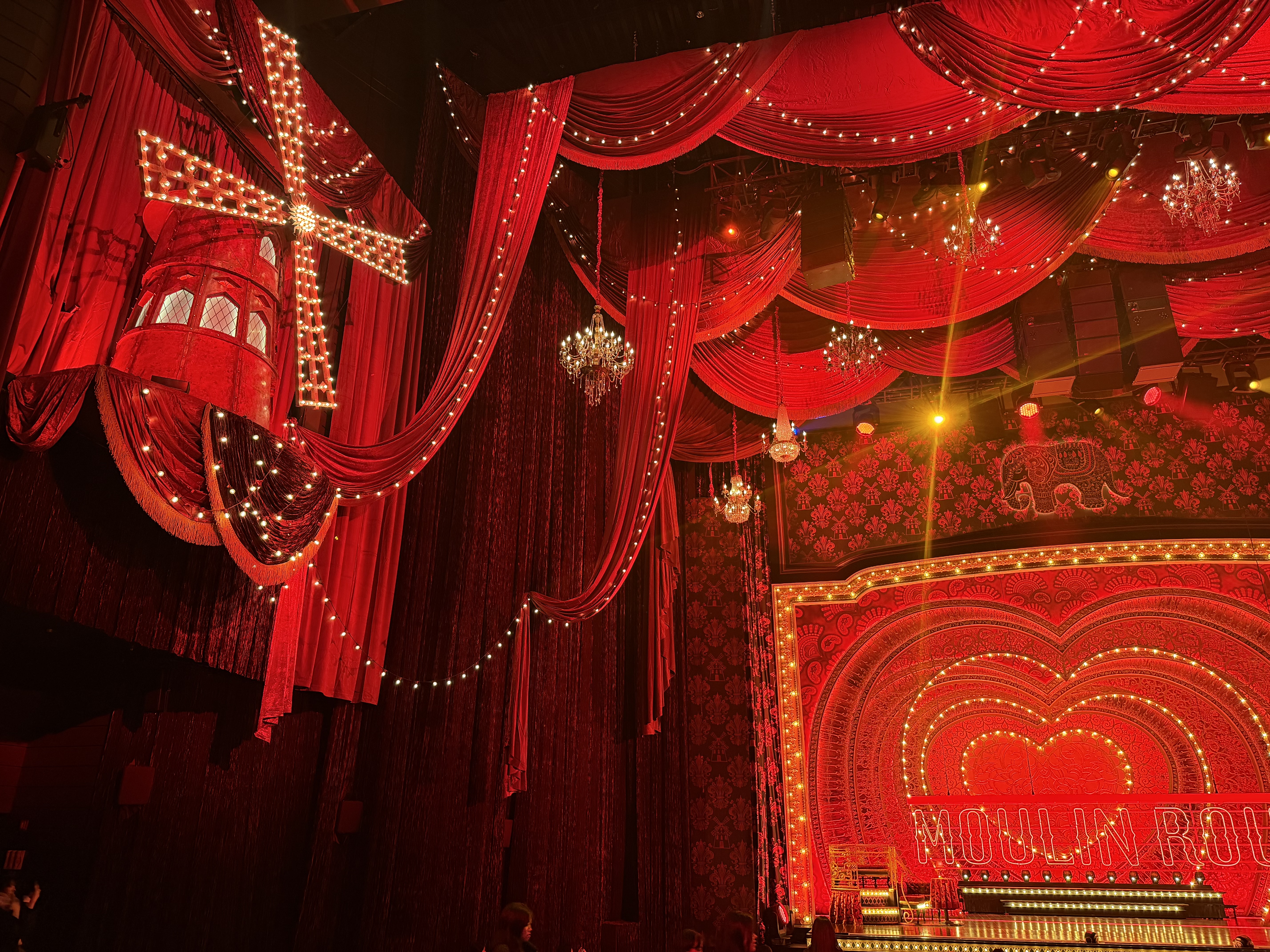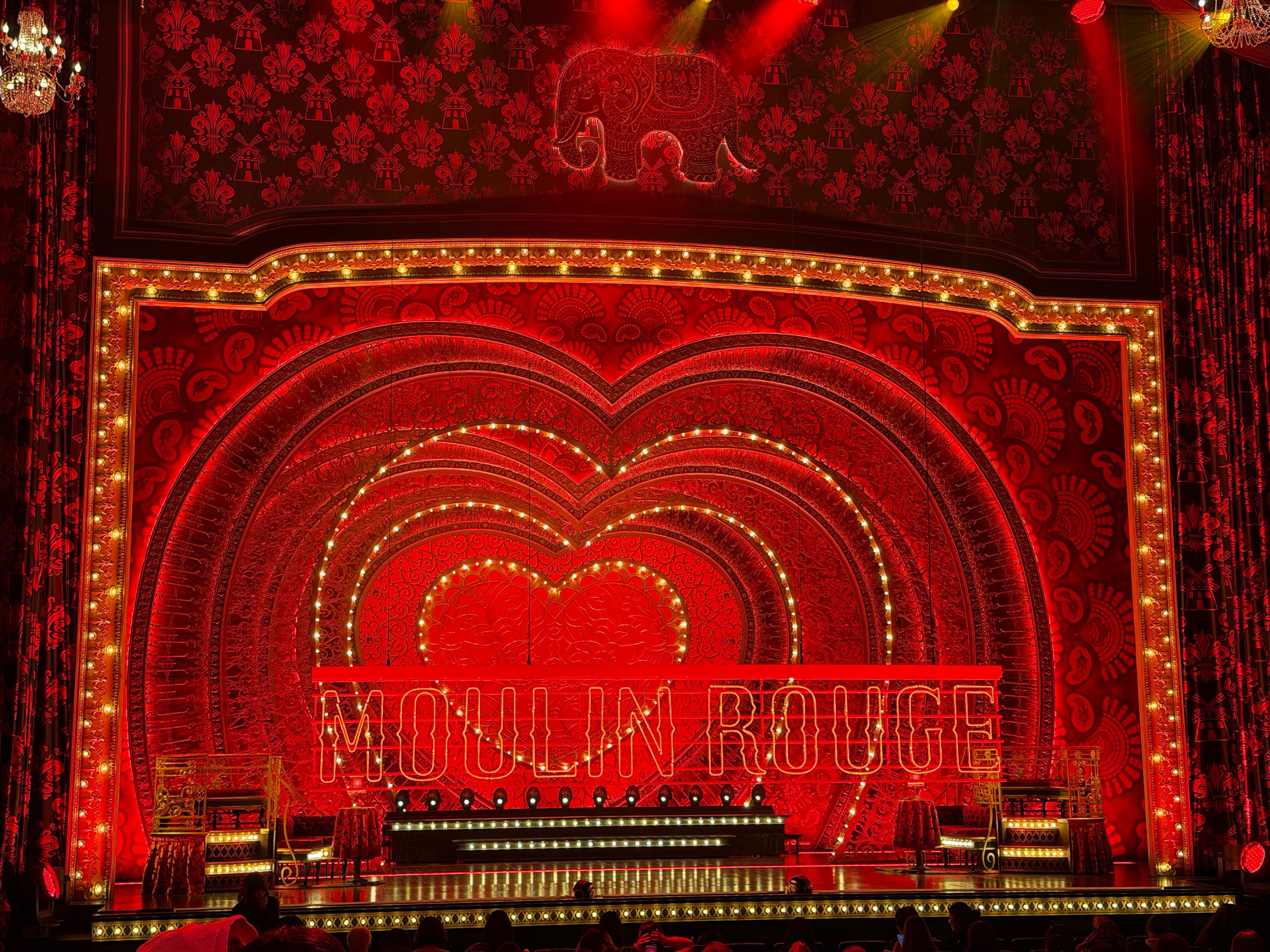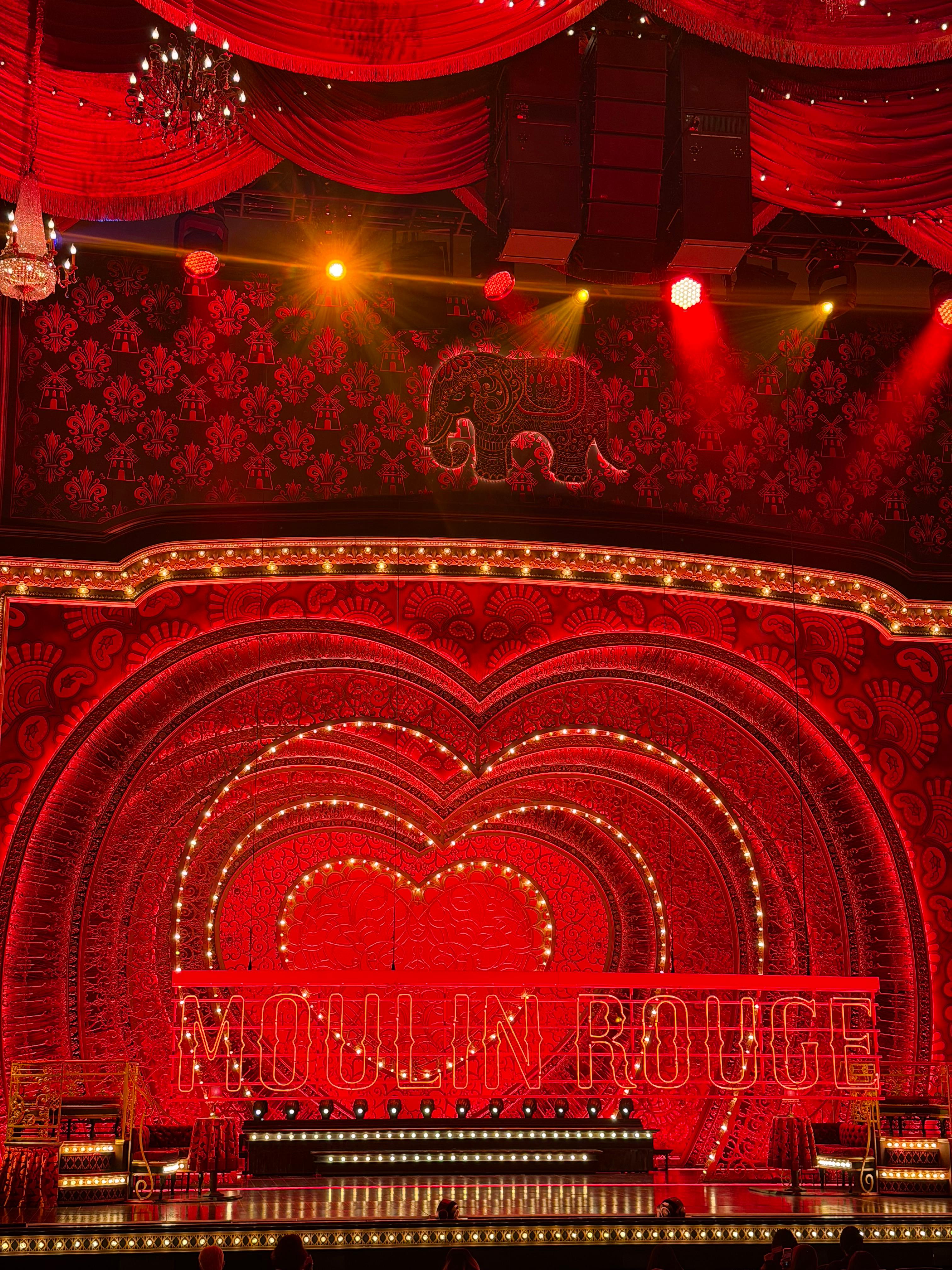 무대 디자인은 객석의 10열 정도까지 이어질 만큼 스케일이 큽니다. 전체적으로 물랑루즈가 쇼비즈니스물이고 화려하고 반짝이는 옷과 소품을 많이 사용하고 있는 탓에 무대와 그 주변까지 강렬한 디자인으로 만들어져 있습니다. 물랑루즈 라는 이름 자체가 프랑스어로 붉은 풍차 라고 하네요.