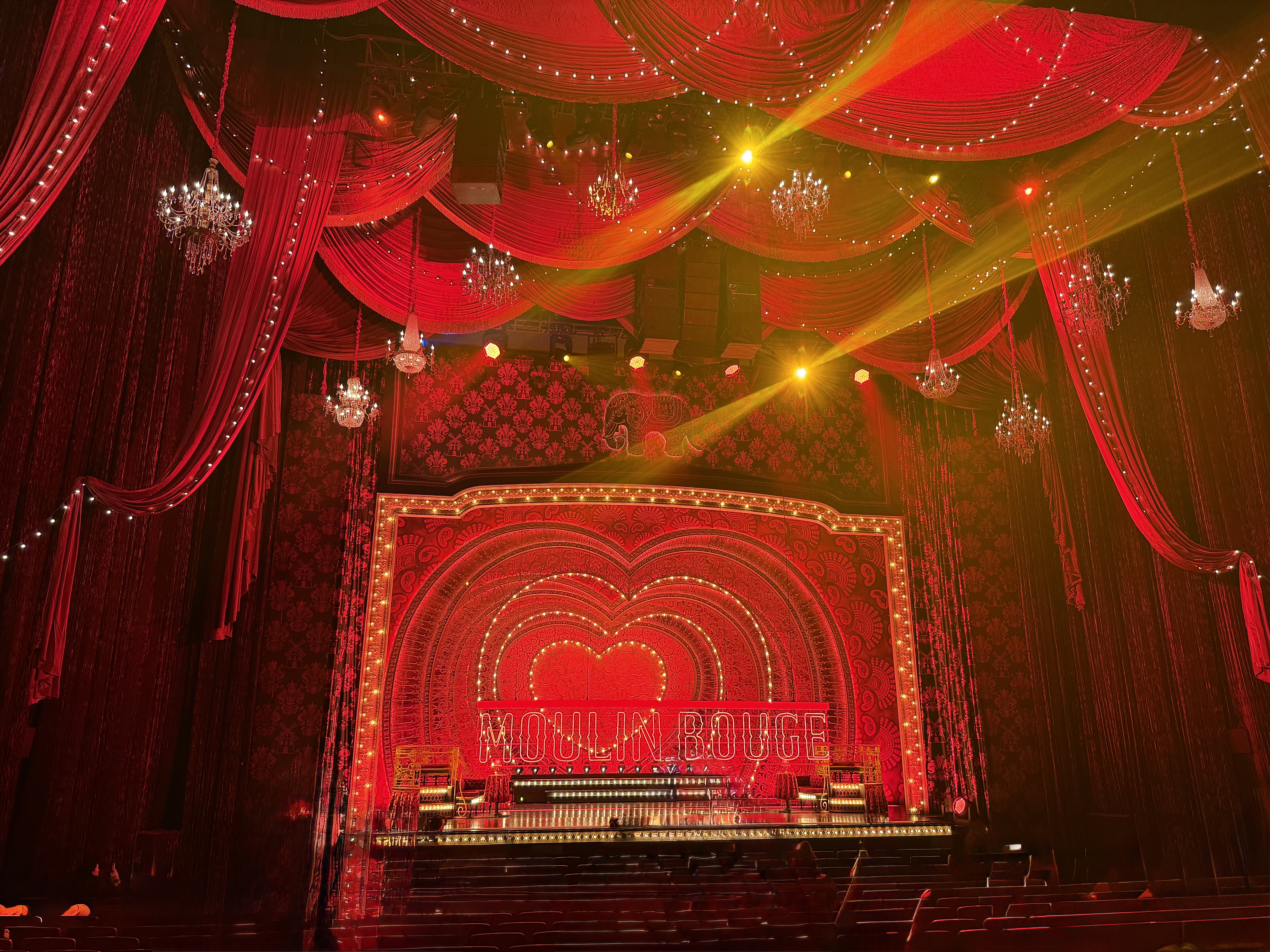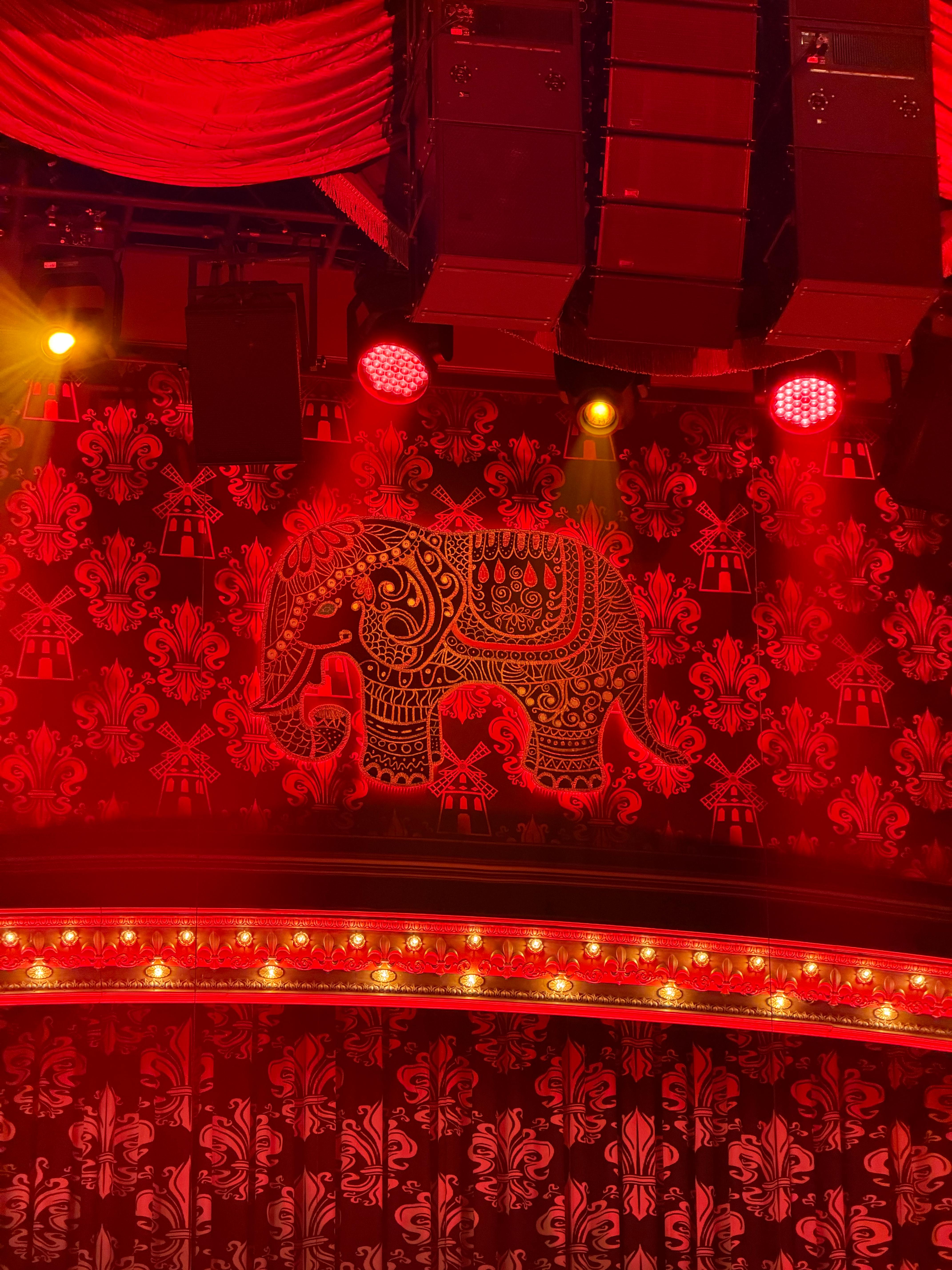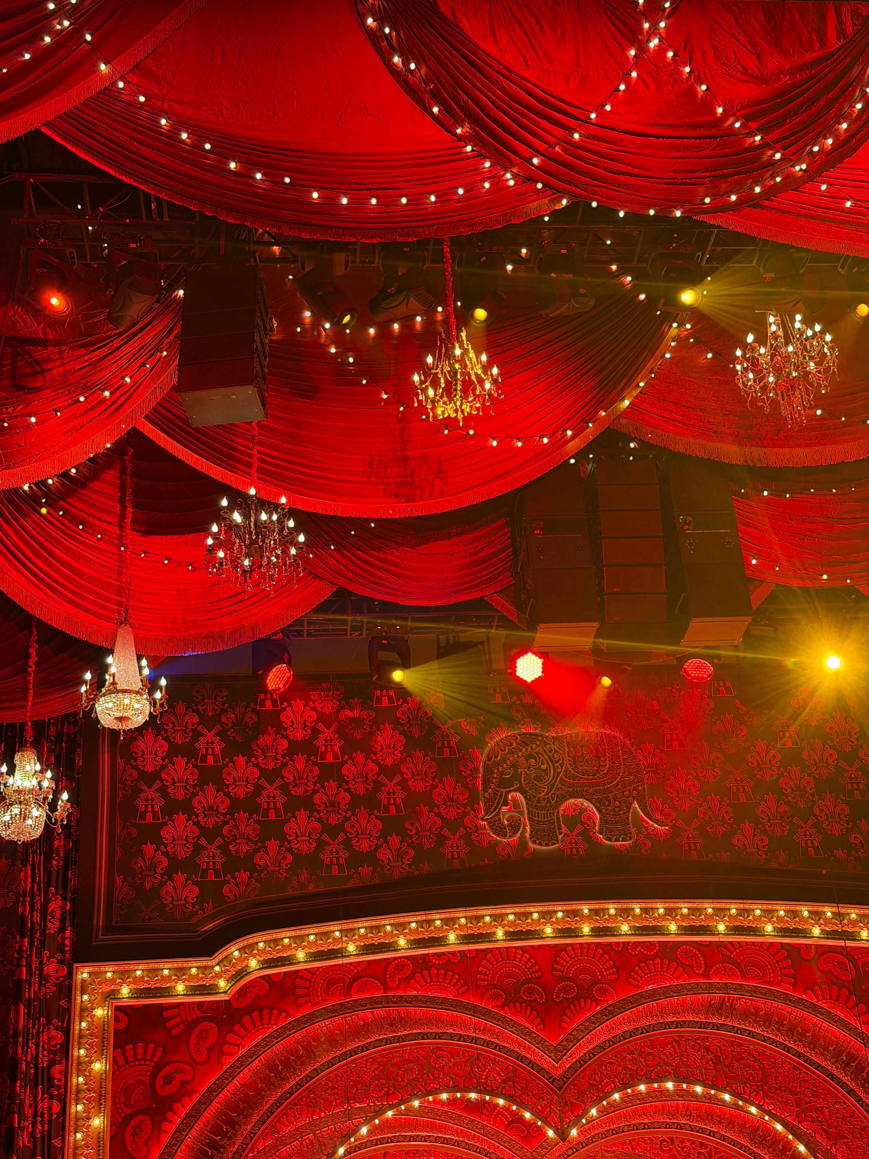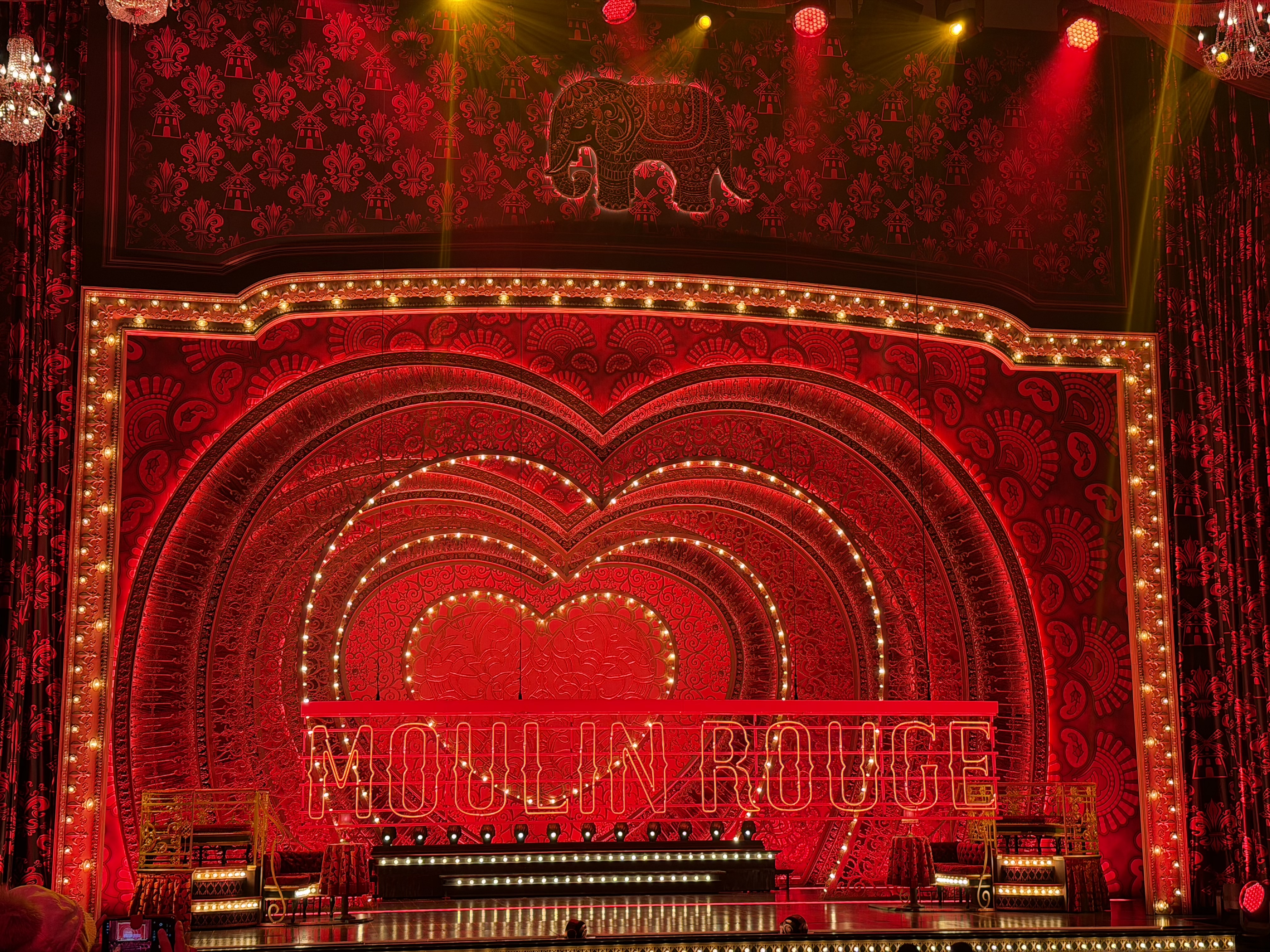무대 디자인은 객석의 10열 정도까지 이어질 만큼 스케일이 큽니다. 전체적으로 물랑루즈가 쇼비즈니스물이고 화려하고 반짝이는 옷과 소품을 많이 사용하고 있는 탓에 무대와 그 주변까지 강렬한 디자인으로 만들어져 있습니다. 물랑루즈 라는 이름 자체가 프랑스어로 붉은 풍차 라고 하네요.