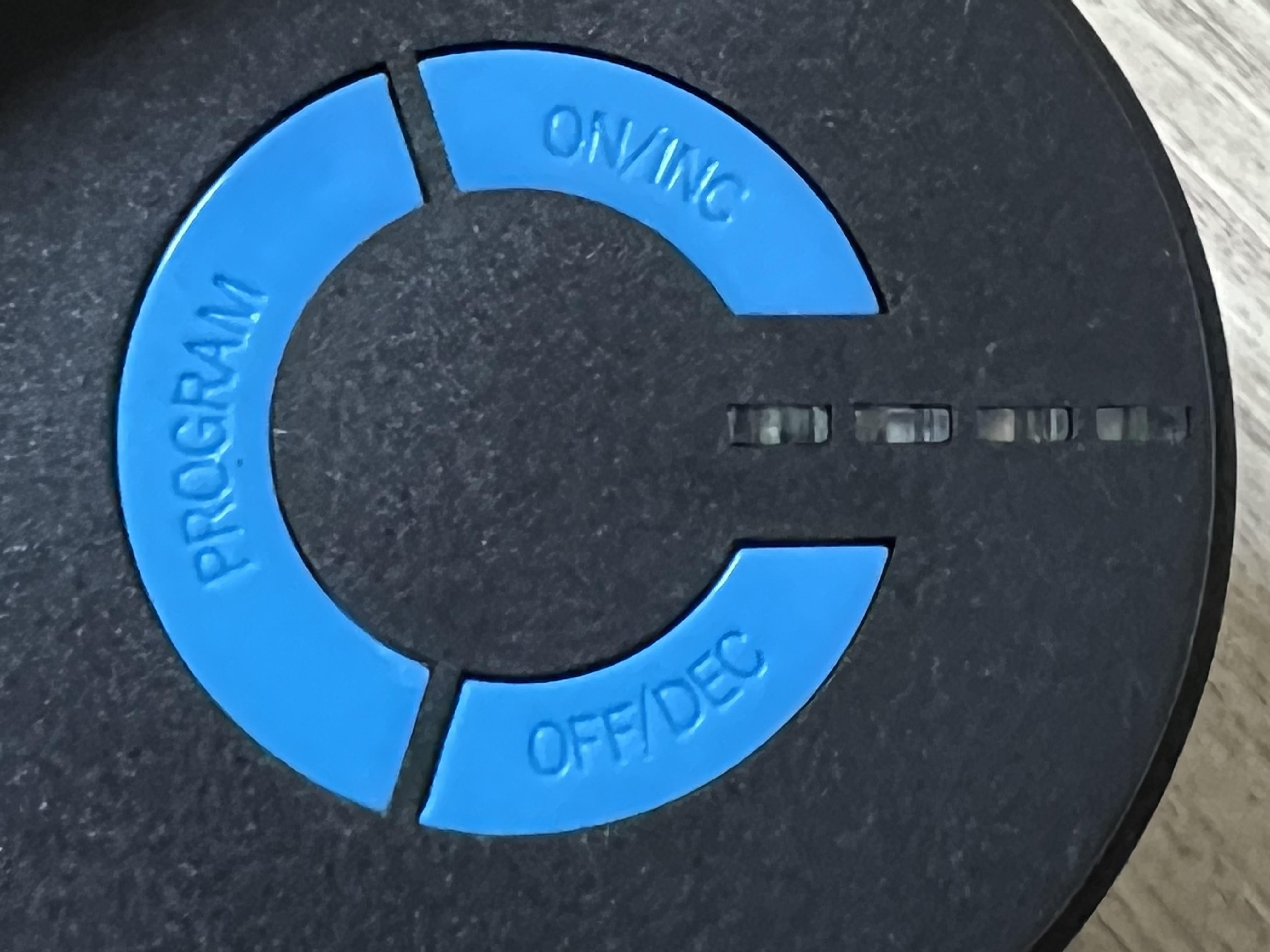 동작부에는 AAA 사이즈 건전지 2개가 들어 갑니다. 구성은 단순합니다. 건전지는 아래쪽을 뒤집어서 넣으면 되고, 상단에는 전원 켜기/강도 높임을 함께 쓰는 버튼, 전원 끄기/강도 낮춤을 함께 쓰는 버튼, 그리고 프로그래밍된 강도로 세게 했다가 약하게 했다를 자동으로 해 주는 버튼, 전원과 강도를 나타내는 LED가 원형으로 자리하고 있습니다.