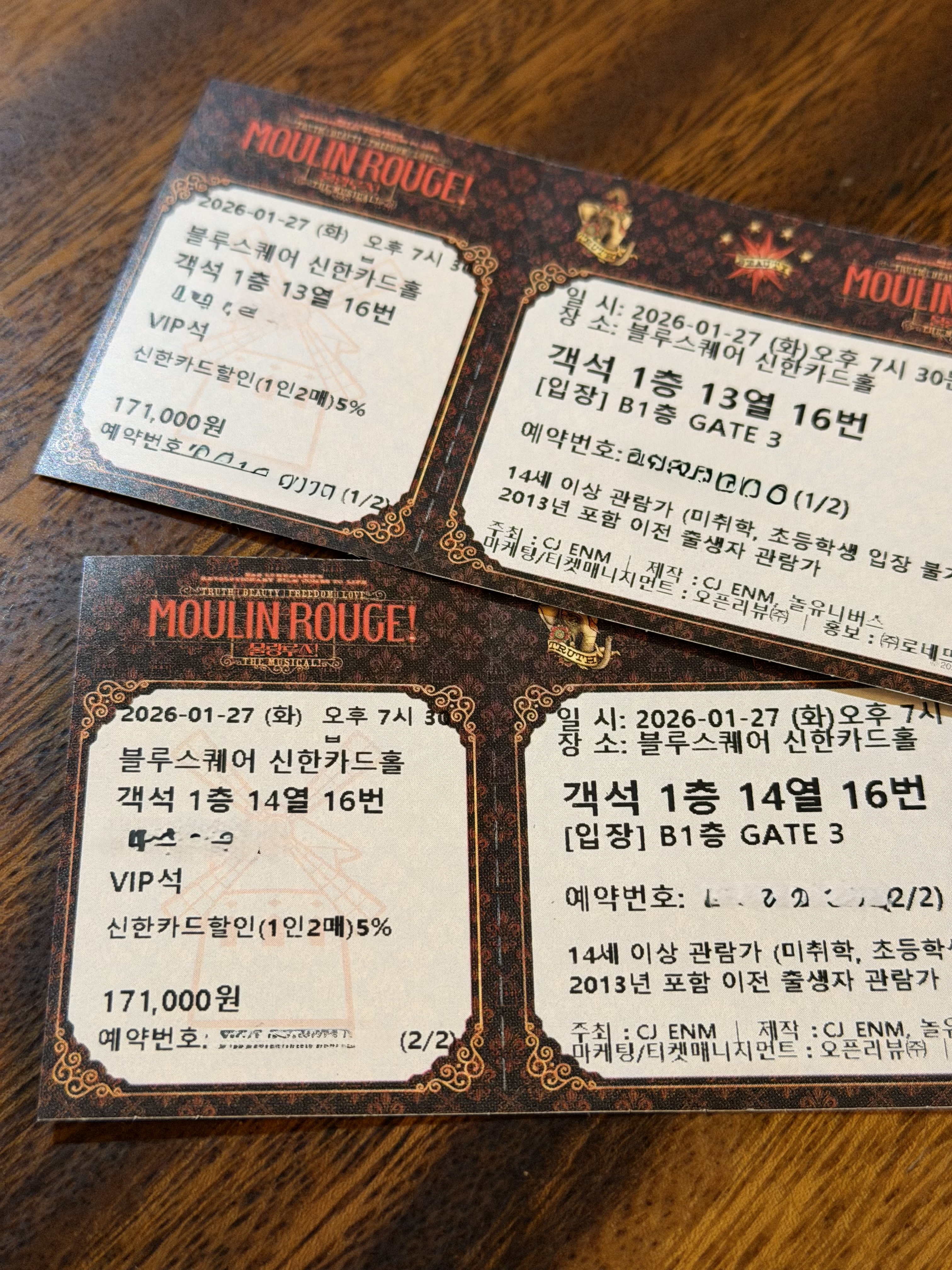 인생 두 번째 뮤지컬을 관람했습니다. 영화로 20여 년 전에 보았던 물랑루즈를 뮤지컬로 한다고 하여 여자친구와 함께 보기 위해 예매를 했었습니다. 뮤지컬은 그 특성 상 주인공급 남녀 배우를 여러 배우가 돌아가면서 연기를 하게 되는데 물랑루즈의 경우에는 남자 주인공 크리스티안에 홍광호, 이석훈, 차윤해 배우가, 여자 주인공 사틴에는 김지우, 정선아 배우가 캐스팅되었습니다. 그밖에도 조연급 배우들도 더블 캐스팅이 되었는데 조연급 배우 때문에 골라 보는 경우는 거의 없기 때문에 남녀 주연 배우의 조합에 따라 선택하면 됩니다. 저는 홍광호 배우와 정선아 배우의 조합을 보고 싶긴 했지만 이미 오래 전에 좋은 자리는 모두 사라져서 배우 얼굴을 알아 볼 수 없는 자리밖에 남지 않아 어쩔 수 없이 홍광호 배우와 김지우 배우 조합으로 보게 되었습니다.