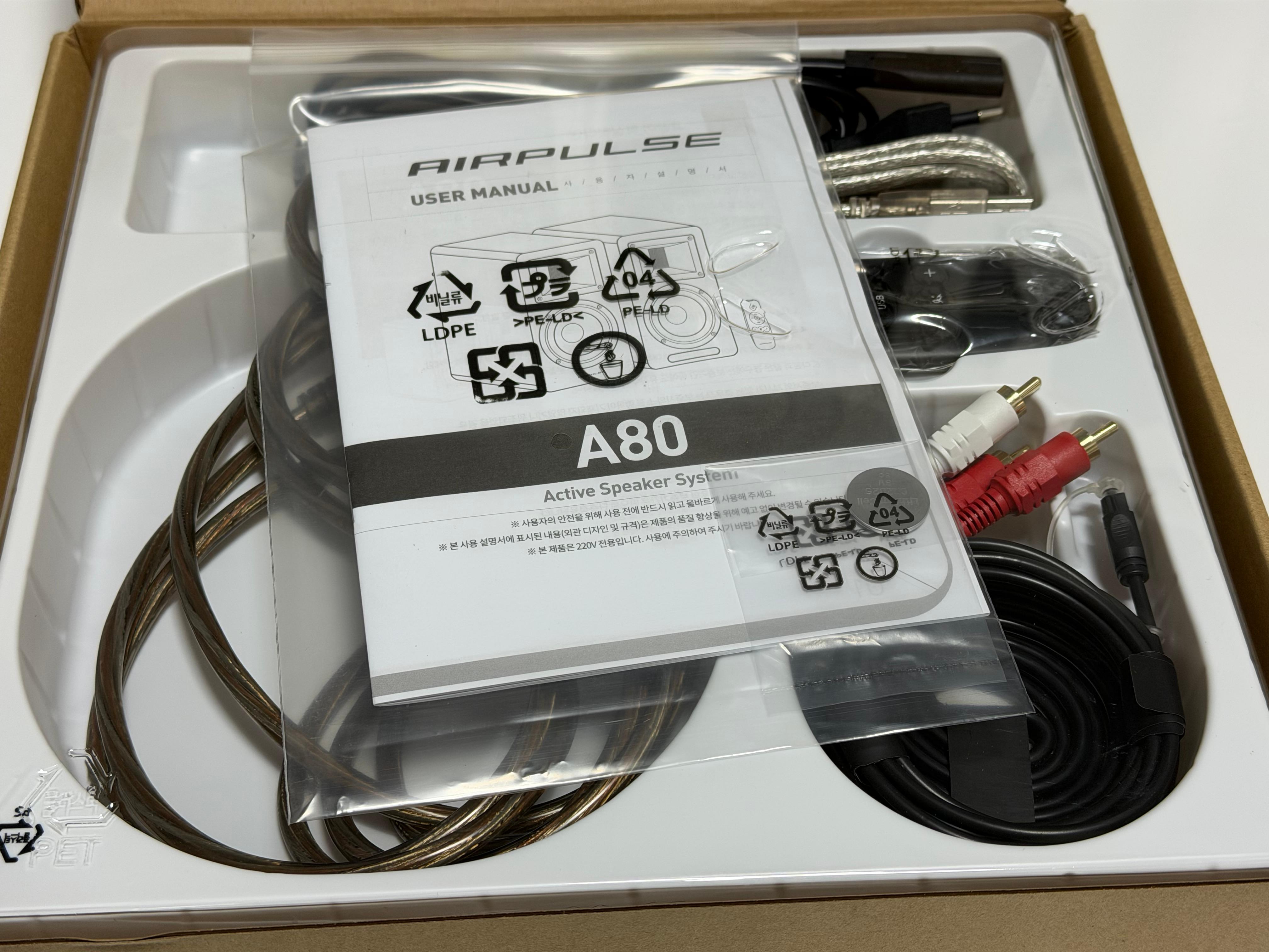 악세사리 박스에는 각종 케이블과 무선 리모트 콘트롤, 매뉴얼이 들어 있습니다. 케이블의 품질은 좋은 편이지만 좌우 스피커를 연결하는 케이블은 길이가 길어서인지 사진에서 본 것처럼 대충 돌돌 말아서 넣은 느낌입니다. 이건 왜 케이블링을 하지 않았는지 의아합니다. 다른 것들은 필요 이상으로 케이블링을 잘 해 놨음에도요. 3.5 to RCA, RCA to RCA 케이블까지 들어 있습니다.