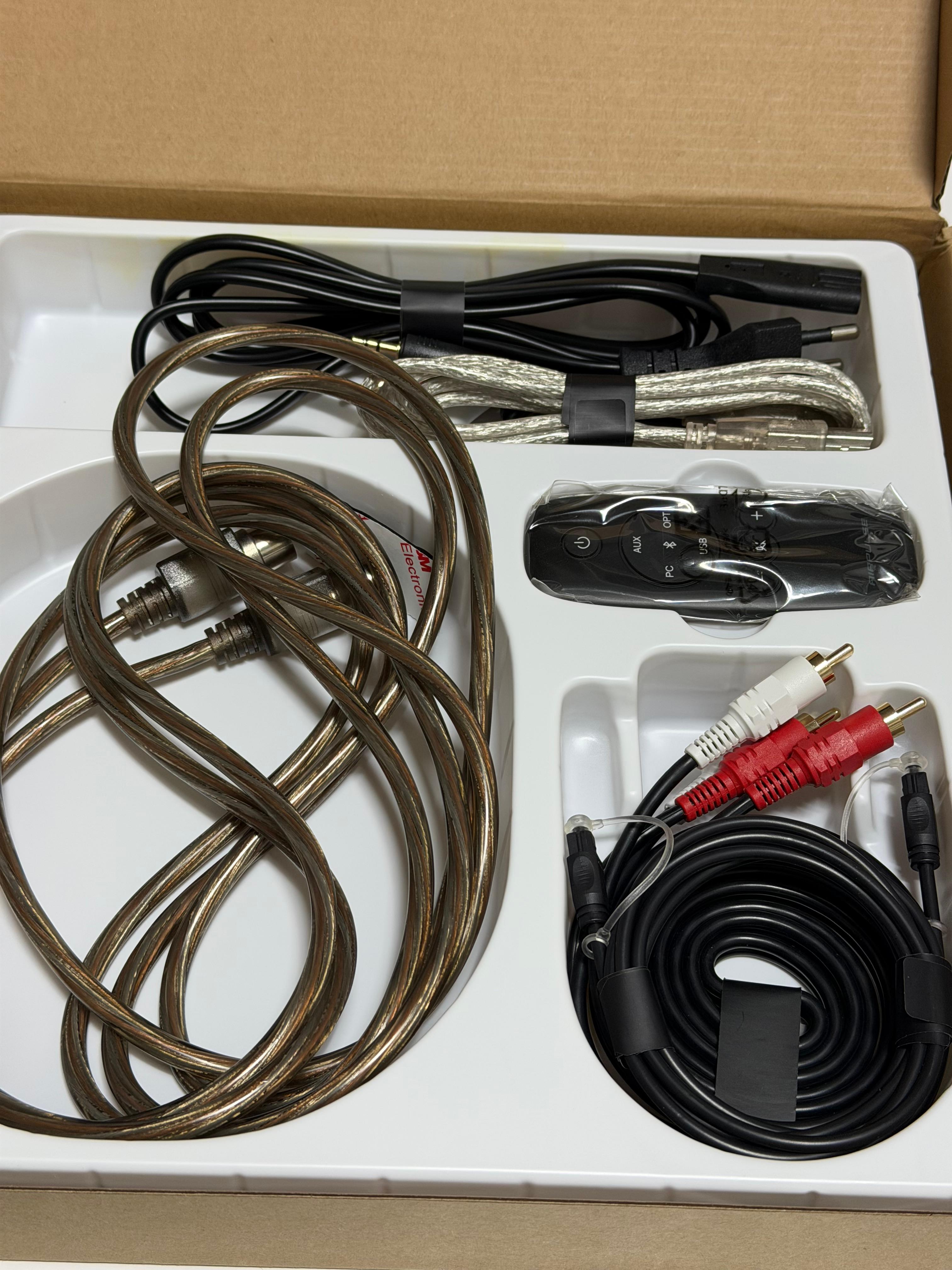 악세사리 박스에는 각종 케이블과 무선 리모트 콘트롤, 매뉴얼이 들어 있습니다. 케이블의 품질은 좋은 편이지만 좌우 스피커를 연결하는 케이블은 길이가 길어서인지 사진에서 본 것처럼 대충 돌돌 말아서 넣은 느낌입니다. 이건 왜 케이블링을 하지 않았는지 의아합니다. 다른 것들은 필요 이상으로 케이블링을 잘 해 놨음에도요. 3.5 to RCA, RCA to RCA 케이블까지 들어 있습니다.