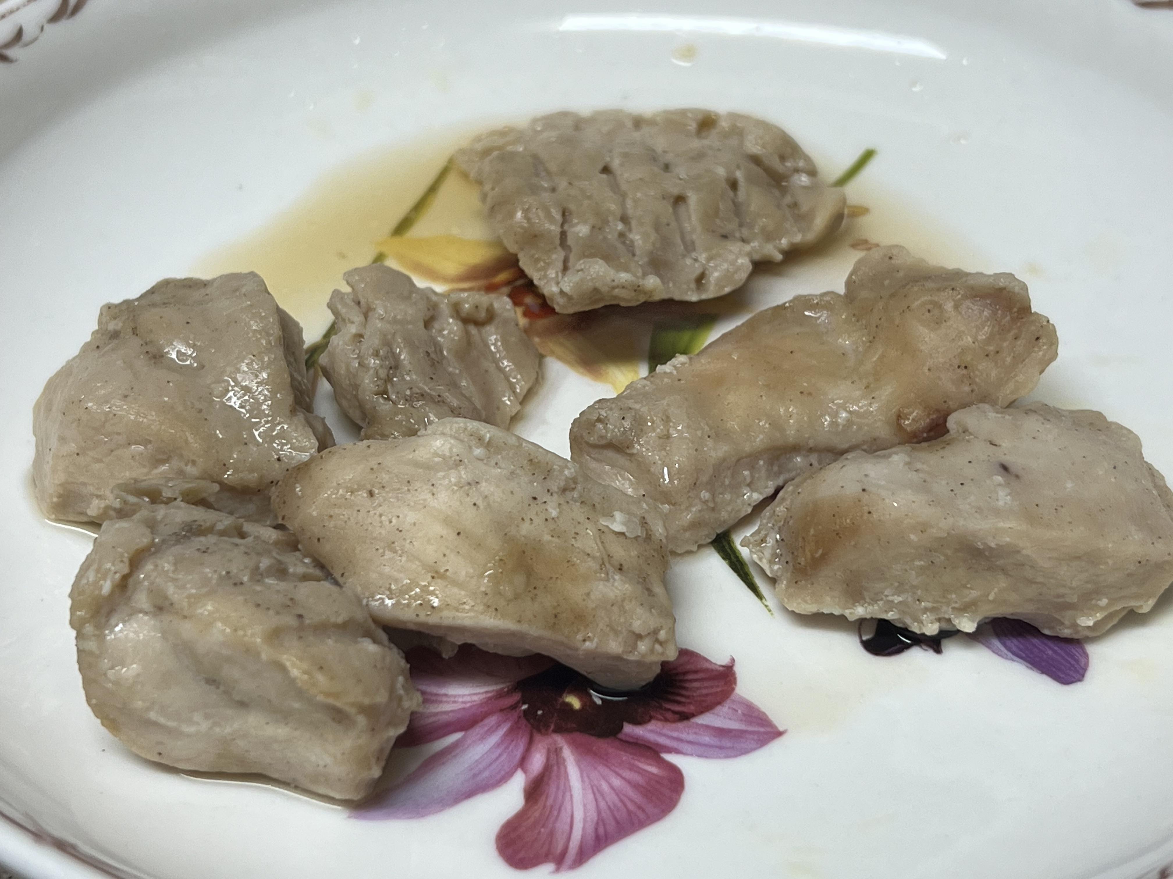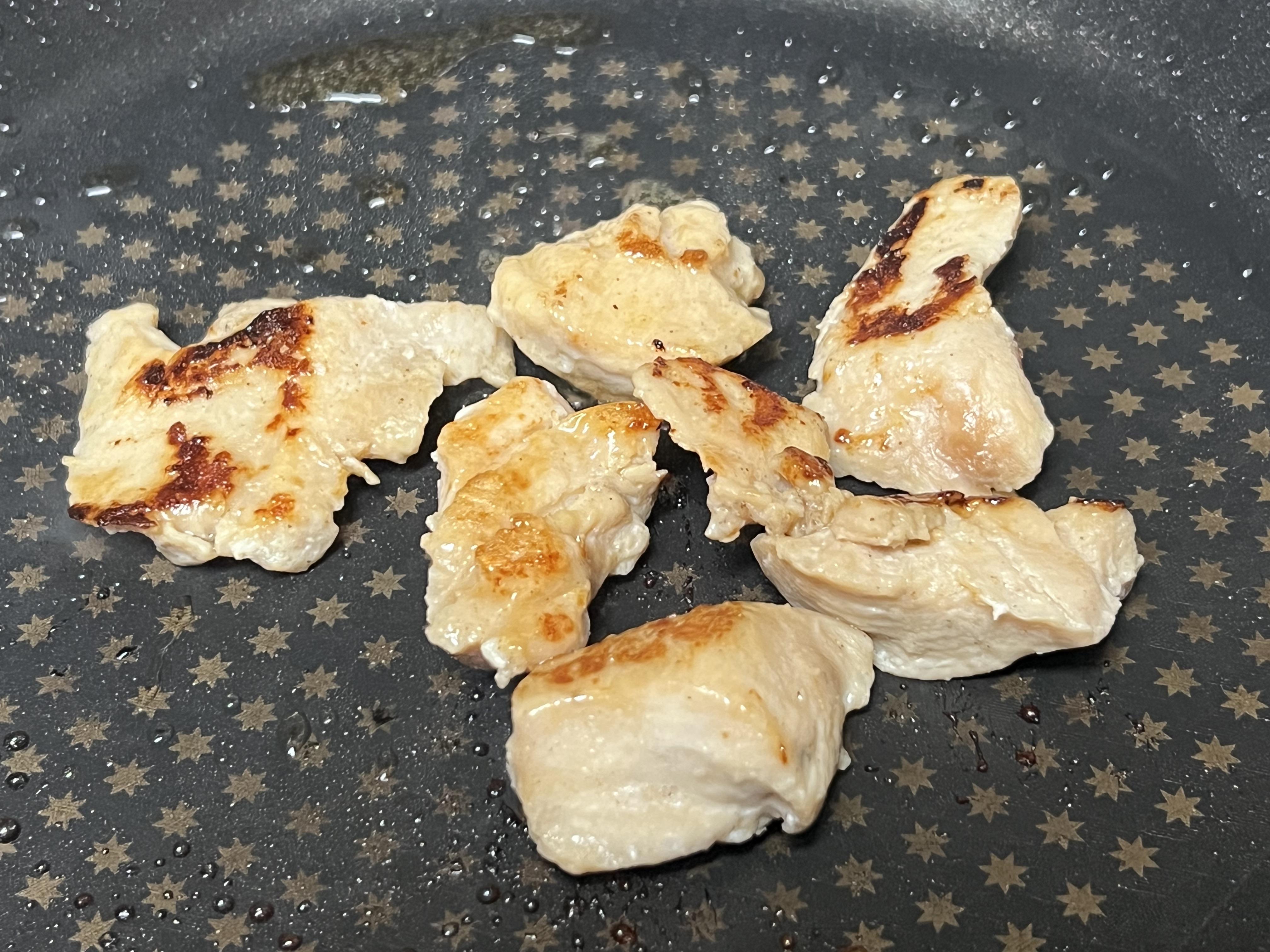 전자렌지에만 돌려서 먹어도 된다고 써있긴 하지만, 그럴 경우에는 닭고기 특유의 비린맛이 꽤 혀를 괴롭힙니다. 그래서 저는 프라이팬에 살짝 굽습니다. 굽는다기보다는 프라이팬에 튀기는 느낌이긴 하지만 그래도 이렇게 노릇노릇하게 구워내면 고기에서 감칠맛이 더해져서 먹기가 훨씬 편해집니다.