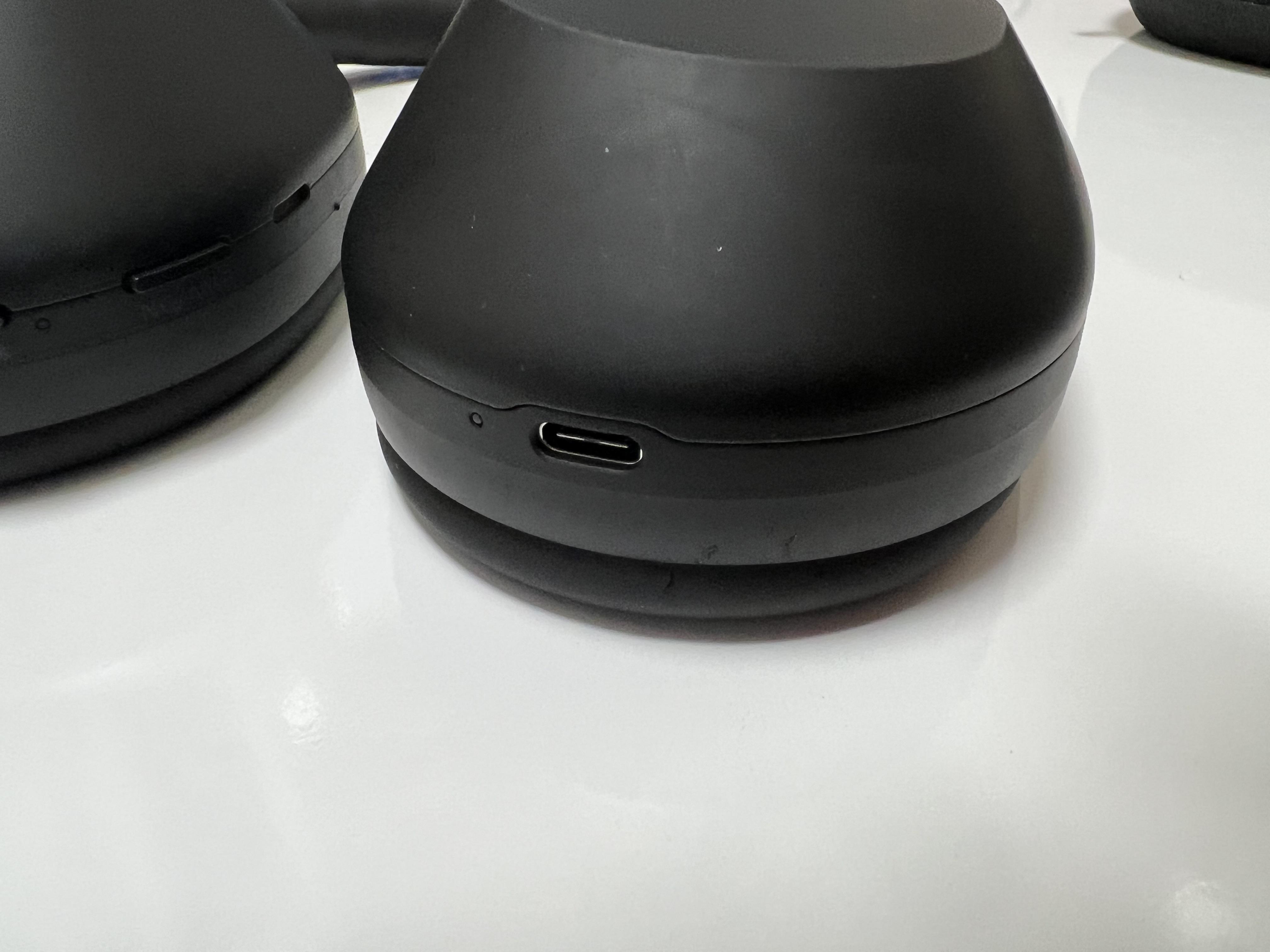 반대쪽에는 상대적으로 들어 가는 것이 적습니다. 충전을 위한 USB C 단자와 충전중임을 나타내는 LED가 위치하고 있습니다. 하지만 오른쪽 이어컵에는 터치센서가 있어서 터치센서를 통해 볼룸 업/다운, 임시정지/재생, 이전곡/다음곡 선택을 할 수가 있습니다. 터치센서는 엄청 민감한 편이어서 손으로 헤드폰을 벗으려고 할 때도 동작을 하곤 했습니다. 저는 그래서 헤드폰이든 이어폰이든 제발 터치센서 말고 물리버튼을 넣어 주었으면 좋겠습니다. 물론 이어폰의 경우는 워낙 면적이 적으니까 터치센서를 넣을 수밖에 없는 경우가 있을 수도 있지만, 헤드폰은 물리버튼이 확실히 오동작을 줄여 주는 장점이 있습니다.