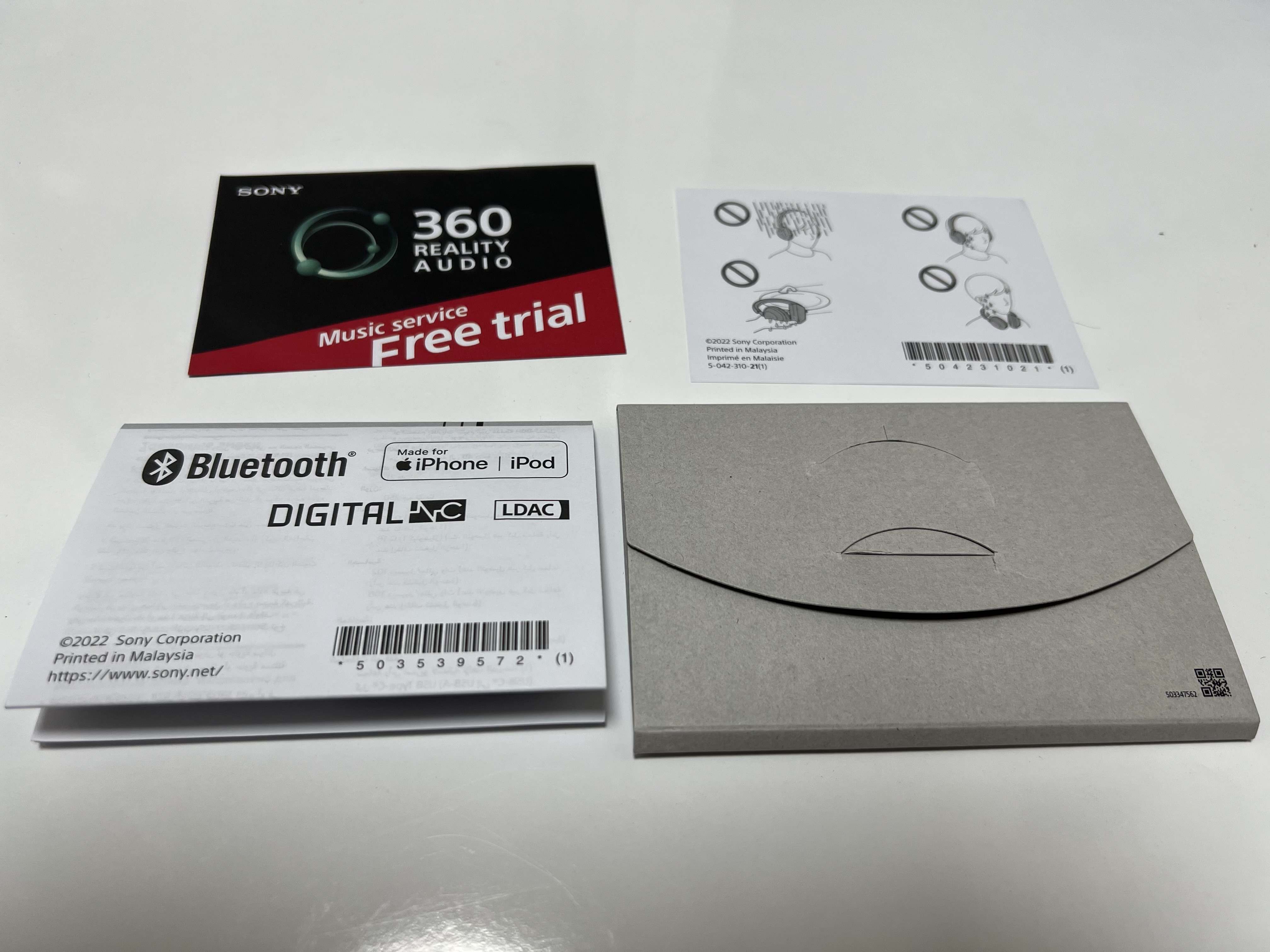 박스 안에는 퀵가이드, 360 리얼리티 오디오 음악 서비스 무료 체험권, 여러 금지사항이 그려 있는 종이가 별도의 종이 상자에 담겨져 있습니다. 360 리얼리티 오디오는 시도를 하지 않았습니다. 왜냐면 애플의 돌비 애트모스 음악도 아직 음원의 양이 절대적으로 부족해서 아쉬운데 괜히 들었다가 아쉬움만 더 커질 것 같았거든요. 에어팟3를 쓰면서 느꼈던 것은 하드웨어가 아무리 기능을 지원해도 음원이 따라가지 않으면 절대 그 기술은 성공할 수 없다는 거였습니다. 그래도 올해 출시되는 아이돌 음악은 돌비애트모스 녹음이 많이 되는 것 같긴 하더라고요. 근데 소니의 것은 요원하죠.