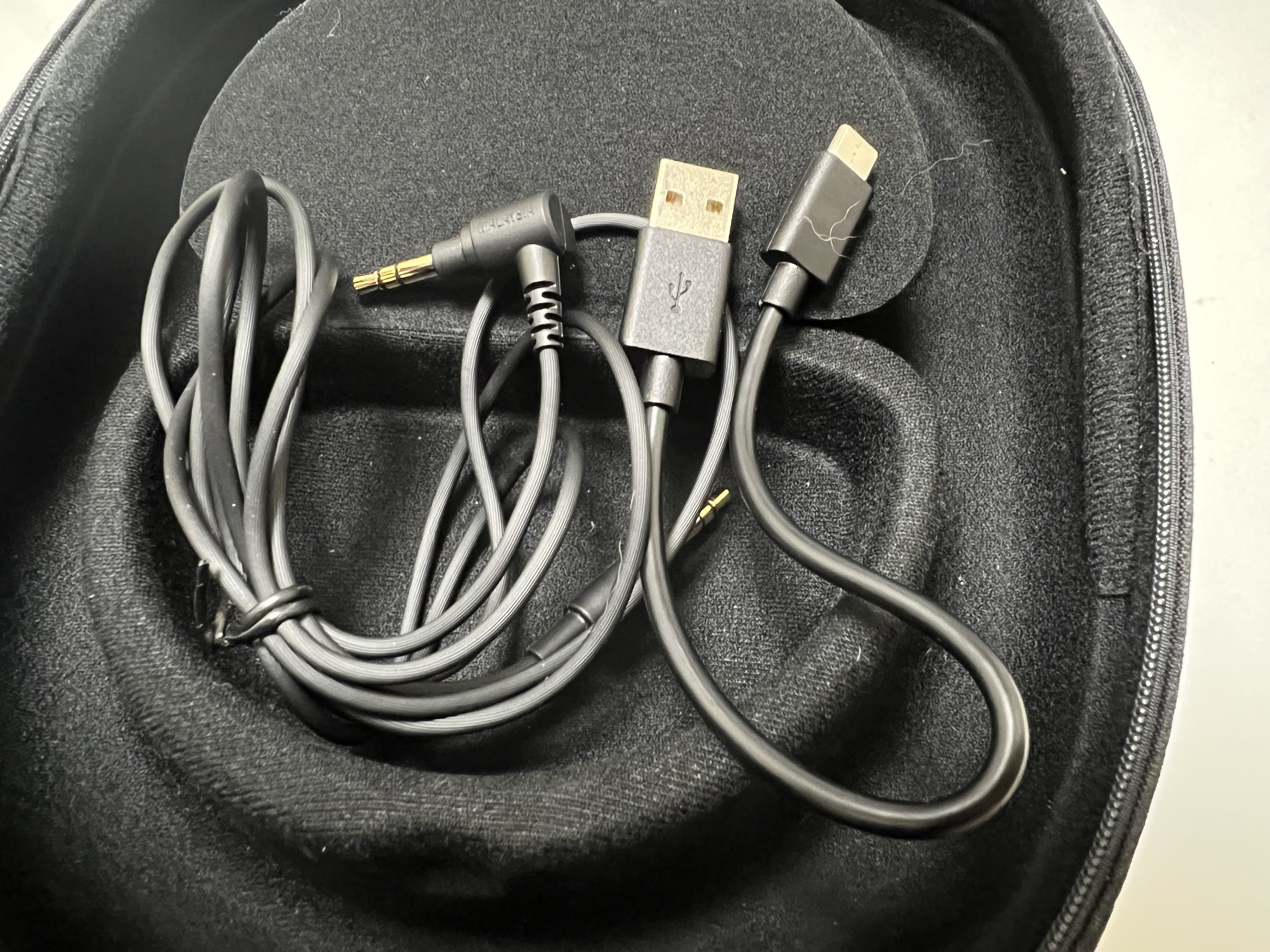 케이스의 수납공간은 자석으로 뚜껑을 여닫을 수 있습니다. 자석으로 케이스를 고정시킬 수 있도록 만든 것은 여러 모로 쓸모가 있습니다. 생각보다 자력이 강해서 뒤집어지는 것만으로는 케이블이 쏟아질 일은 거의 없을 것 같습니다. 수납공간에는 3.5mm 케이블과 USB A to C 케이블이 들어 있는데, USB 케이블은 지나치게 짧다는 생각이 듭니다. 충전기로부터 전원을 공급받는 경우에는 크게 문제가 되지 않을지 몰라도 컴퓨터의 USB 단자를 통해 전원을 공급 받는 경우에는 정말 짧다는 생각이 들 겁니다. 이 부분은 좀 여유 있는 길이의 케이블을 넣어 주는 게 어떨까 하는 아쉬움이 있습니다.