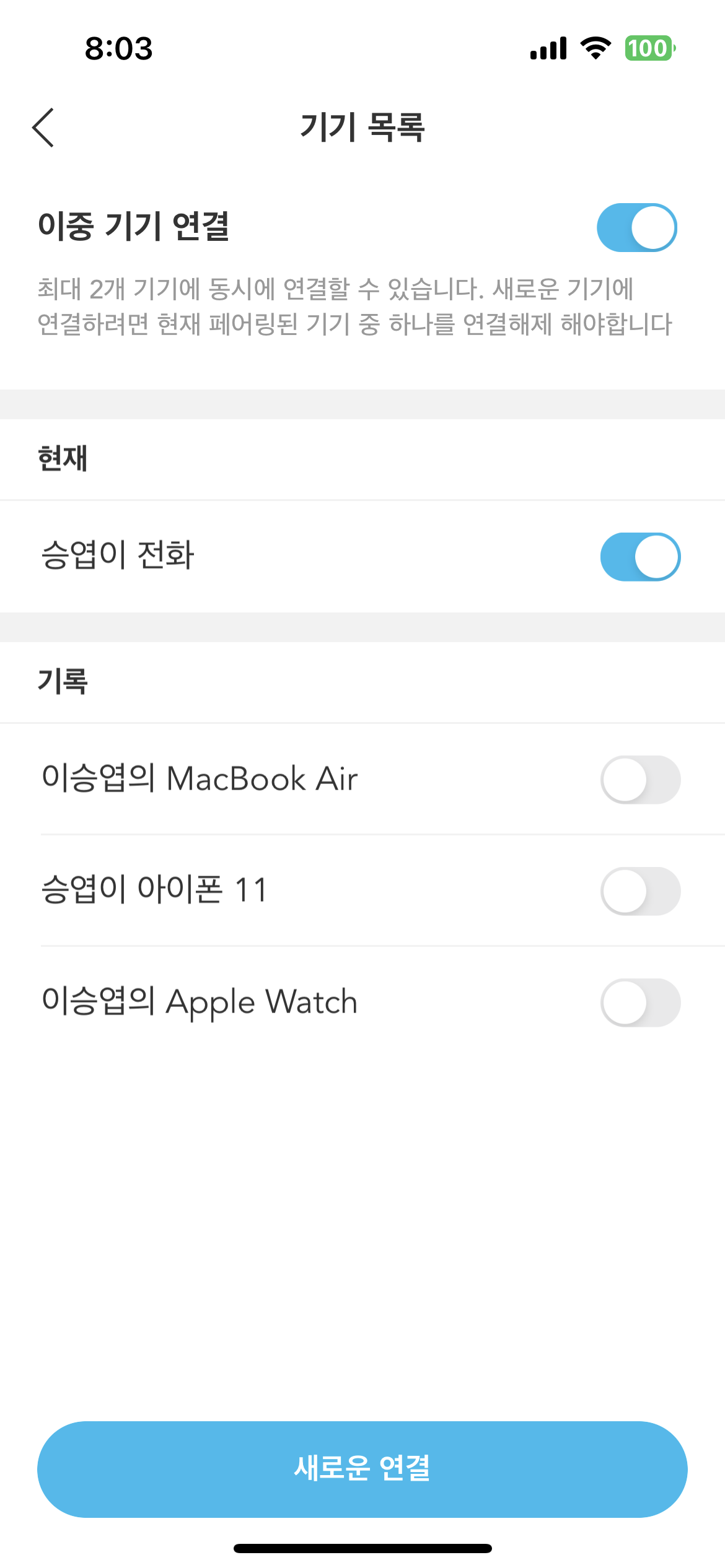 리버티 3 프로는 멀티 포인트 페어링을 지원합니다. 앱 스샷에는 3개가 연결이 되어 있지만 실제로는 가장 최근에 연결한 두 대, 즉 위 화면에서는 맥북에어와 아이폰에만 연결이 되고, 애플워치에는 연결이 안 됩니다. 그건 뭐 다른 블루투스 이어폰/헤드폰에 공통적인 부분이니 특별히 문제랄 것은 없습니다. 약 3초 정도의 딜레이가 있긴 하지만 맥북에어에서 아이폰으로, 또 그 반대로도 연결이 매끄럽게 진행이 됩니다. 다만 가끔 맥북에어에서 사용하다가 전화가 오면 아이폰에서 통화연결 후에 리버티 3 프로가 아닌 아이폰 기본 통화모드로 연결되기도 합니다. 특정 조건이 있는 건 아닌 거 같은데 간혹 그런 증상이 있더군요.