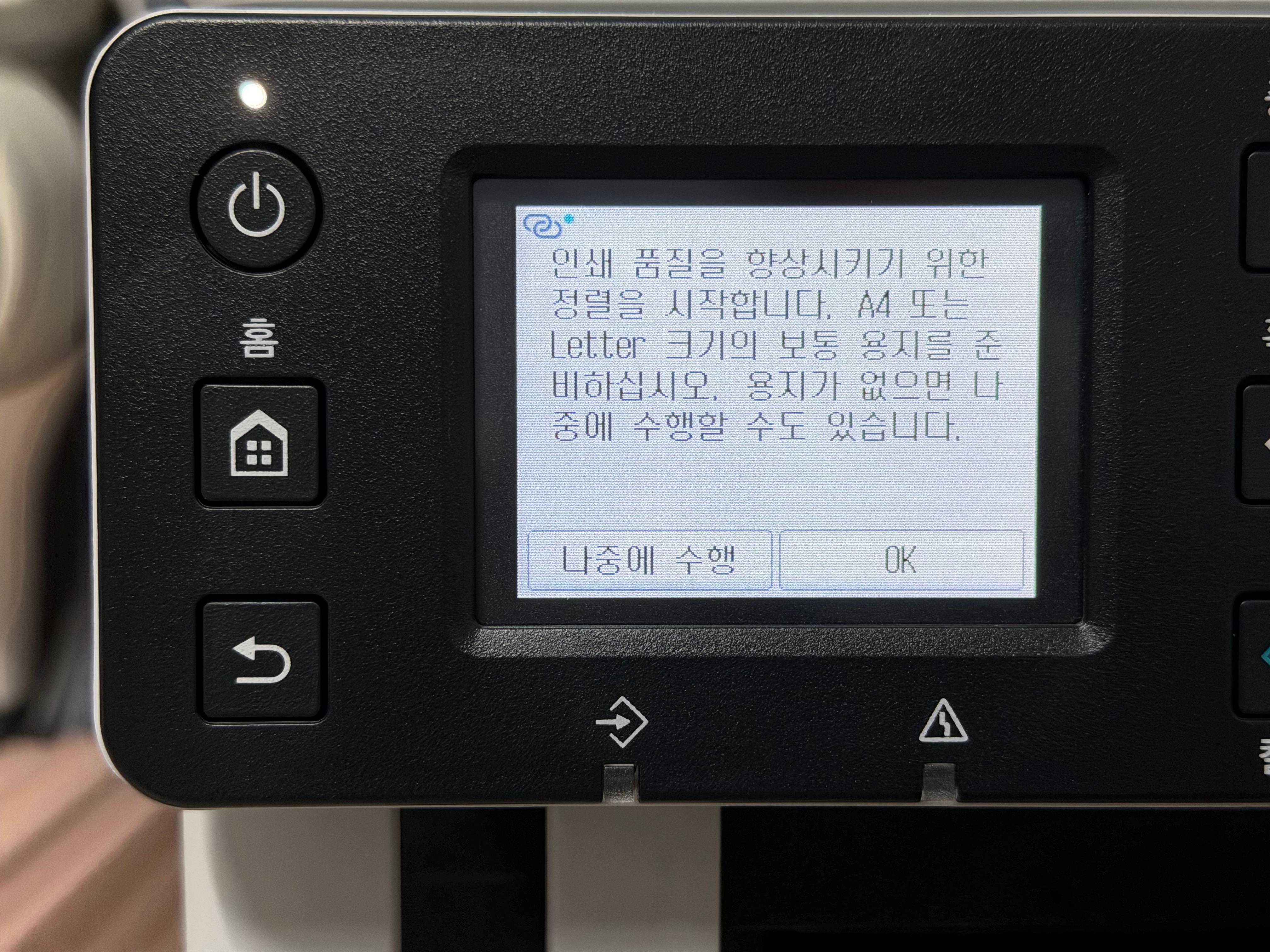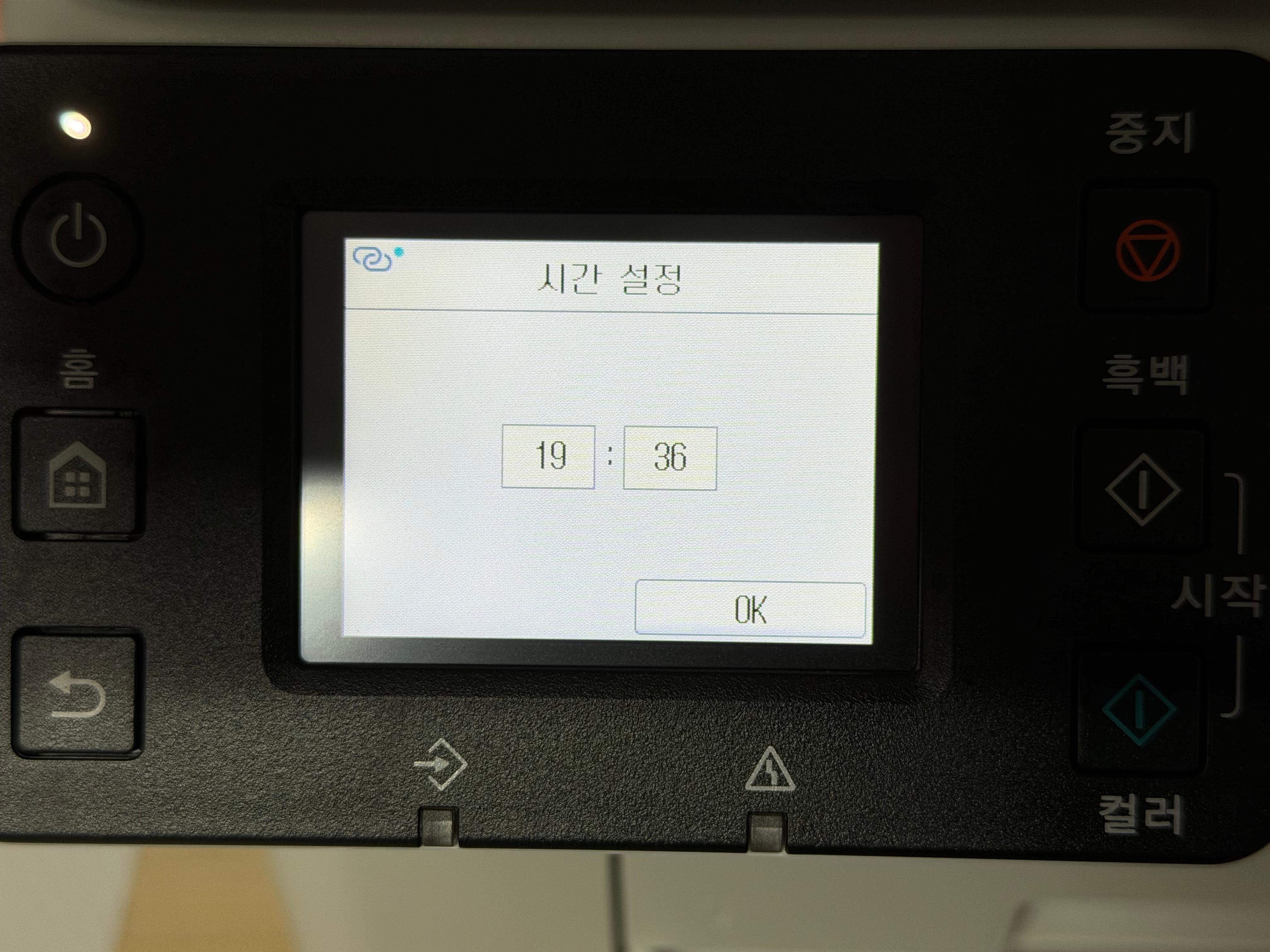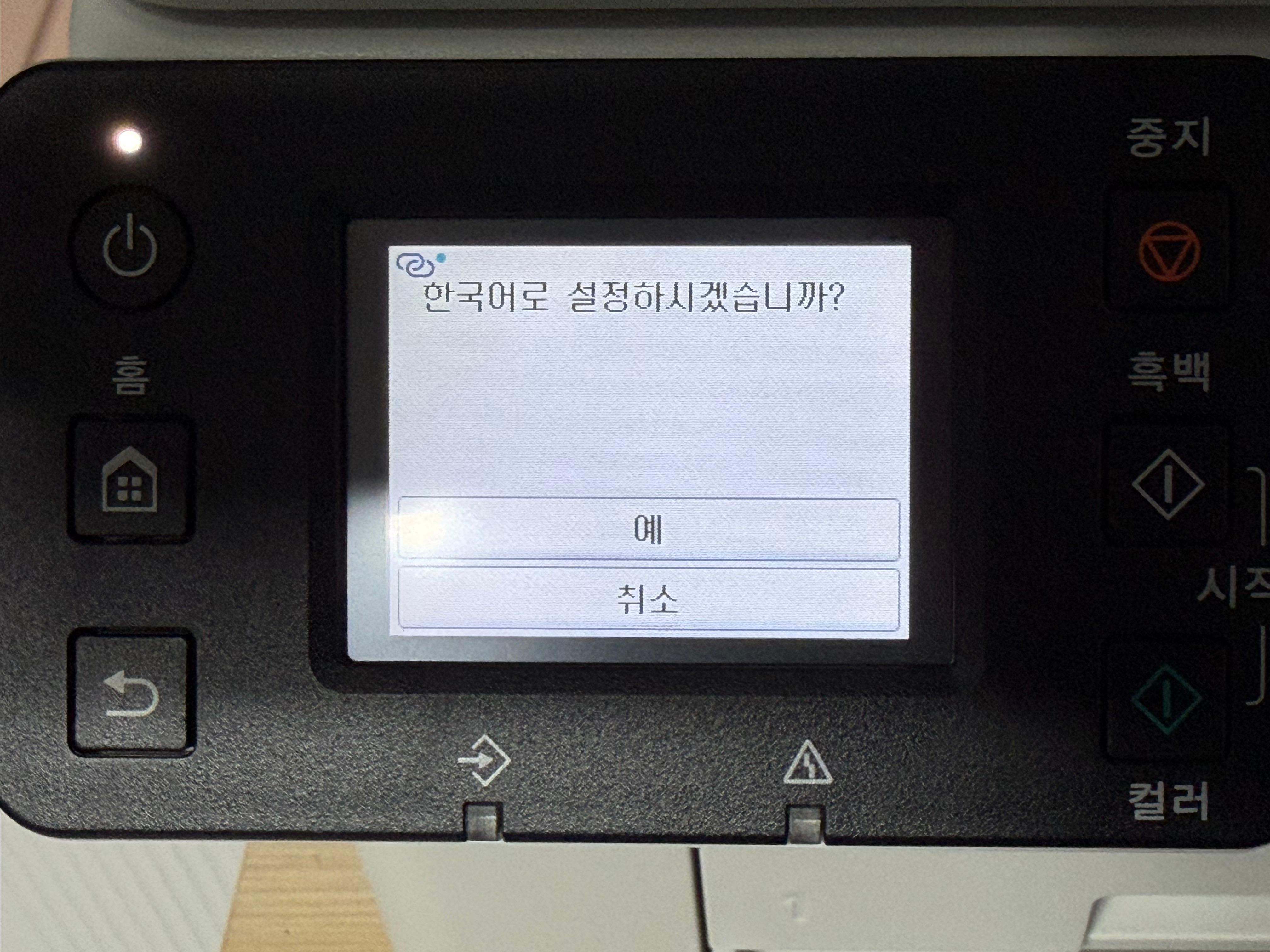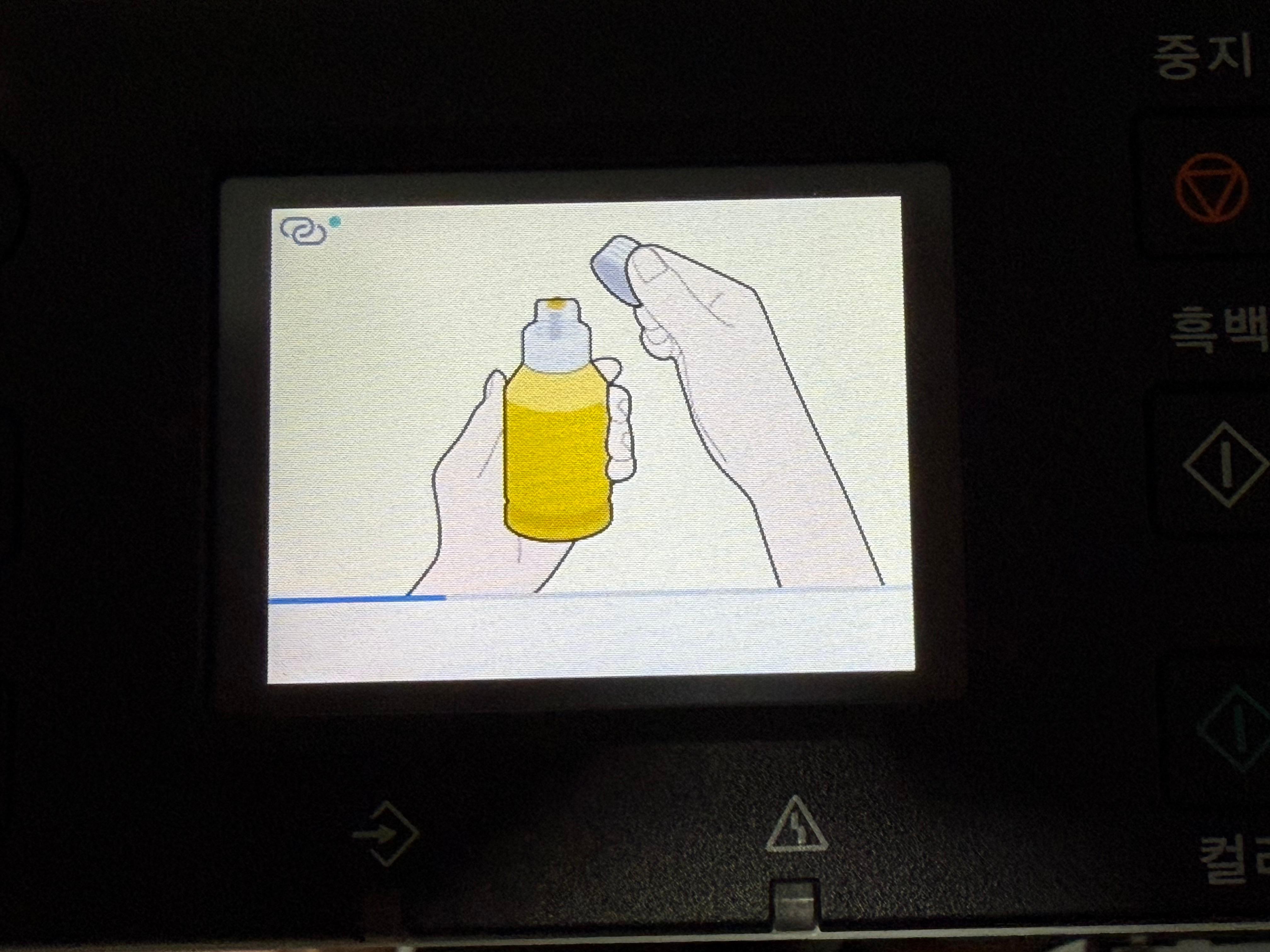 제품의 전원을 연결하고 전원 버튼을 누르면 언어선택에서부터 날짜, 시간 등을 설정하고 바로 잉크 주입을 요구하는 화면으로 넘어갑니다. 한글을 지원하기 때문에 설정에 어려움은 없습니다.