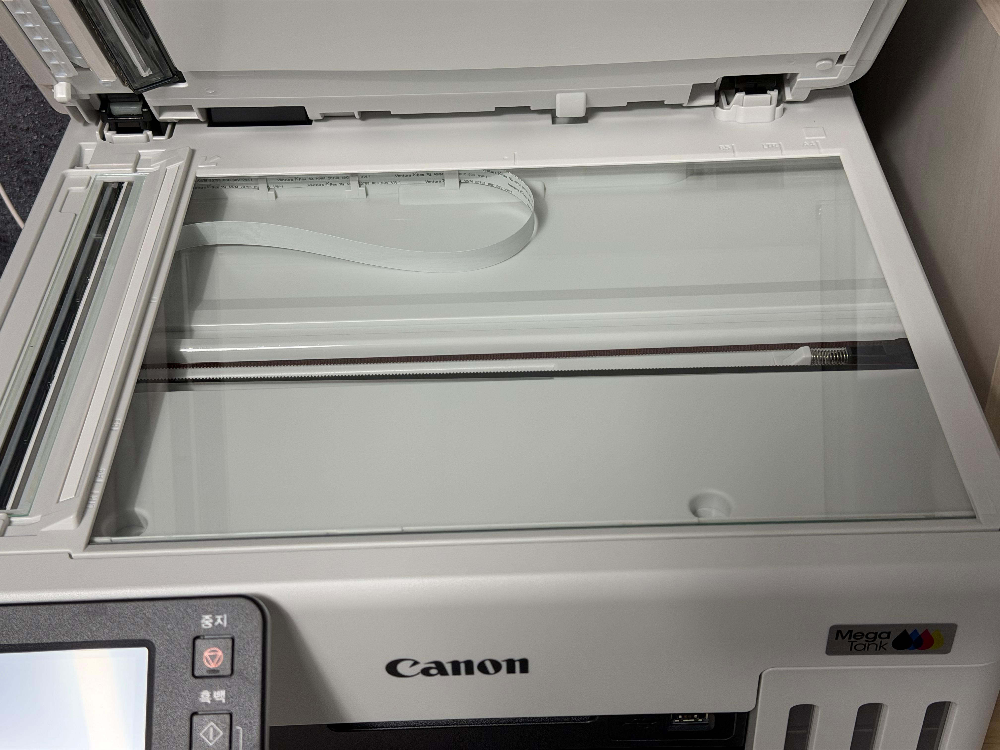 제품 상단을 들어 올리면 잉크를 주입할 수 있는 공간이 좌우에 있습니다. 제품 뒷면에는 전원 케이블 단자, USB B 단자, 팩스 연결 단자 등이 있습니다만 와이파이 네트워크 기능을 지원하기 때문에 USB 케이블을 굳이 연결할 필요는 없습니다. 다만 몇몇 공공기관에서는 와이파이 상에서 프린트를 할 수 없도록 되어 있기도 해서 USB 케이블이 필요하긴 합니다. 보안을 위해서라고는 하지만 과연 그런 걸로 보안을 지킬 수 있는지는 잘 모르겠습니다. 그런 거 아니어도 여기저기 개인정보는 충분히 털렸기 때문에....