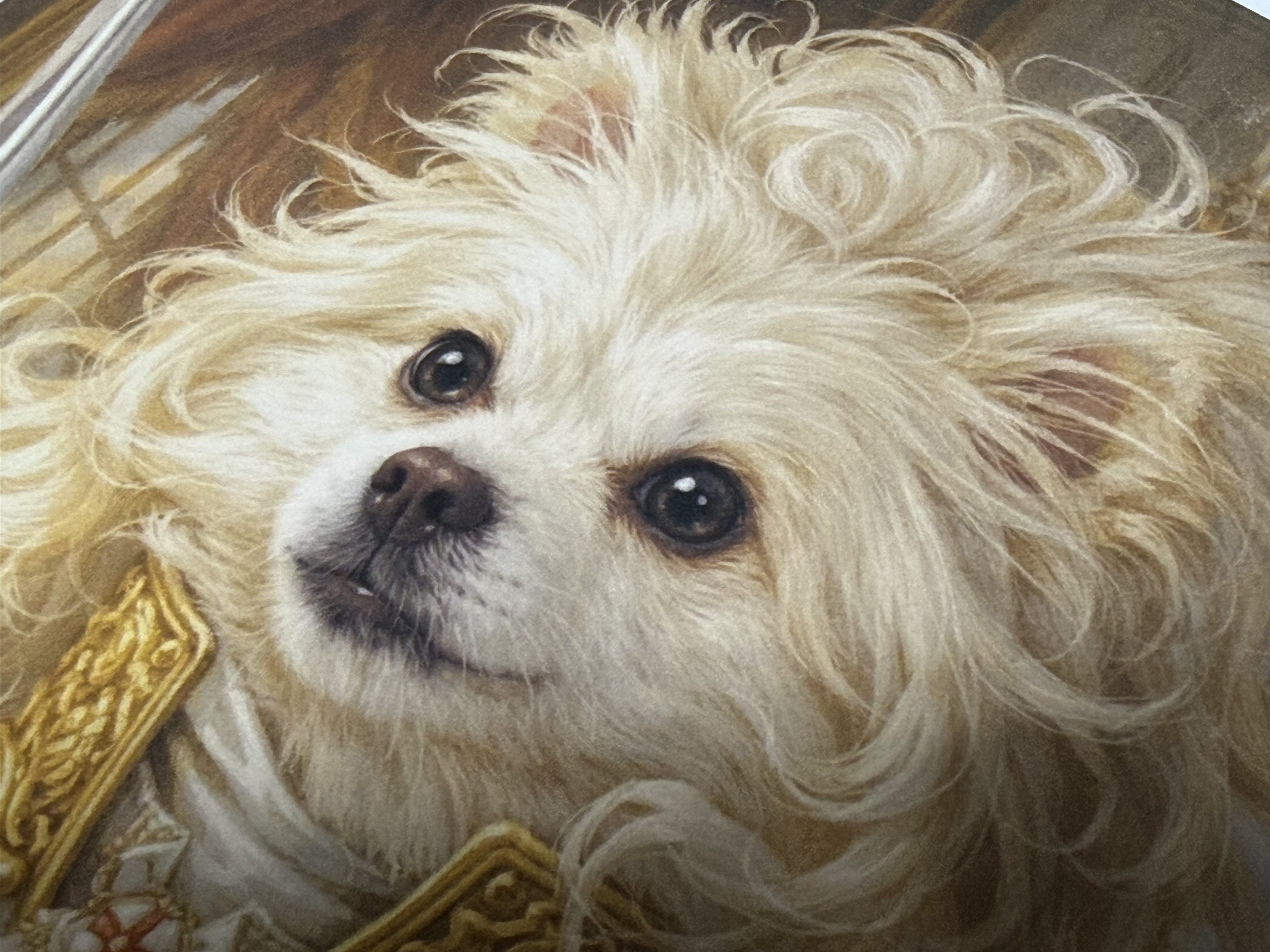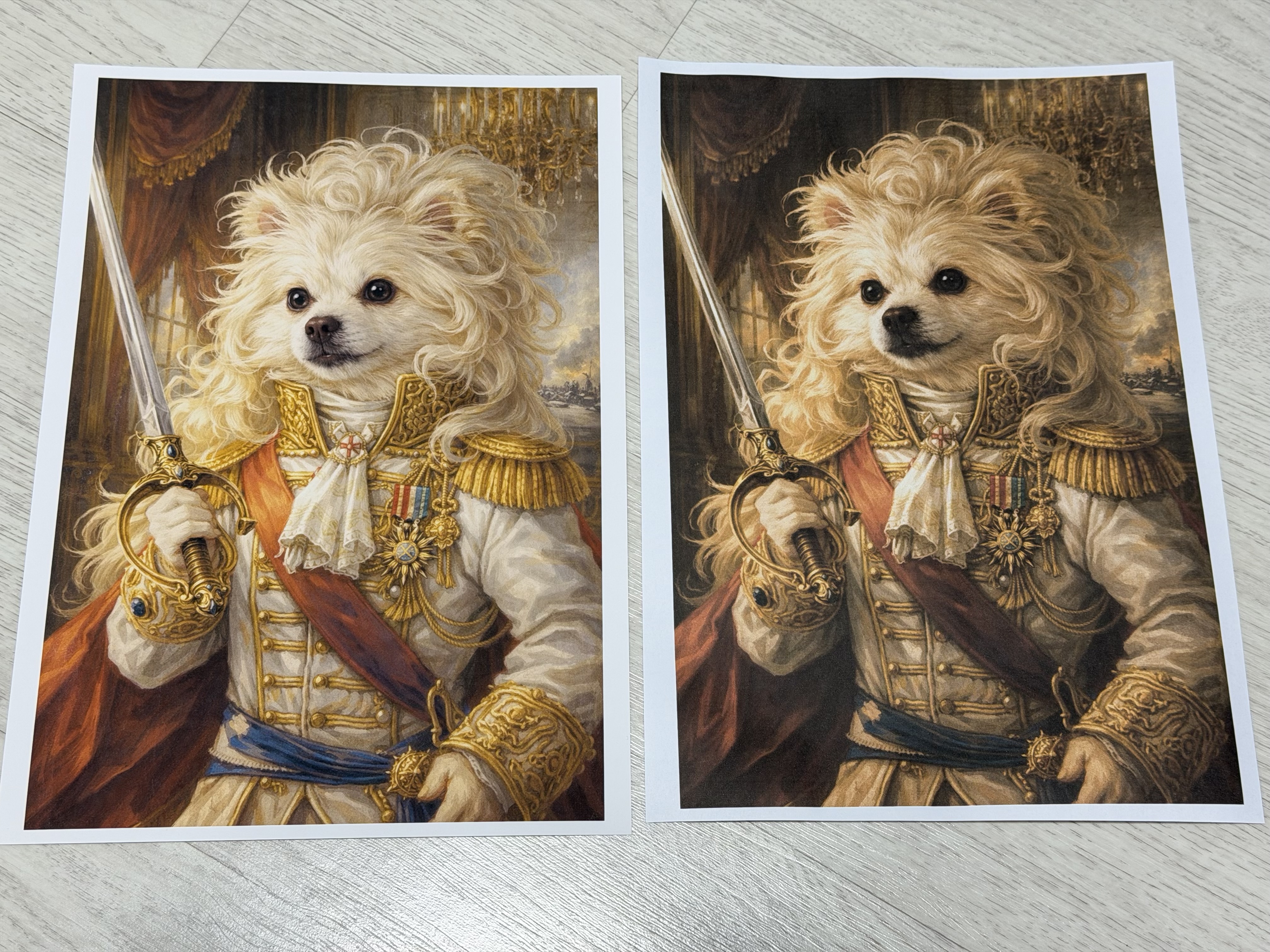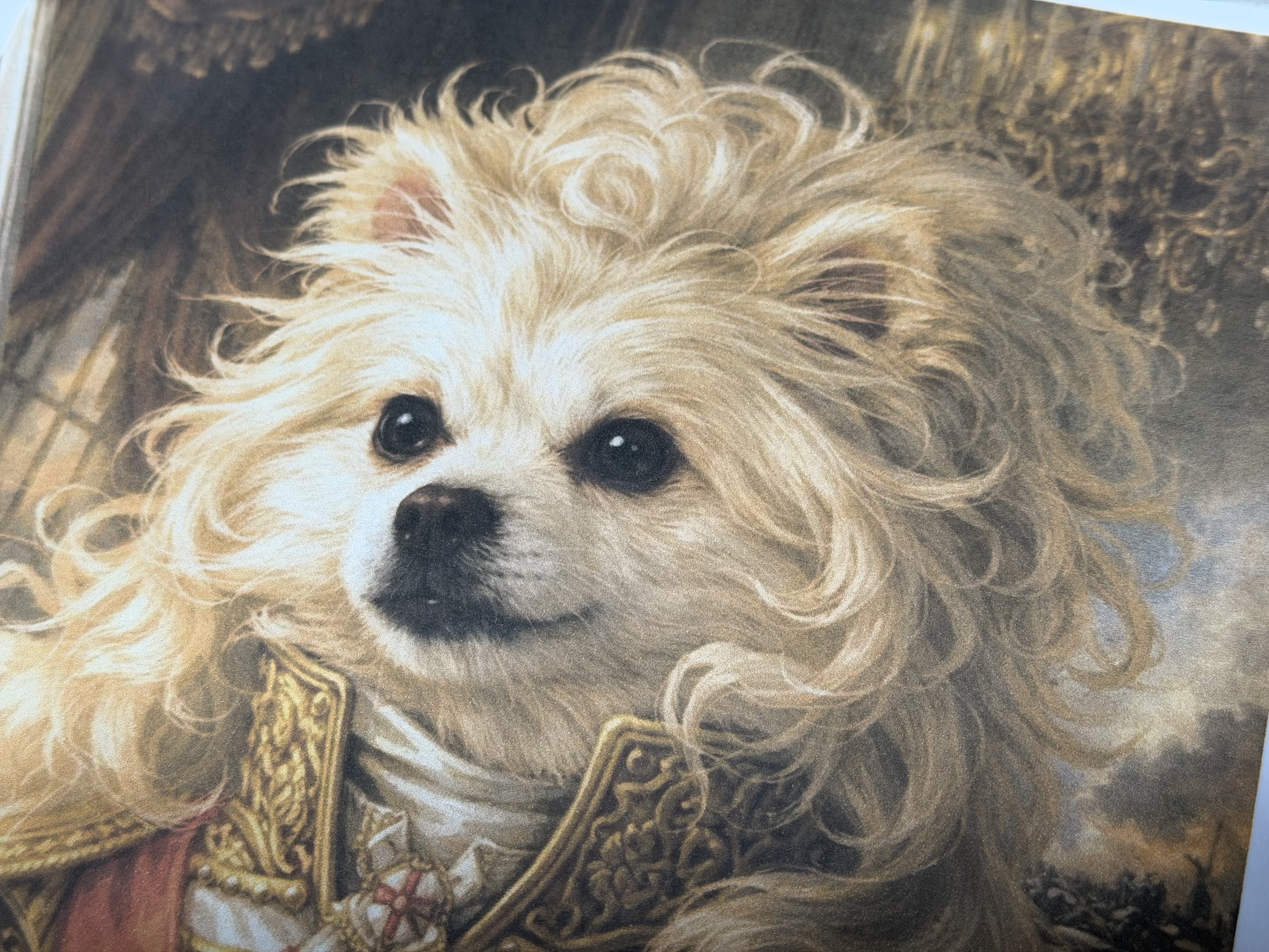 인쇄된 그림의 일부분을 확대해 보면 왼쪽의 매트 포토용지에 인쇄된 강아지의 눈동자의 디테일이 살아 있고, 눈가의 갈색 테두리가 원본 그림에 아주 가깝습니다. 코끝의 광택 역시도 잘 살아 있고, 코와 입 전체적인 디테일이 눈에 띄게 차이가 나는 것을 확인할 수 있습니다. 오른쪽 A4용지의 그림에서는 입과 코가 그냥 거의 검은색으로 나오고 있지만 왼쪽 매트 포토용지에서는 갈색 과 검은색, 흰색 등이 구분이 잘 되고 있습니다. 전체적인 털 색깔도 흰둥이와 누렁이 정도로 차이가 납니다.