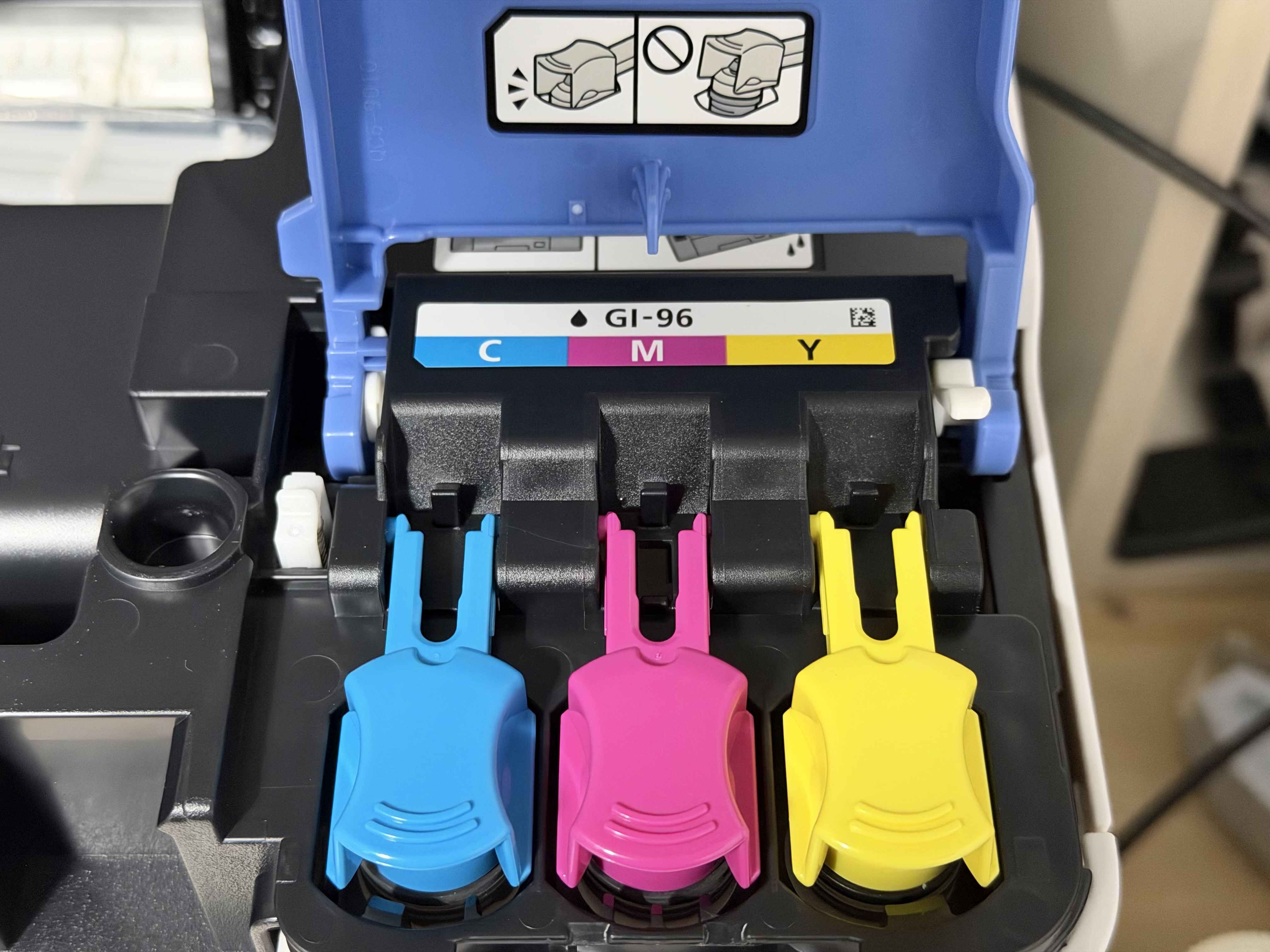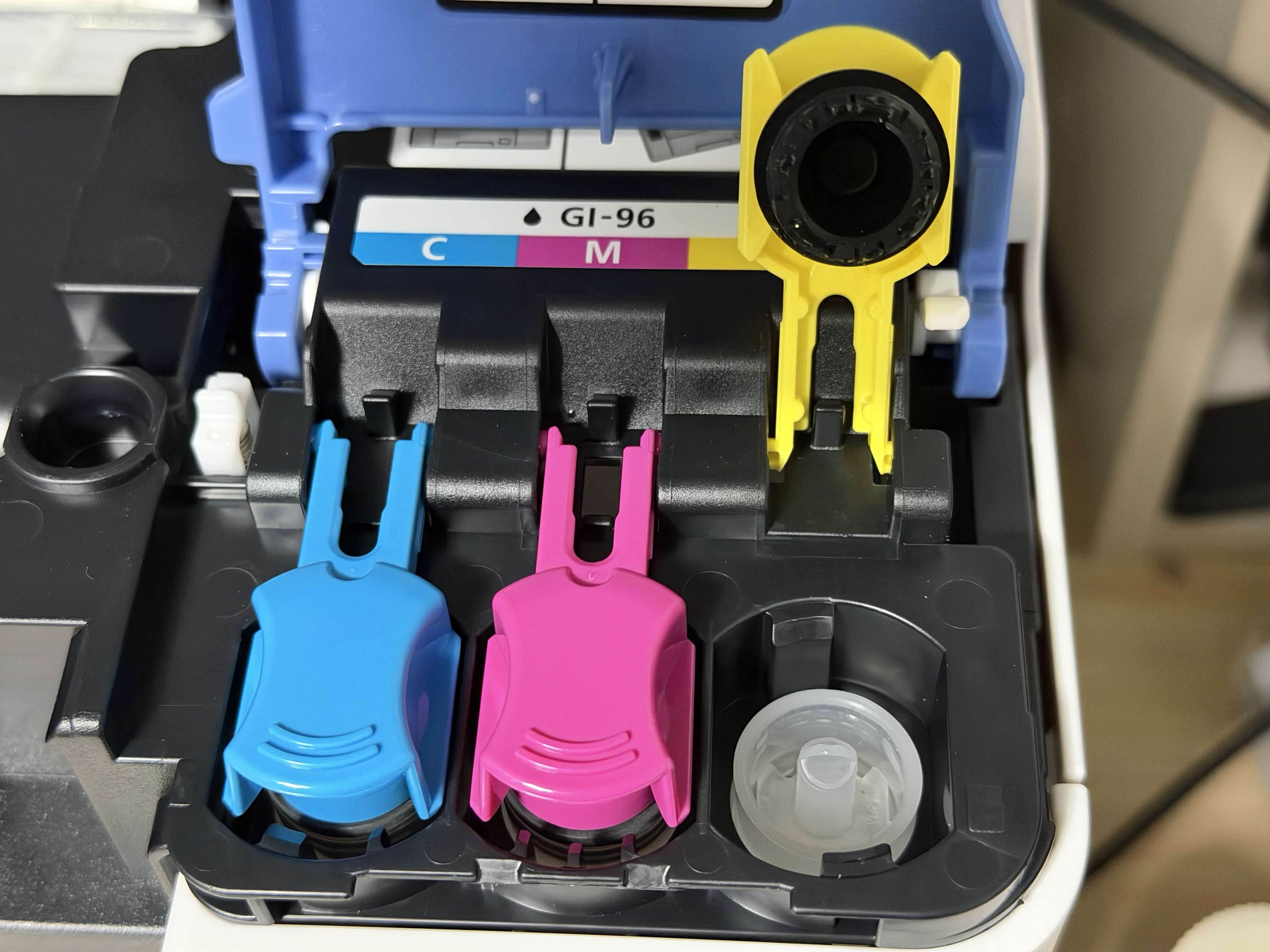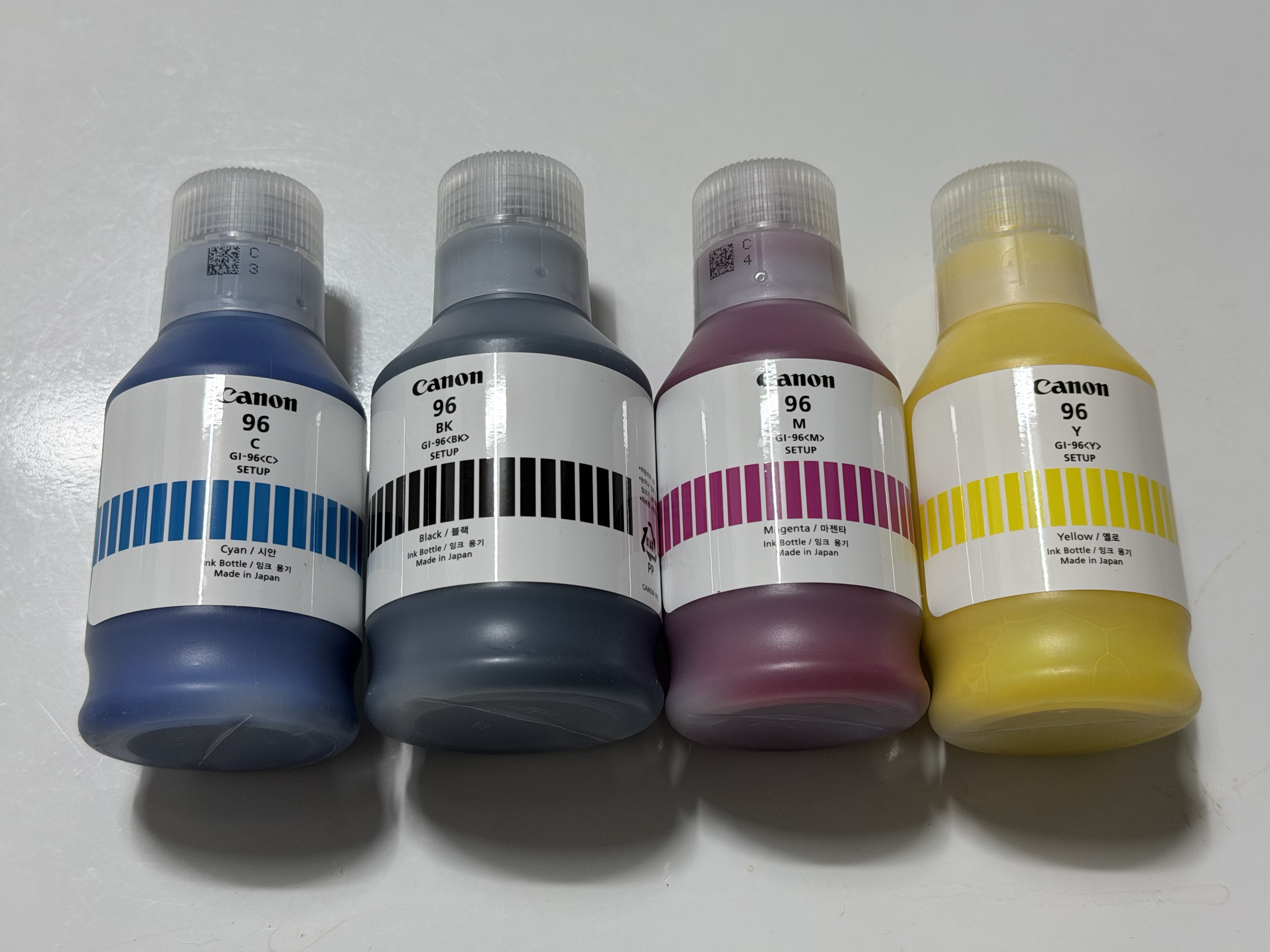 캐논 GX7192의 잉크는 검은색, 옐로우, 마젠타, 시안 색상이며, 4색 모두 안료잉크입니다. 안료 잉크는 그전까지 사용되던 염료 잉크와 달리 물에 번지지 않으며, 내구성이 좋습니다. 다만 인쇄 품질이 염료에 비해서는 떨어진다고들 합니다. 그래서 포토 프린터에서는 사용되지 못합니다만, 집이나 사무실에서 쓰기에는 부족함이 없습니다. 집에서 포토 프린터 레벨로 인쇄할 일은 그리 많지 않은 데다가 안료잉크로 프린트한 것도 충분히 볼 만하기 때문입니다.