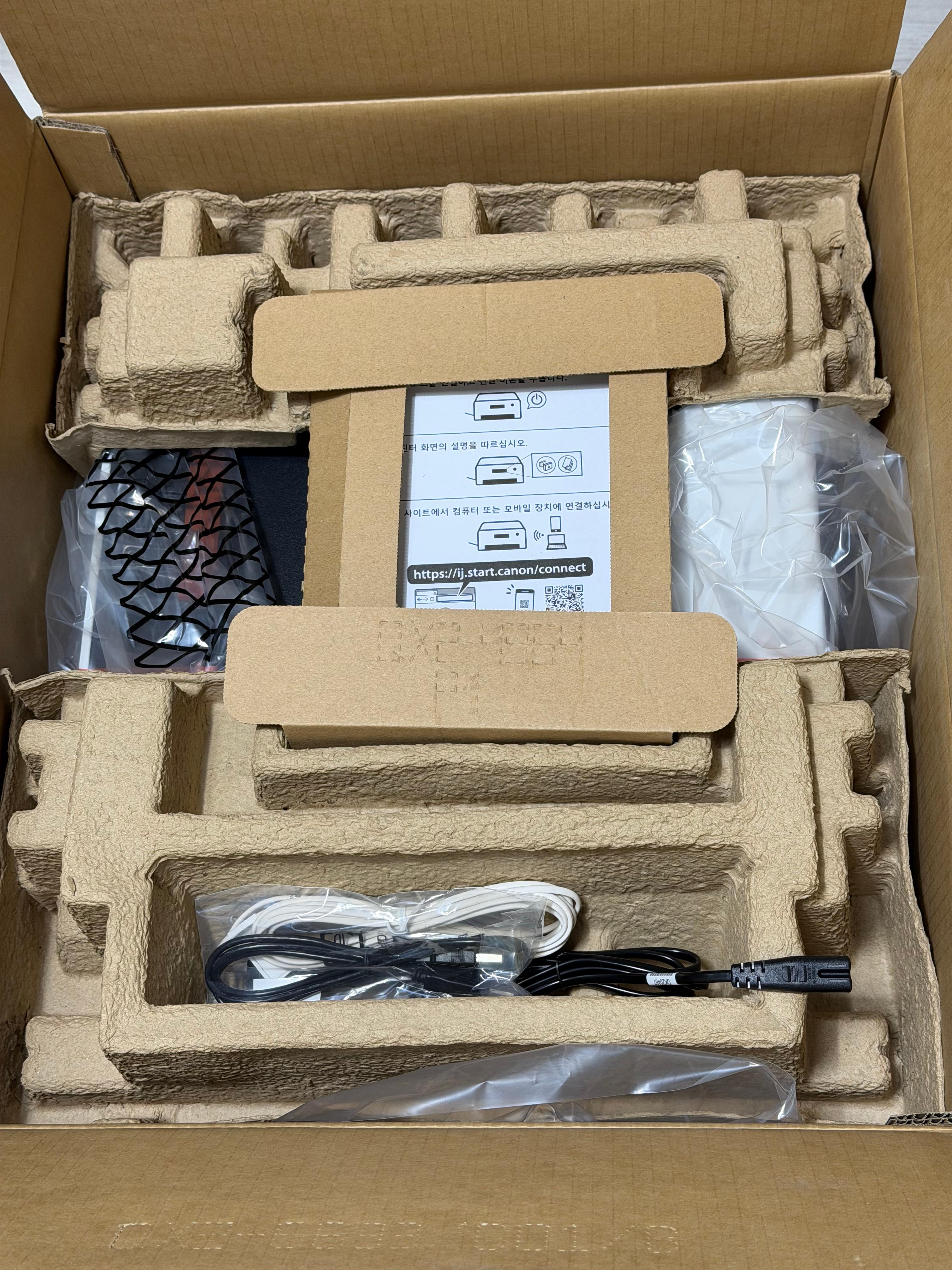 상자 안에는 다양한 문서들이 들어 있고, 전원 케이블, USB B to C 케이블, 전화 케이블이 들어 있습니다. 전화 케이블은 팩스 연결 시에 사용할 수 있습니다.