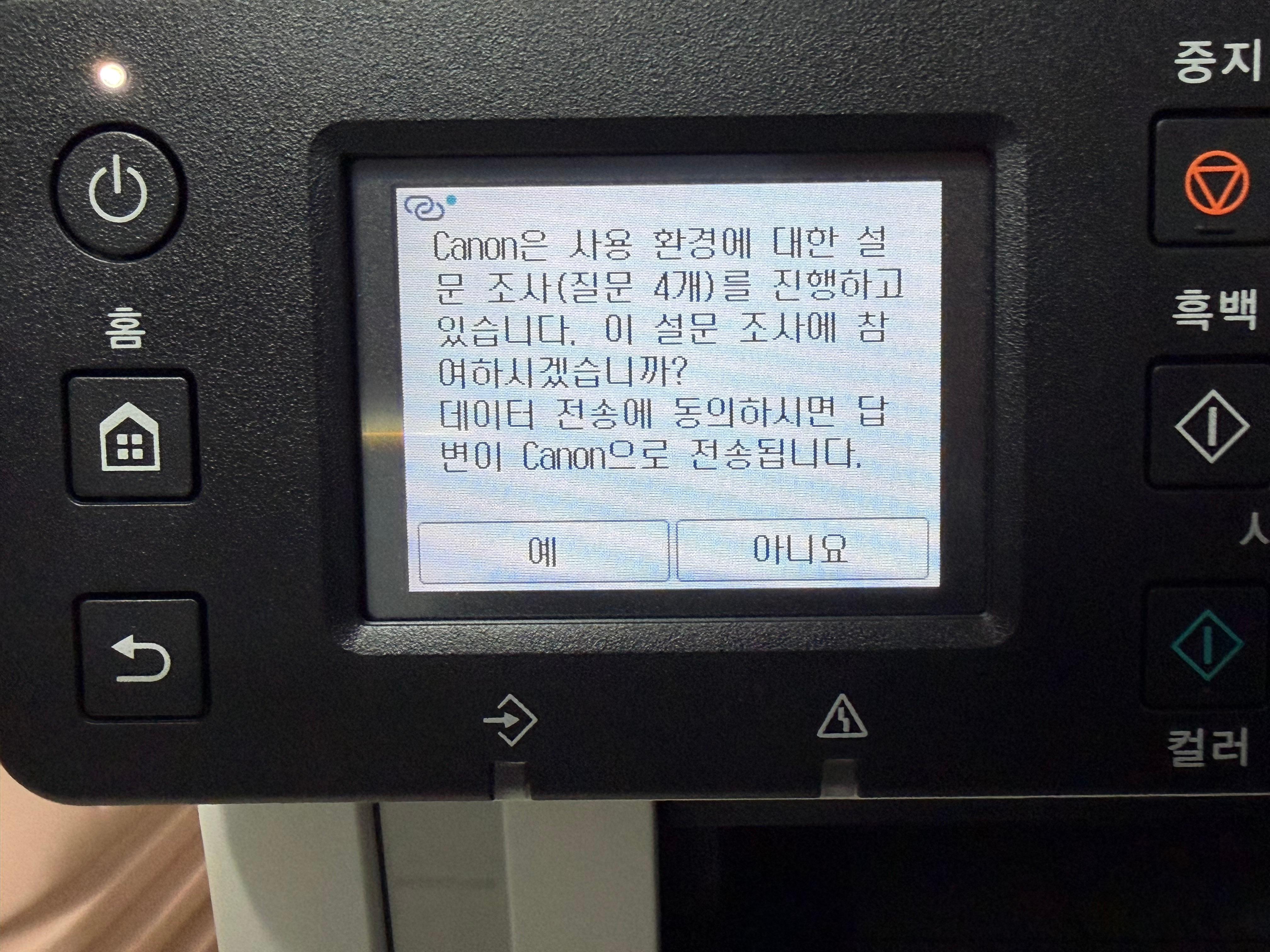 시험 인쇄가 끝나면 무슨 설문조사까지 하시겠다는 캐논입니다. 가뜩이나 오래 기다렸는데 그 상태에서 설문조사 물어 보면 참 좋은 결과가 나올 것 같습니다.