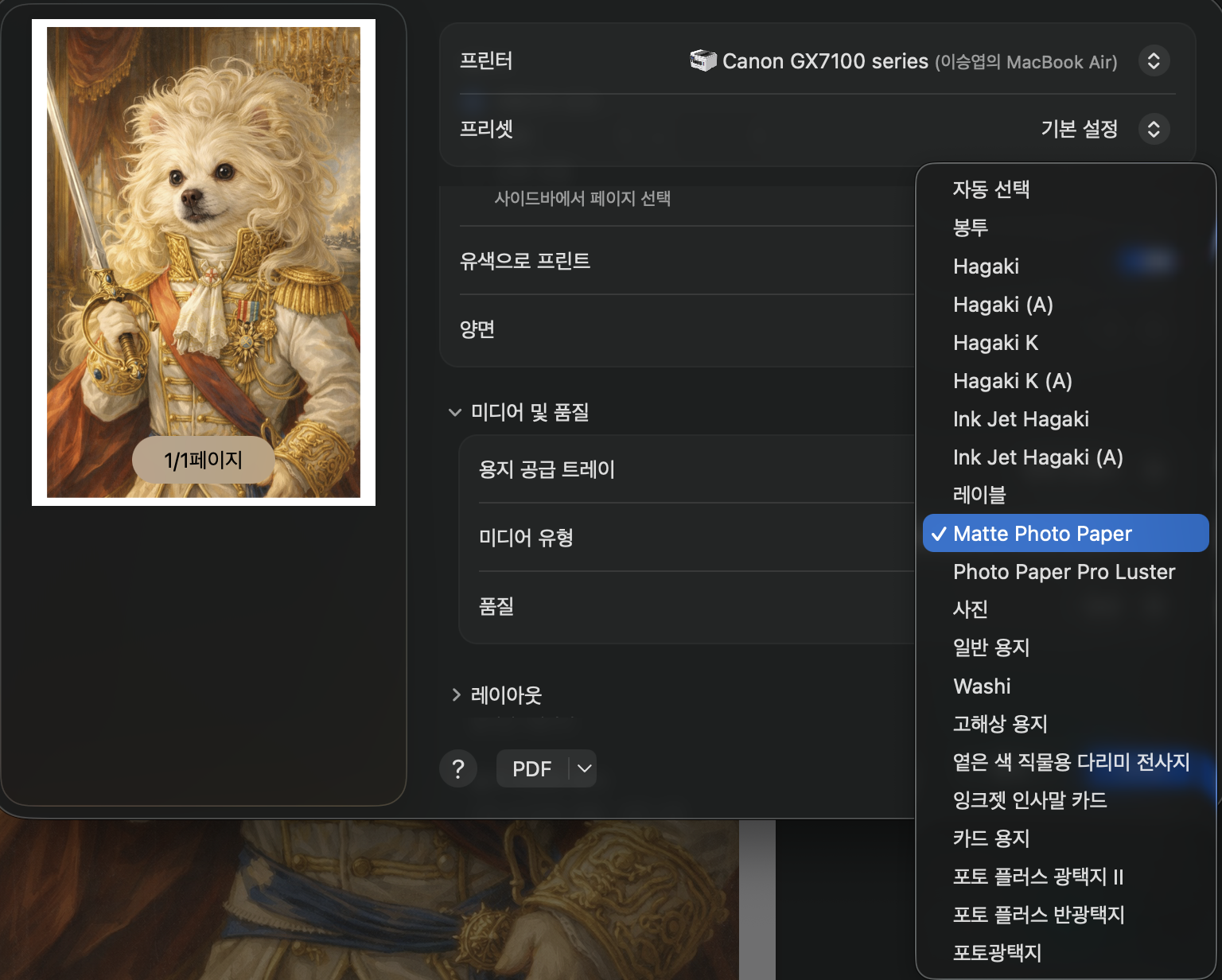 한 장은 80gsm 짜리 DoubleA A용지로, 다른 한 장은 Canon Matte Photo Paper를 넣고 각각 최고 옵션으로 인쇄를 했습니다. 80gsm은 1제곱미터 당 80그램짜리 종이라는 뜻으로 평균적인 무게를 가진 제품입니다.