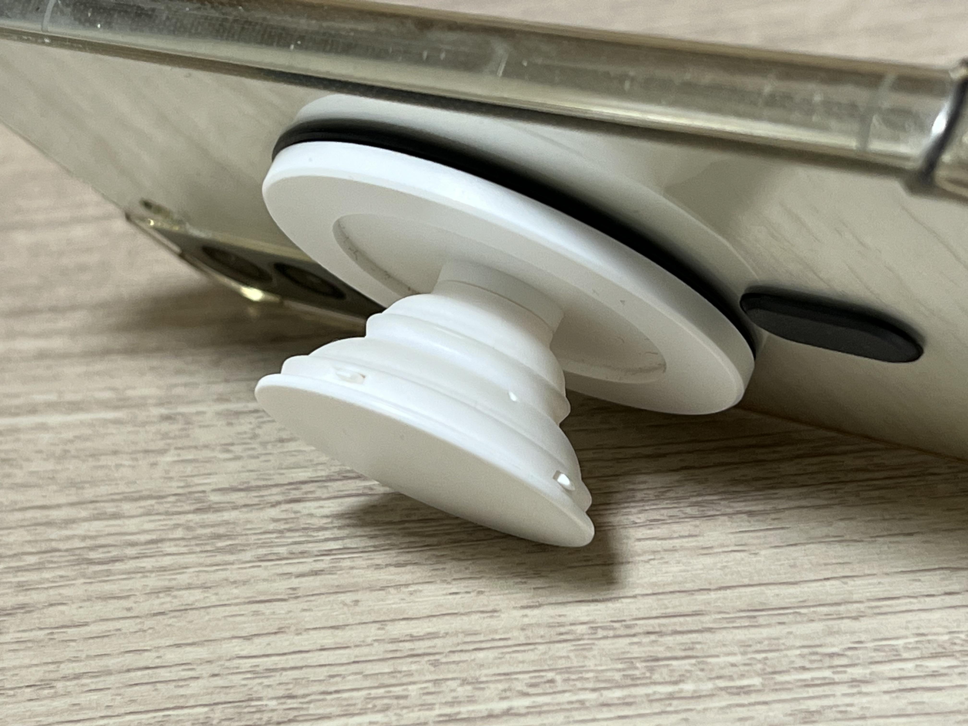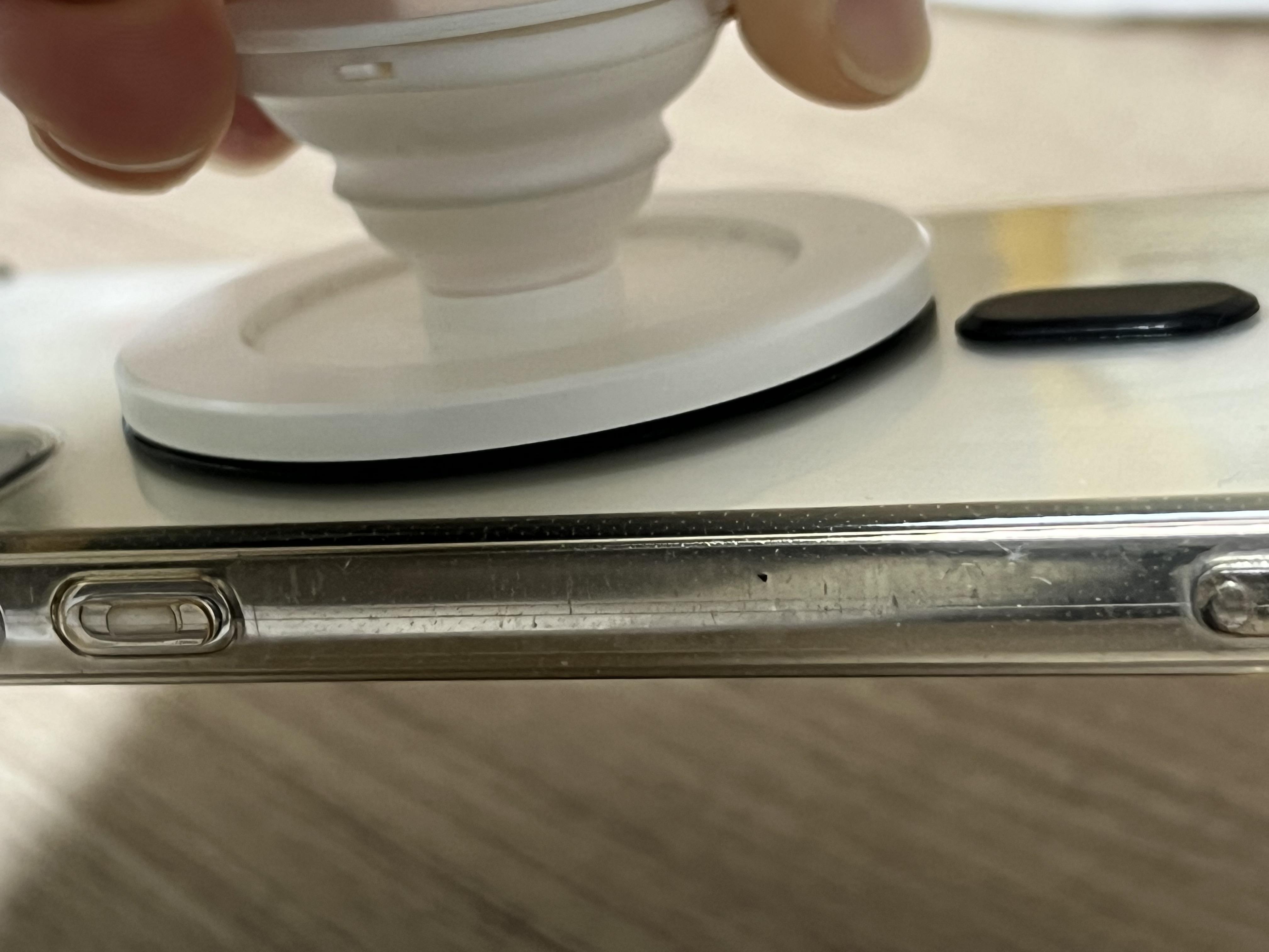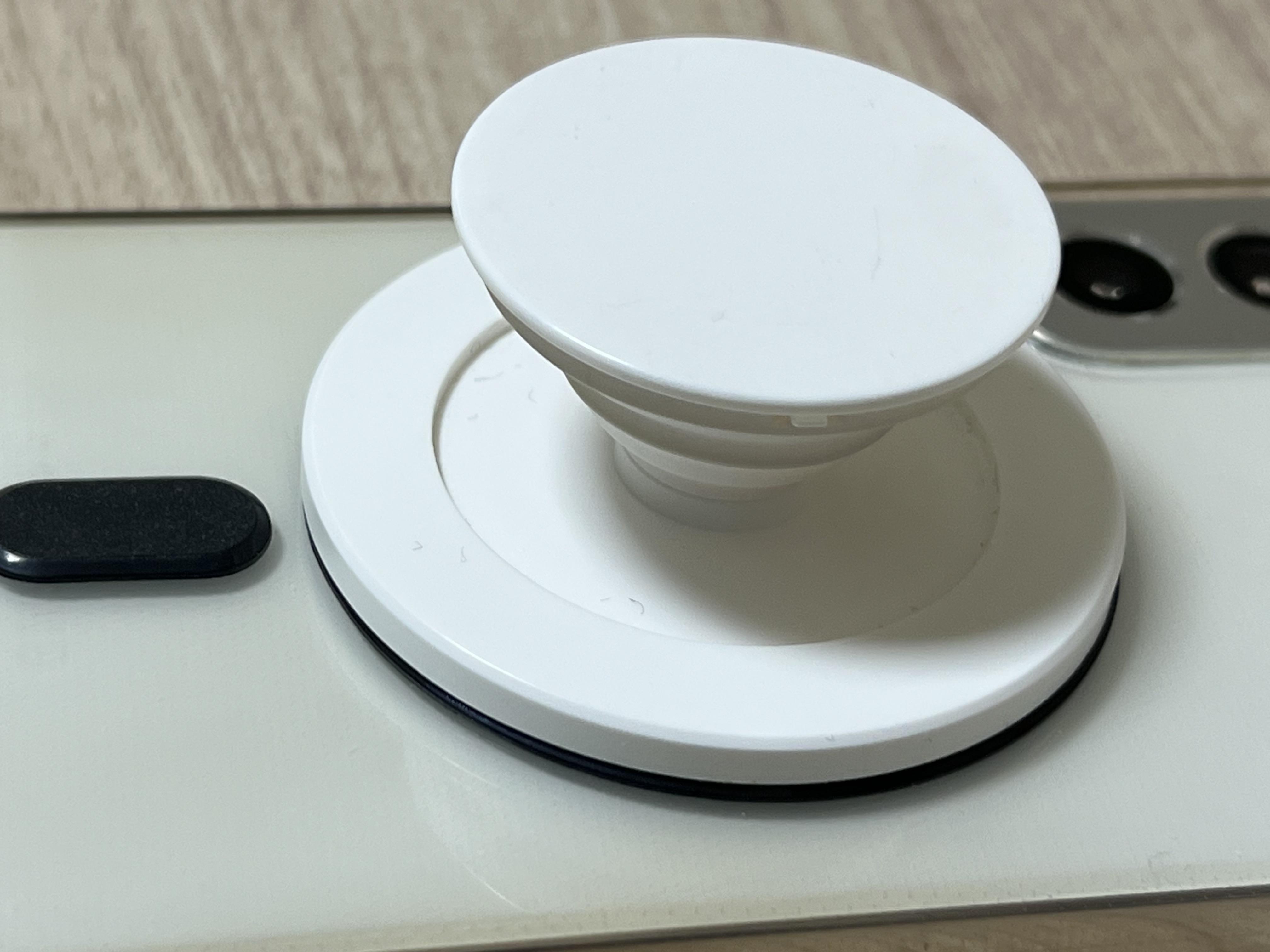 10분 정도 원을 그리며 손가락으로 꾹꾹 눌러 접착면이 케이스에 잘 달라 붙게 했습니다. 떨리는 마음으로 다이소에서 판매하는 3천원 짜리 마그네틱 그립톡을 붙여 봤습니다. 똭! 소리와 함께 강력하게 달라 붙어 줍니다. 타원형은 왜 붙였냐고요? 그립톡으로는 사용하지 않지만 무선충전 보조배터리 등에서는 저게 있어야 배터리가 돌아가지 않습니다.