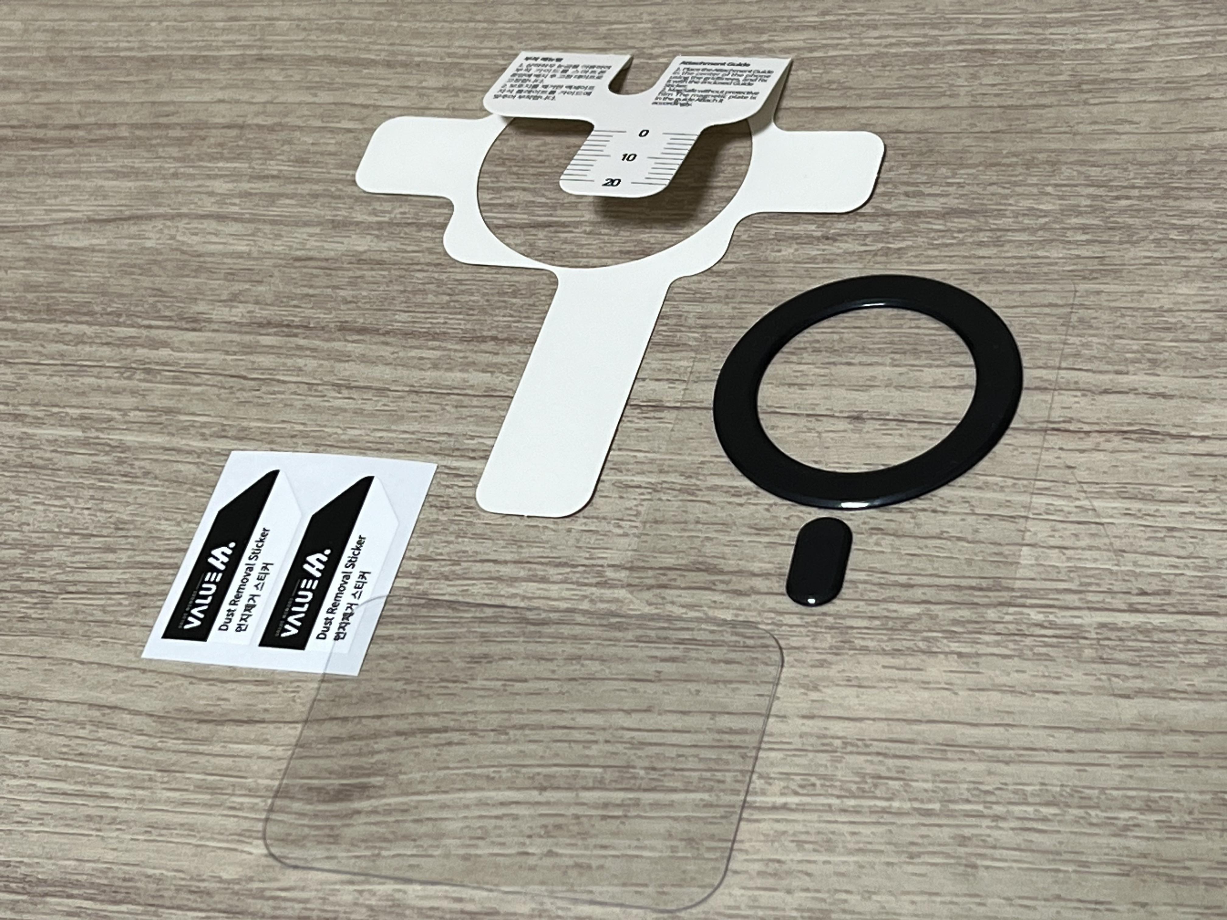 VALUE M 맥세이프 마그넷 플레이트는 위와 같은 구성품으로 되어 있습니다. 가장 오른쪽에 원형과 그 아래 타원형 스티커 형태의 자석이 주요 제품이고, 종이로 된 스마트폰 위치 잡아 주는 가이드, 먼지제거용 스티커 2개, 마그네틱 플레이트의 접착력을 높여주는 투명재질의 스티커가 들어 있습니다.