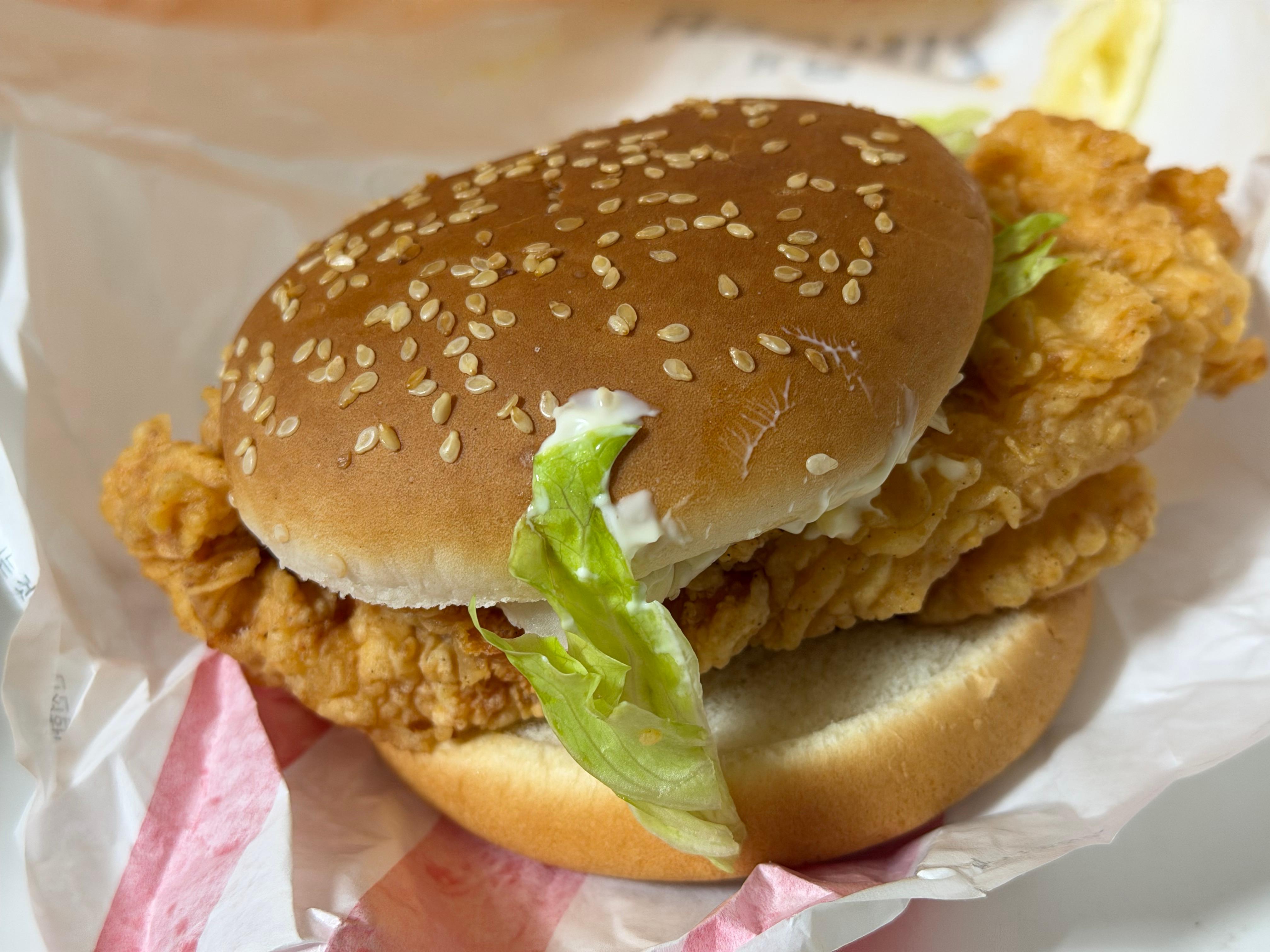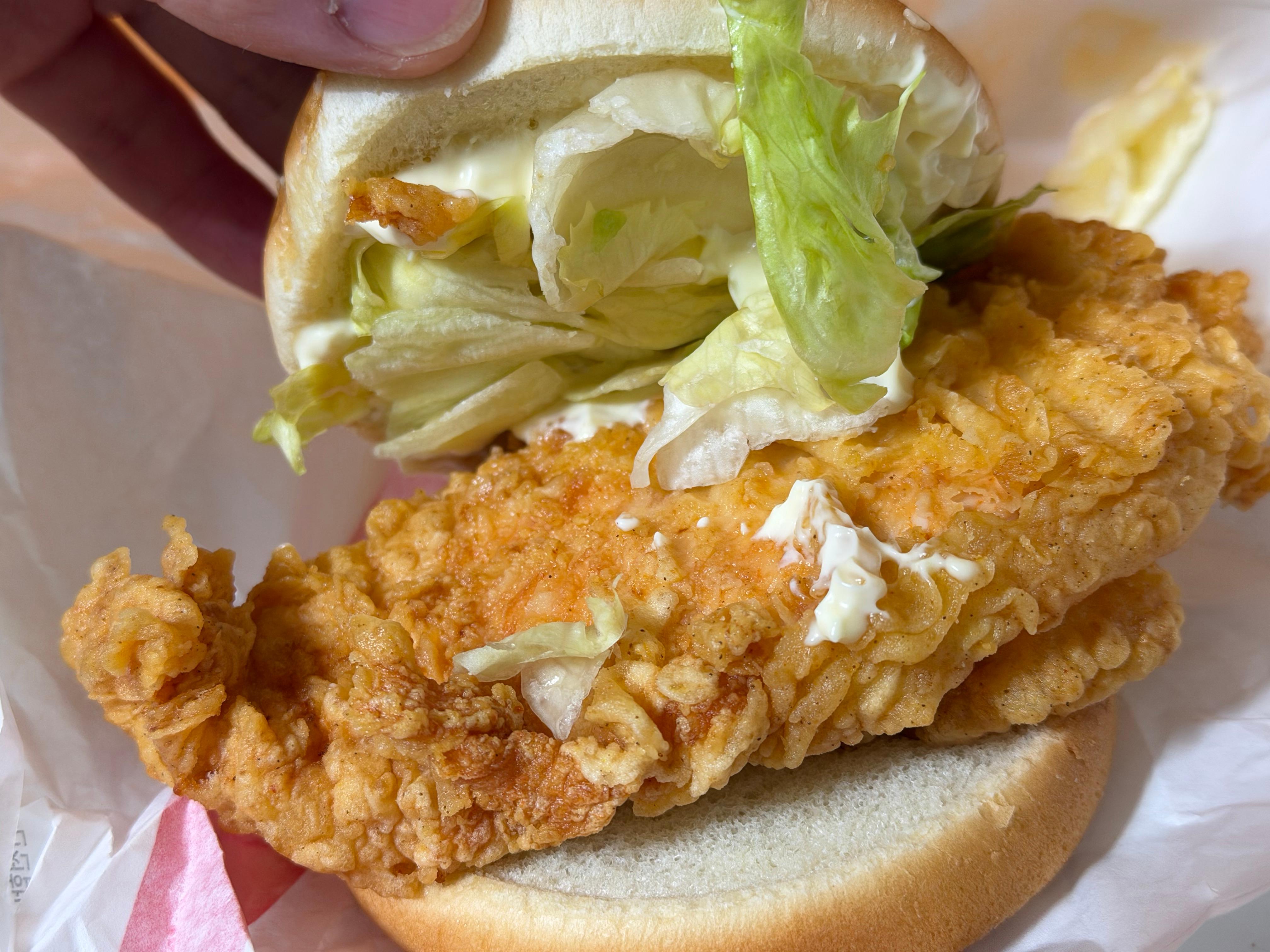 그냥 번입니다. 아무런 소스도, 야채도 없이 그냥 맨빵입니다. 맨빵에 치킨 한 덩어리 넣고 양상추 두어 장 잘라 넣은 뒤에 허연 소스 뿌려 준 거, 그게 전부입니다. 아무리 저렴한 햄버거라고 하더라도 이건 아니죠. 심지어 번은 그냥 생빵인 건지 전혀 익었다는 느낌도 주지 않습니다. 정말 번이 깨애끗합니다. 누가 보면 냉동 번 그냥 꺼내서 전자렌지에 돌려 놓은 건 줄 알겠습니다.